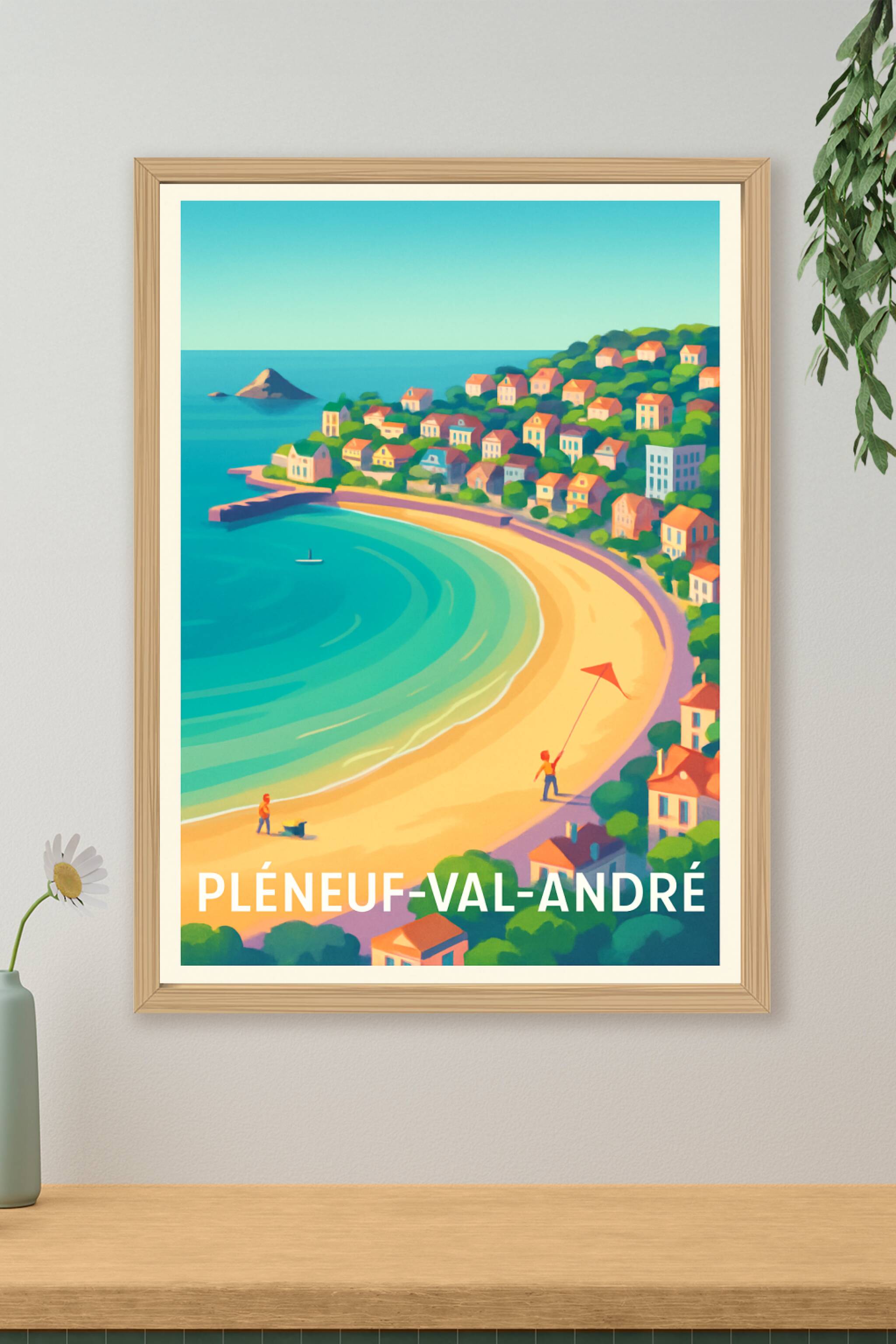 Découvrez la magie du littoral breton avec cette affiche illustrée toute en couleurs douces, mettant à l'honneur la baie de Pléneuf-Val-André. Ce p...
