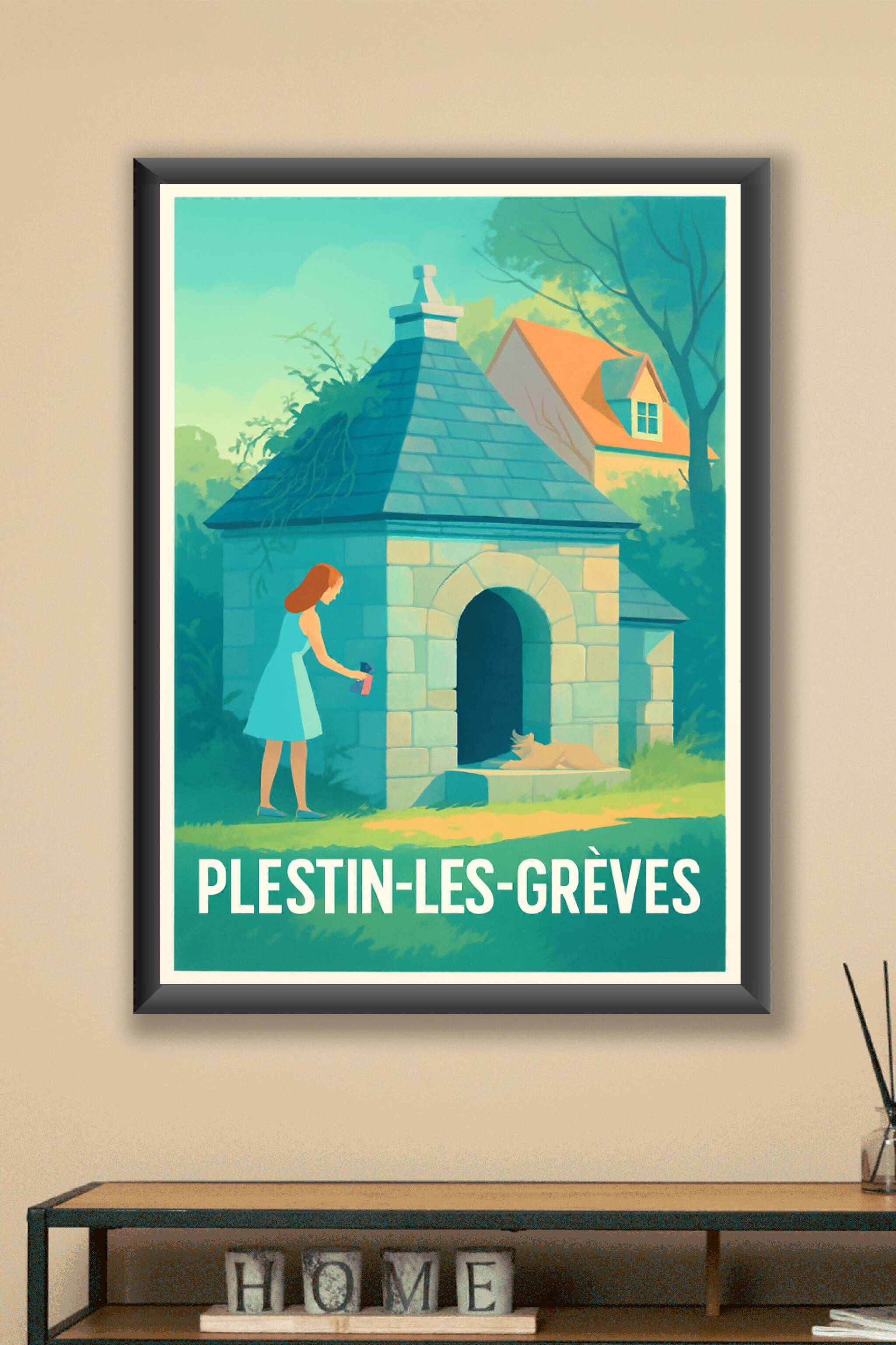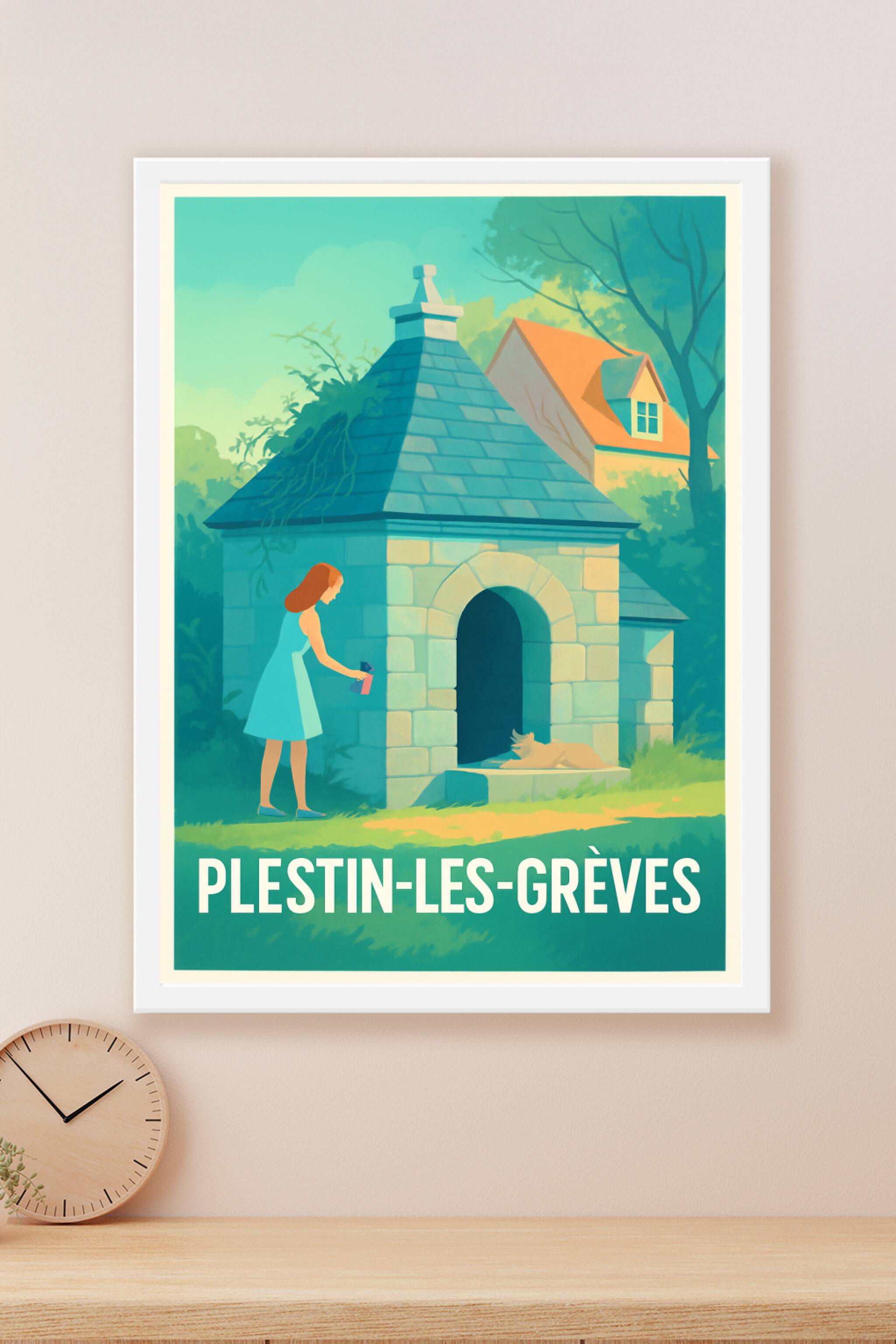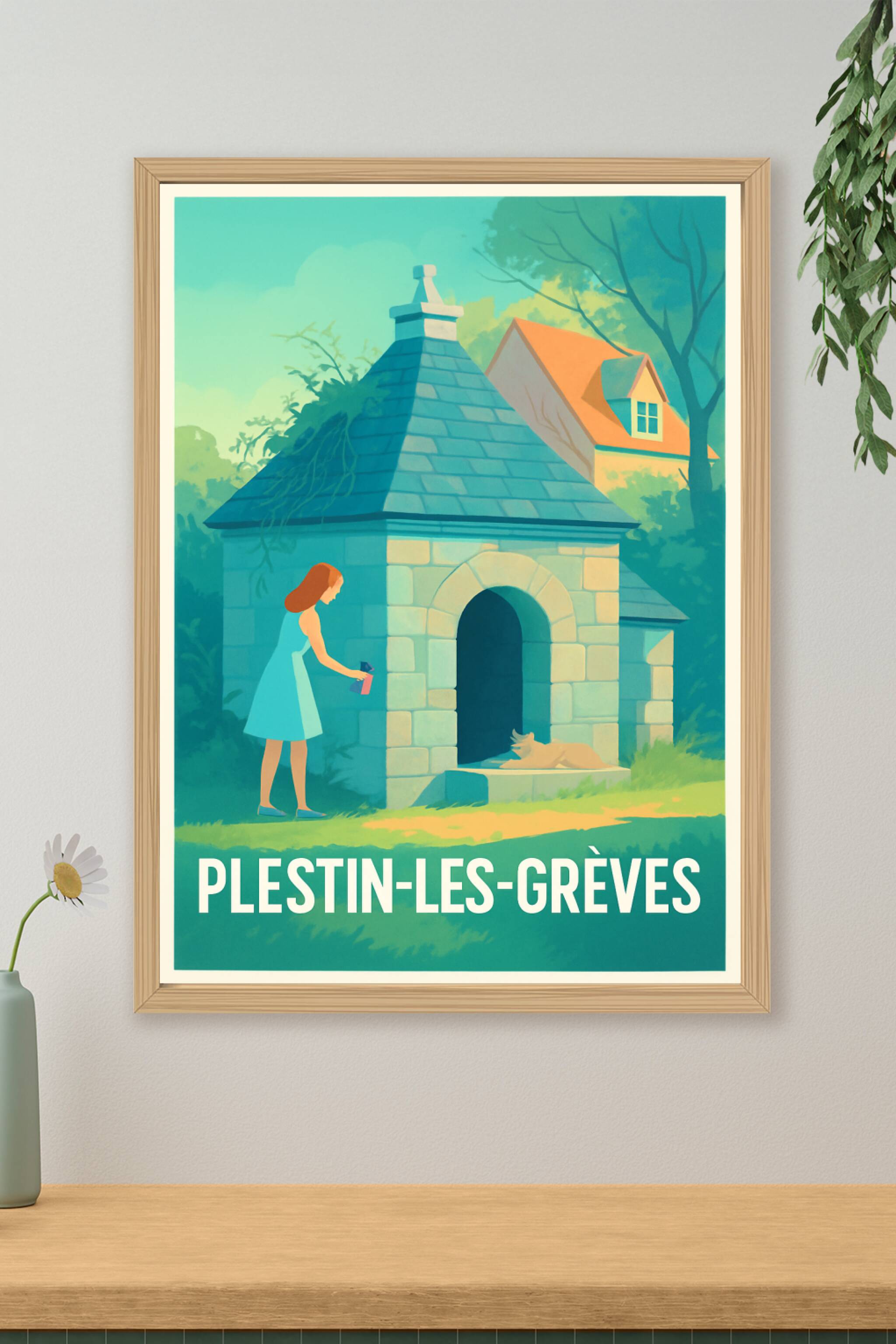 Découvrez la douceur et le charme paisible de Plestin-les-Grèves avec cette affiche illustrée mettant en scène une scène bucolique typique de la Br...