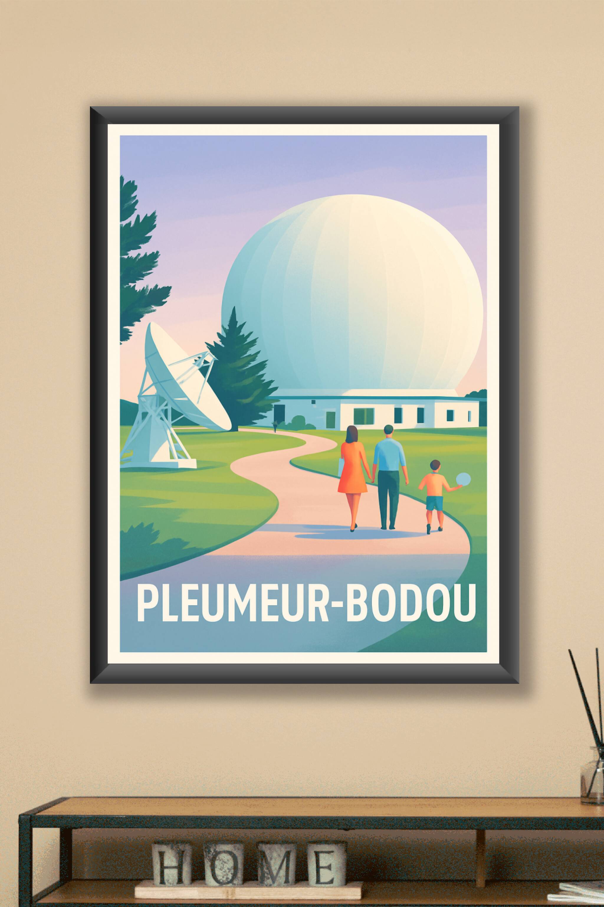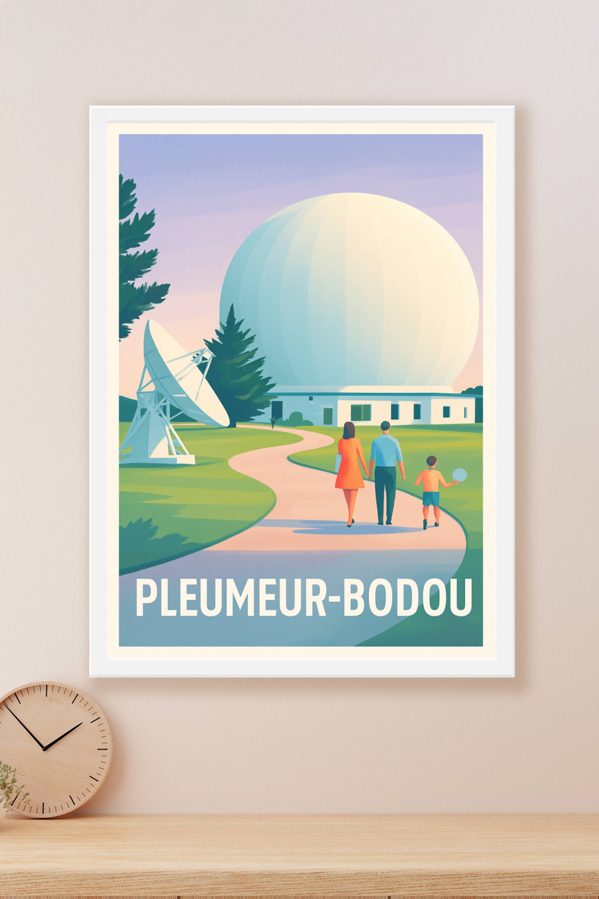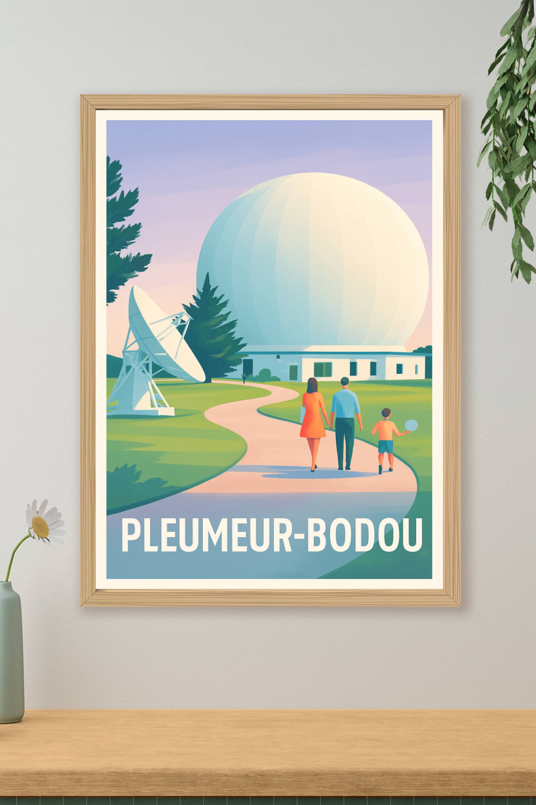 Découvrez l'ambiance paisible et futuriste de Pleumeur-Bodou à travers cette affiche illustrée, mettant en scène le célèbre radôme et ses installat...