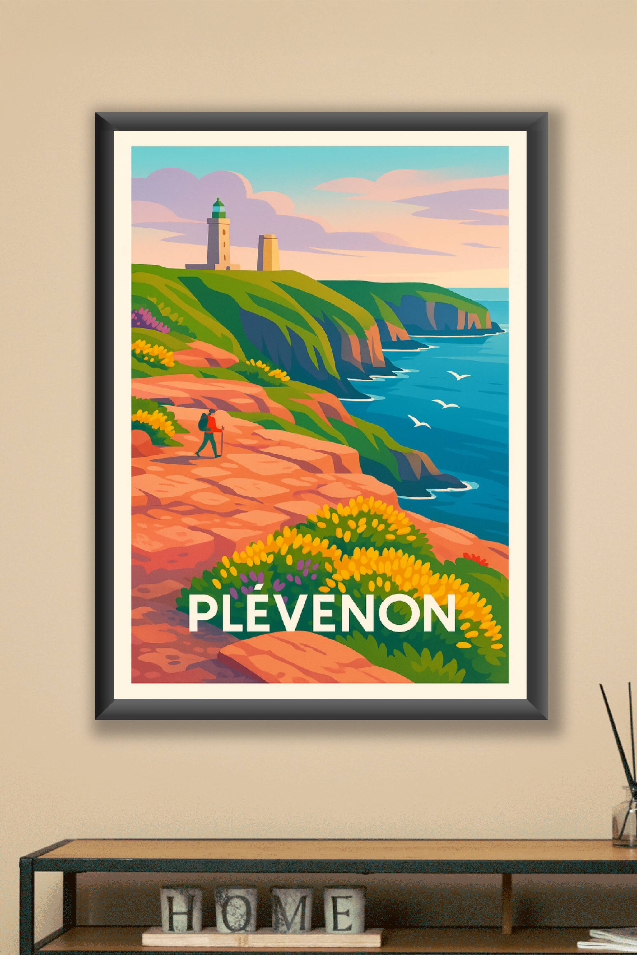 Découvrez la beauté sauvage des falaises de Plévenon à travers cette affiche à l'ambiance paisible et colorée. Cette illustration évoque les sentie...