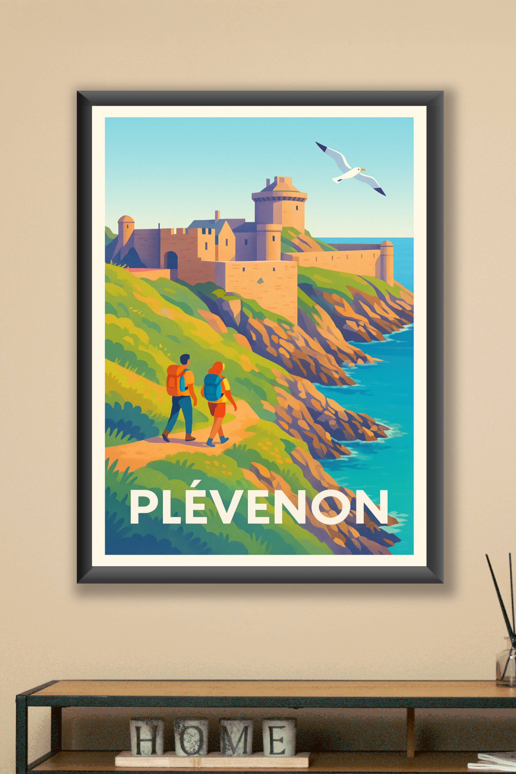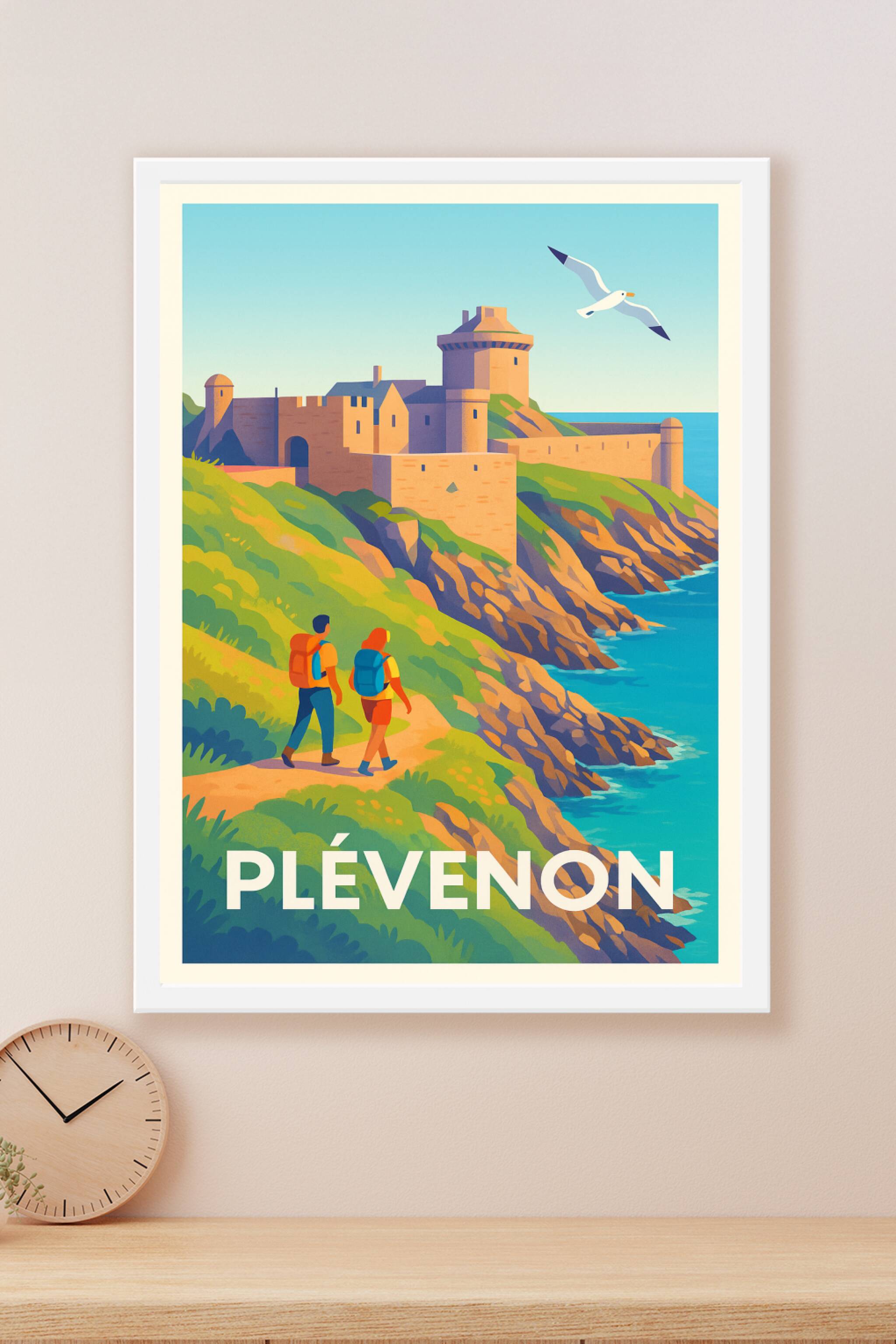 Découvrez la beauté sauvage et l'atmosphère apaisante de Plévenon avec cette affiche illustrée qui met en valeur ses falaises escarpées, son fort h...