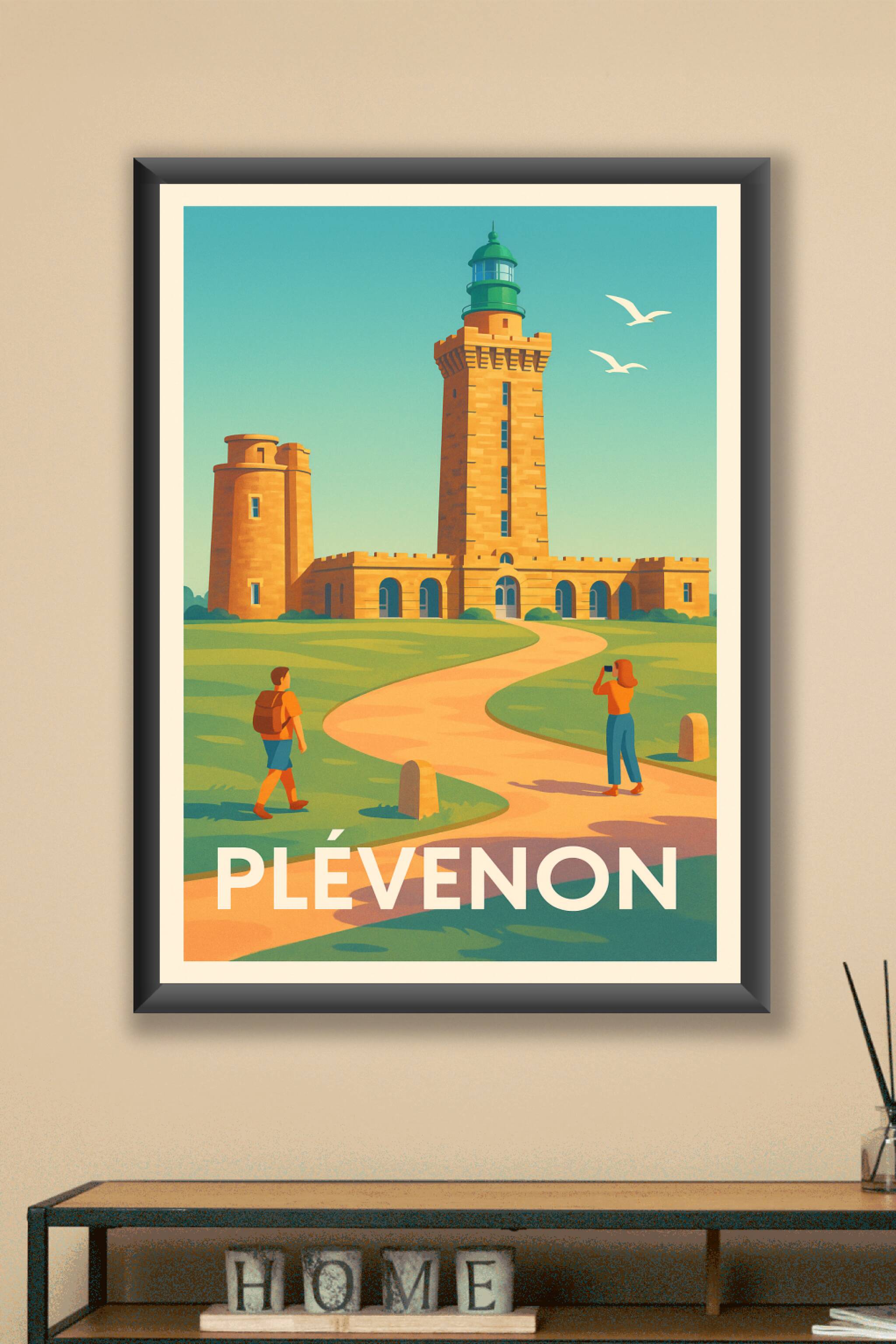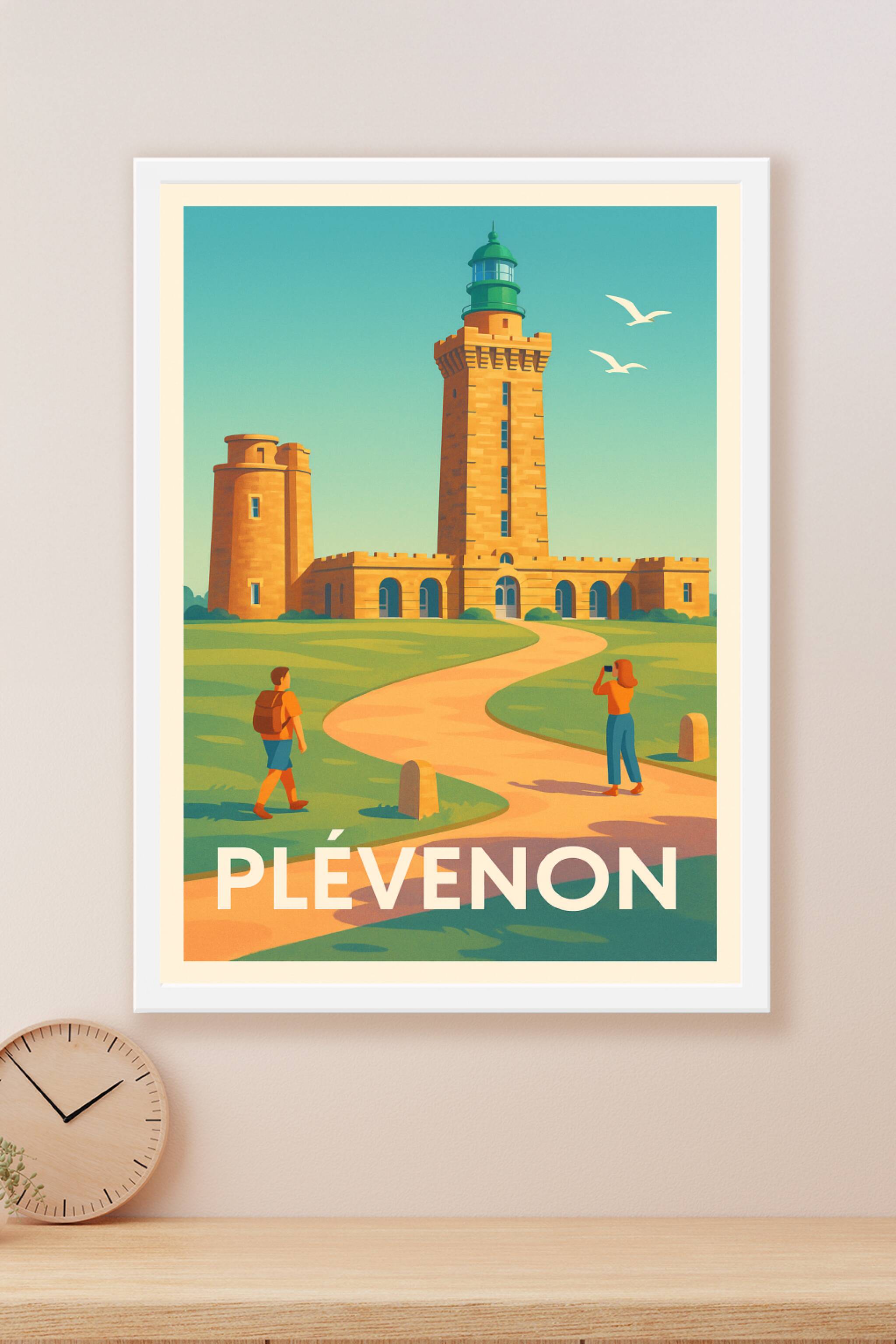 Embarquez pour une escapade visuelle à Plévenon avec cette affiche illustrée qui met en lumière le célèbre phare de la région, symbole d'aventure e...