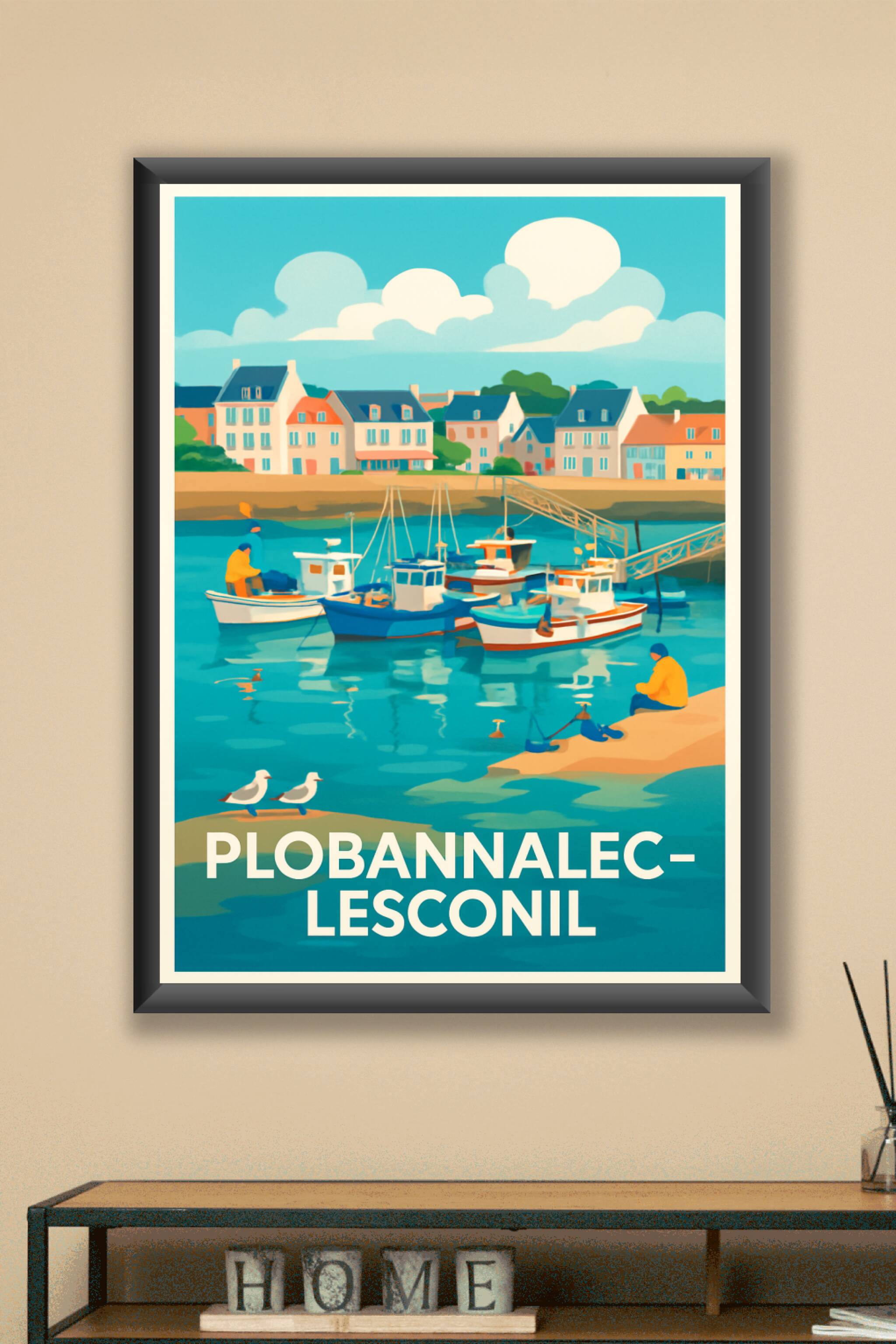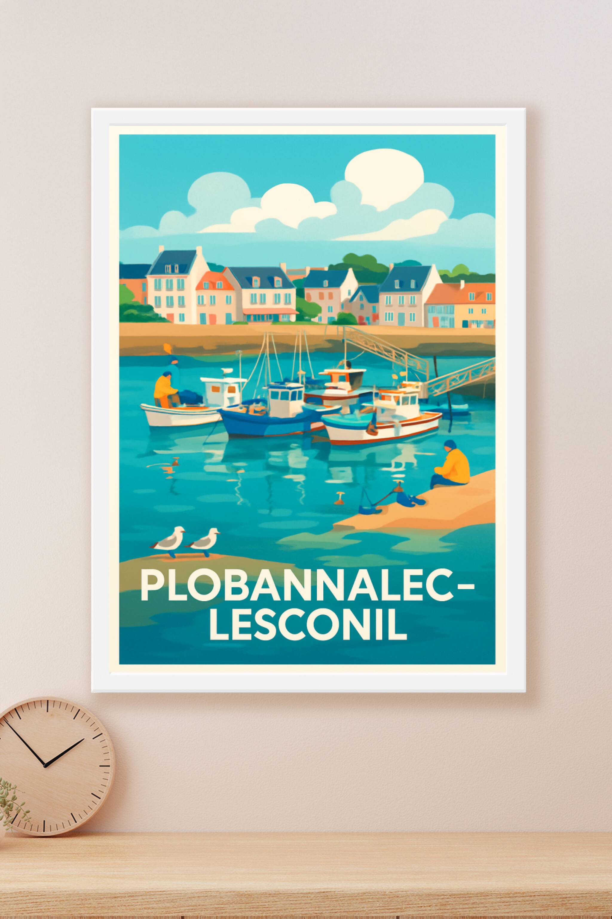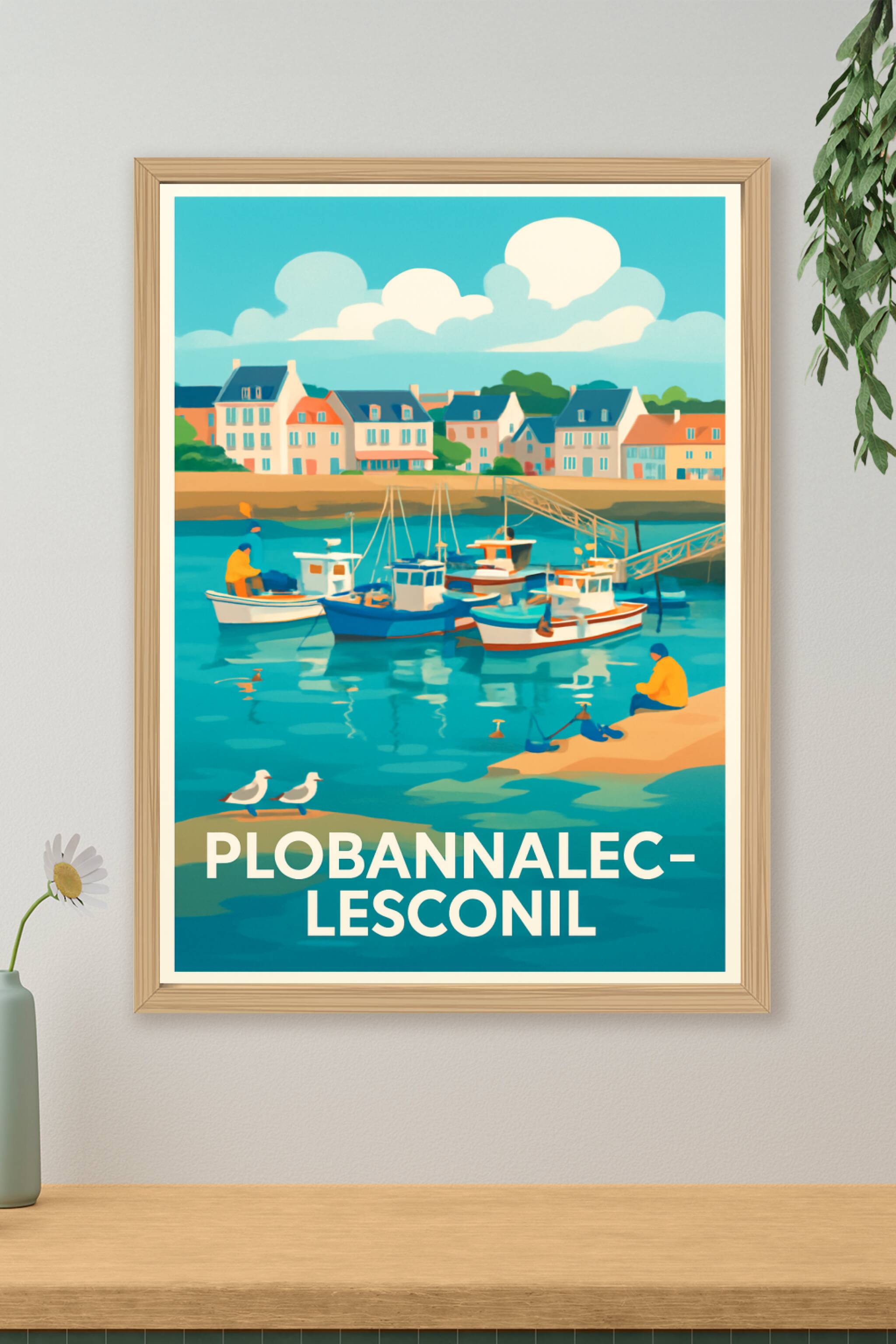 Découvrez l'atmosphère paisible et authentique de Plobannalec-Lesconil avec cette affiche illustrée aux couleurs vives et douces, représentant les ...