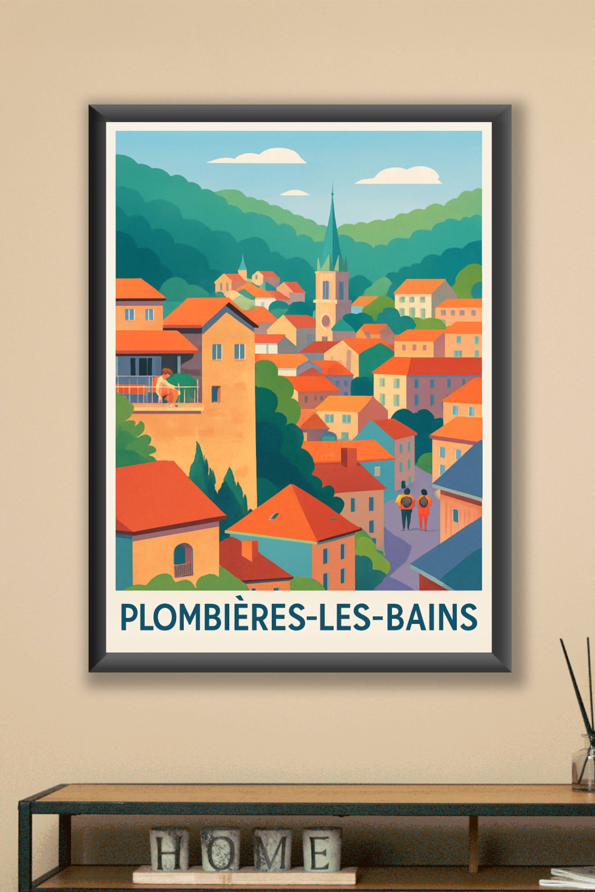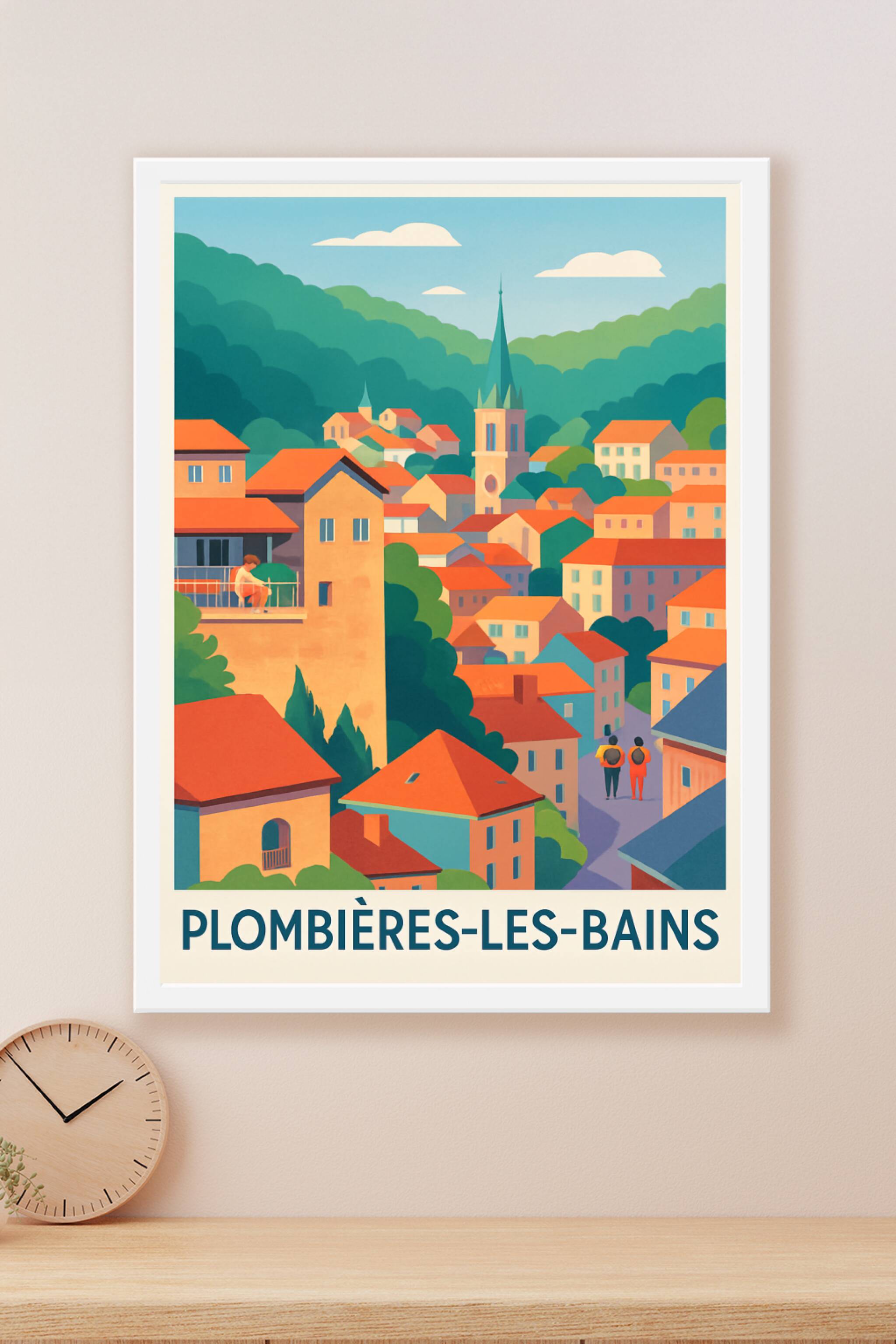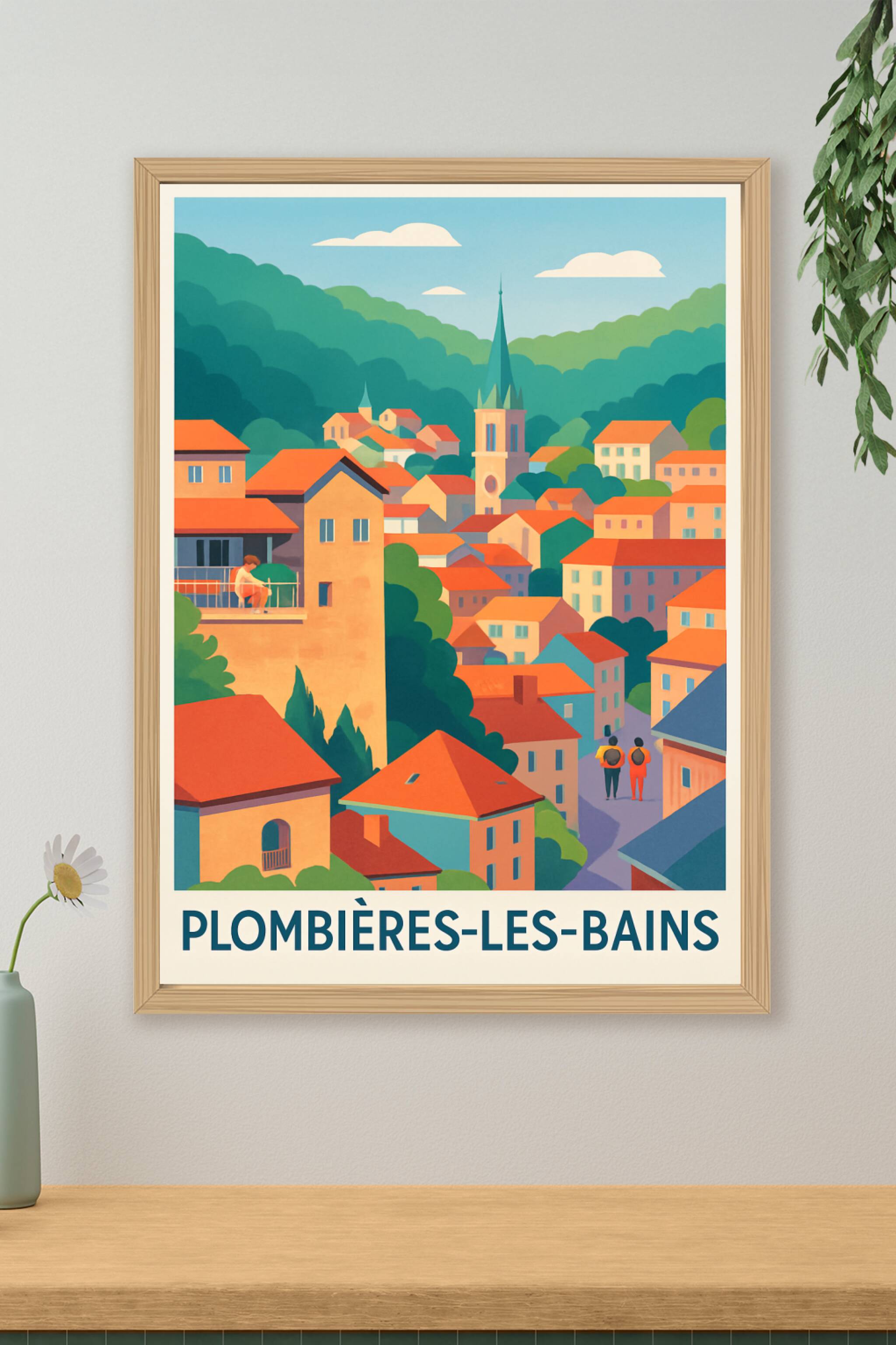 Découvrez l'élégance paisible de Plombières-les-Bains avec cette affiche illustrée mettant en valeur le charme authentique de la ville et ses toits...