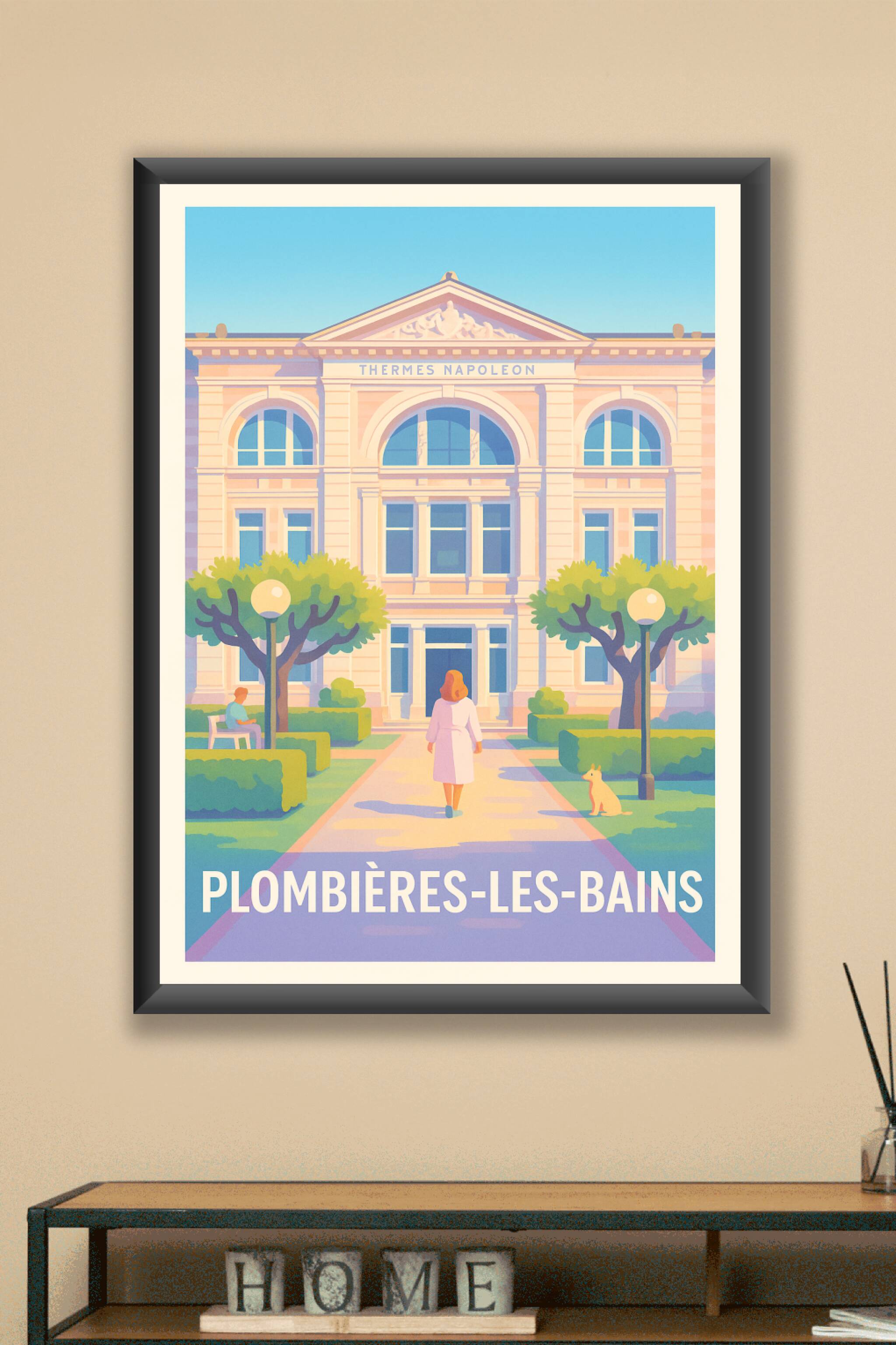 Découvrez la quiétude et le charme architectural de Plombières-les-Bains à travers cette superbe affiche illustrée mettant en lumière les Thermes Napoléon. Ce poster capture avec douceur et précision l'entrée majestueuse de cet établissement historique, entouré d'un jardin verdoyant sous un ciel clair.Ce poster est imprimé en tirage "Fine Art" sur un papier de qualité 305g coton, assurant une reproduction fidèle et éclatante des couleurs. Disponible en formats A1 à A4, avec ou sans cadre, cette affiche s’intègre parfaitement à tout intérieur à la recherche d’une touche vintage et apaisante.Profitez d’une impression premium 100% fabriquée en France pour offrir à votre décoration une ambiance thermale et élégante, ou pour faire un cadeau raffiné aux amoureux de Plombières-les-Bains.