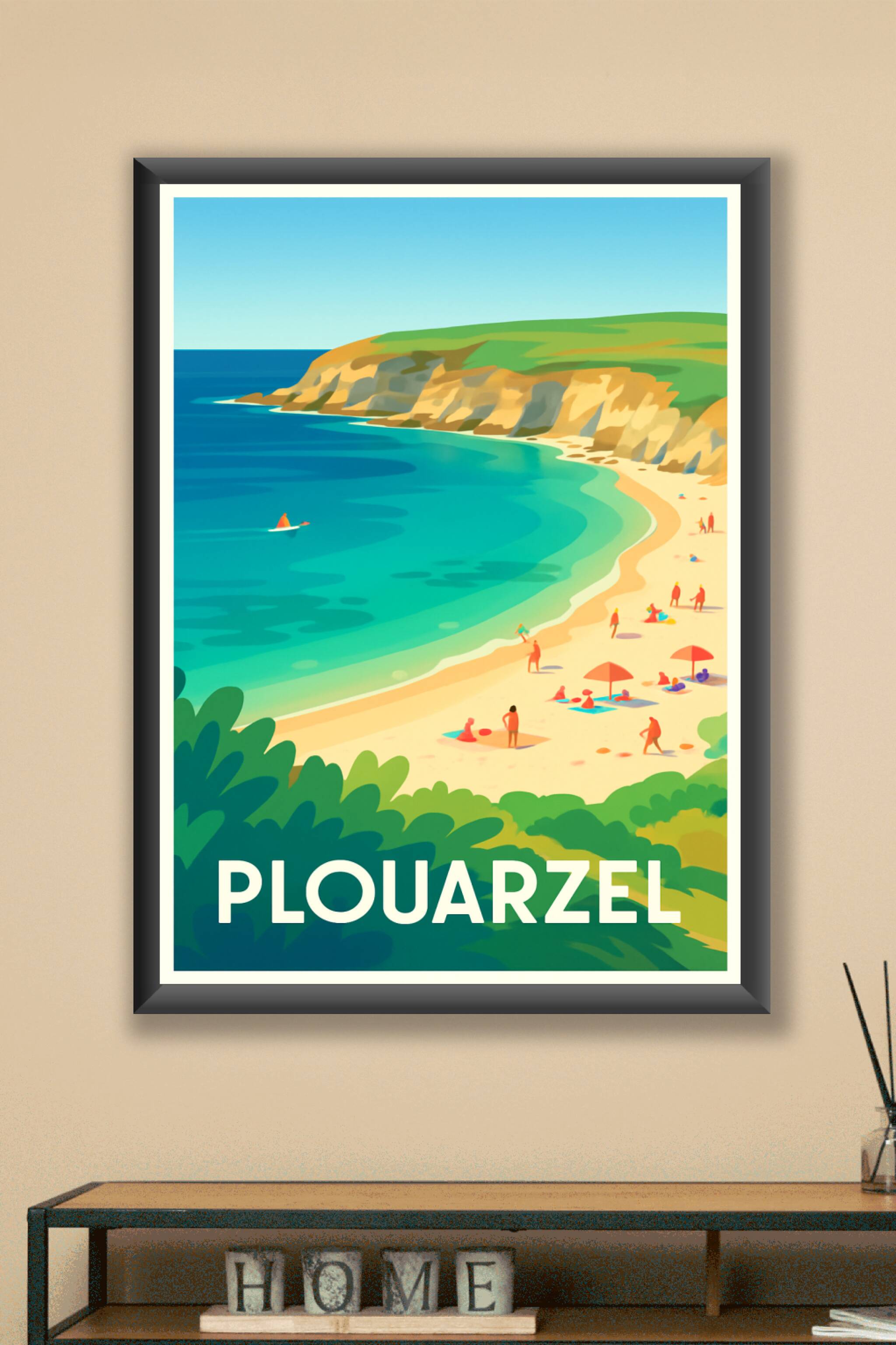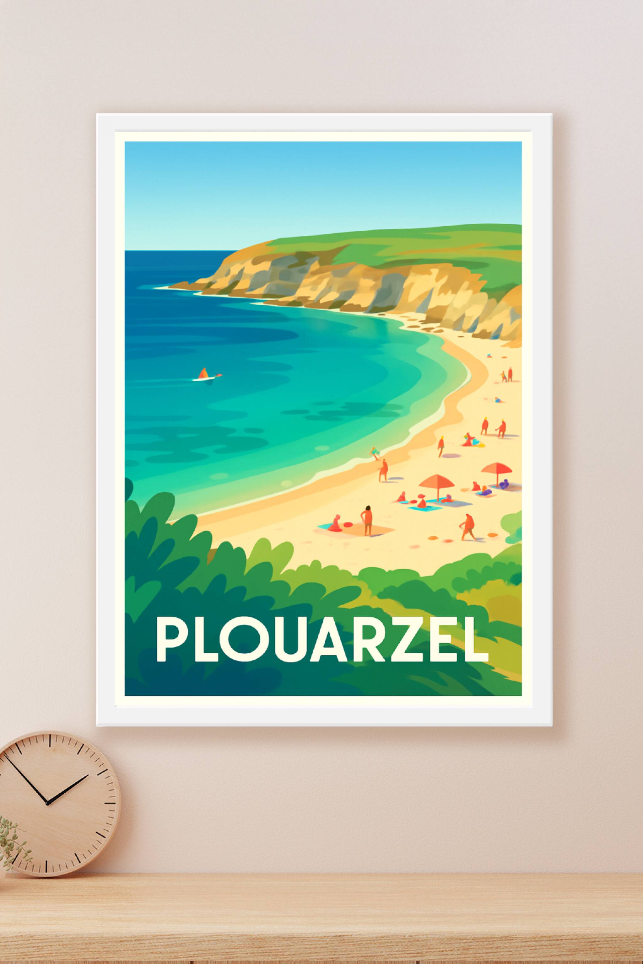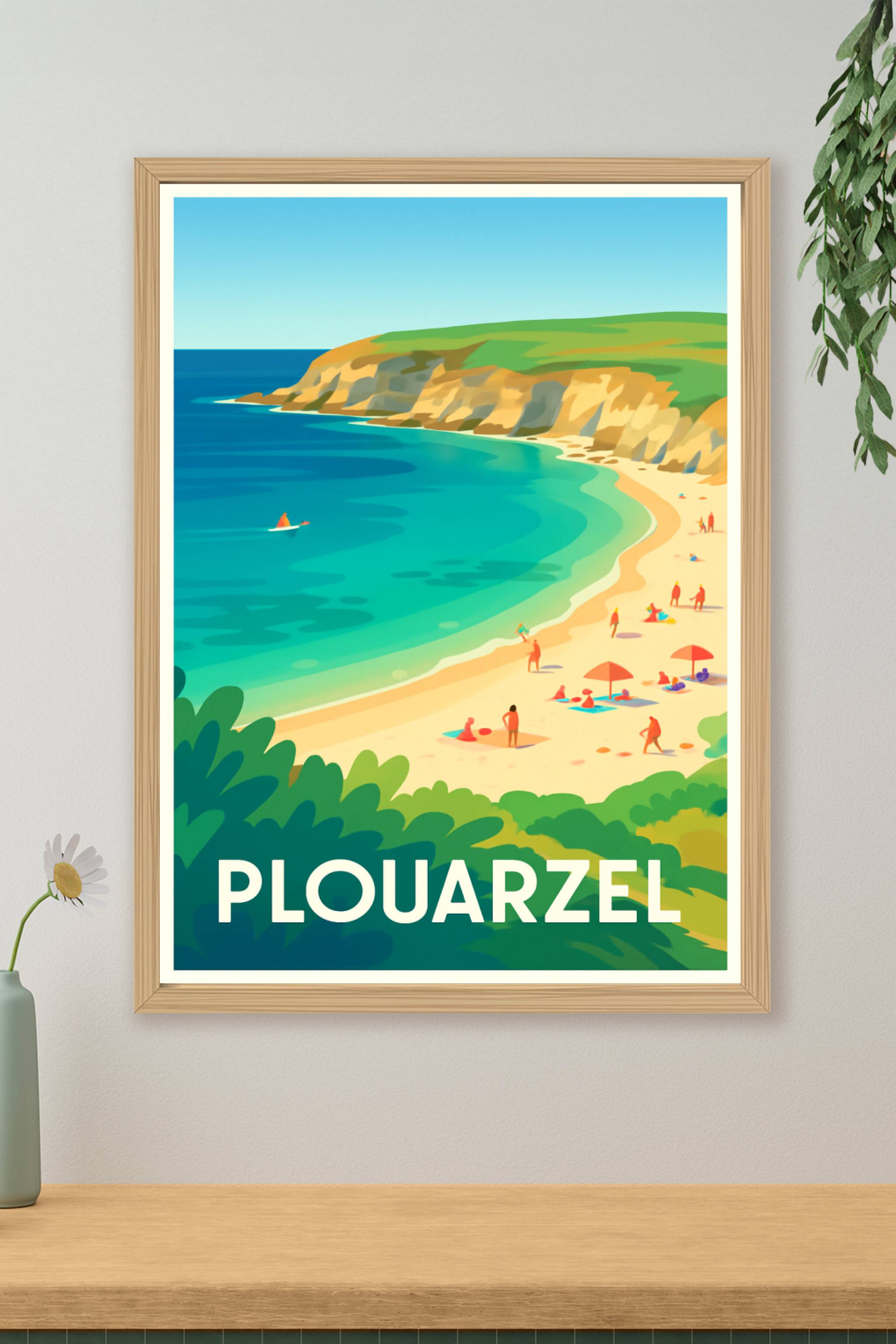 Découvrez la beauté sauvage et apaisante de Plouarzel avec cette affiche stylisée mettant en scène ses falaises dorées et son eau turquoise éclatan...