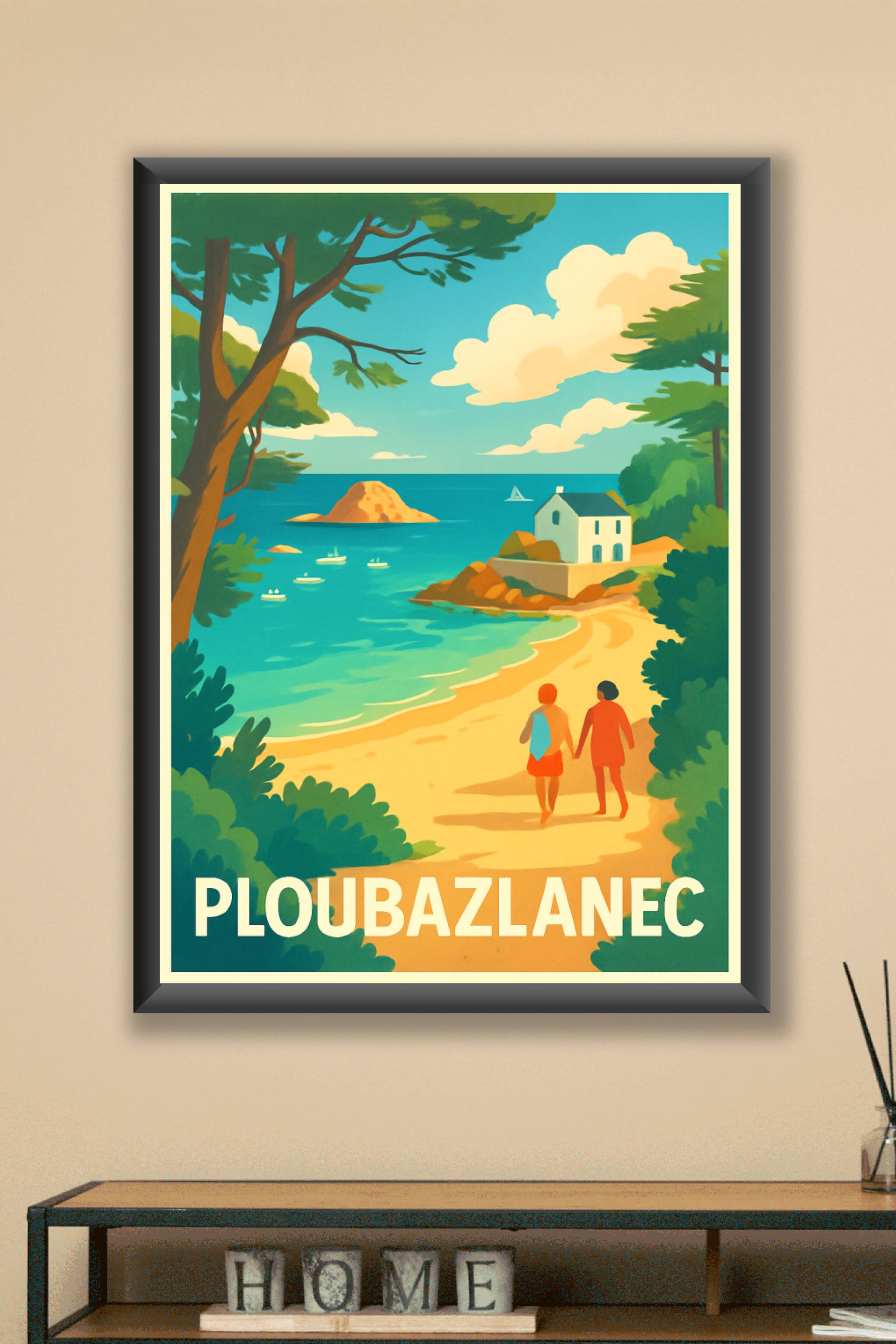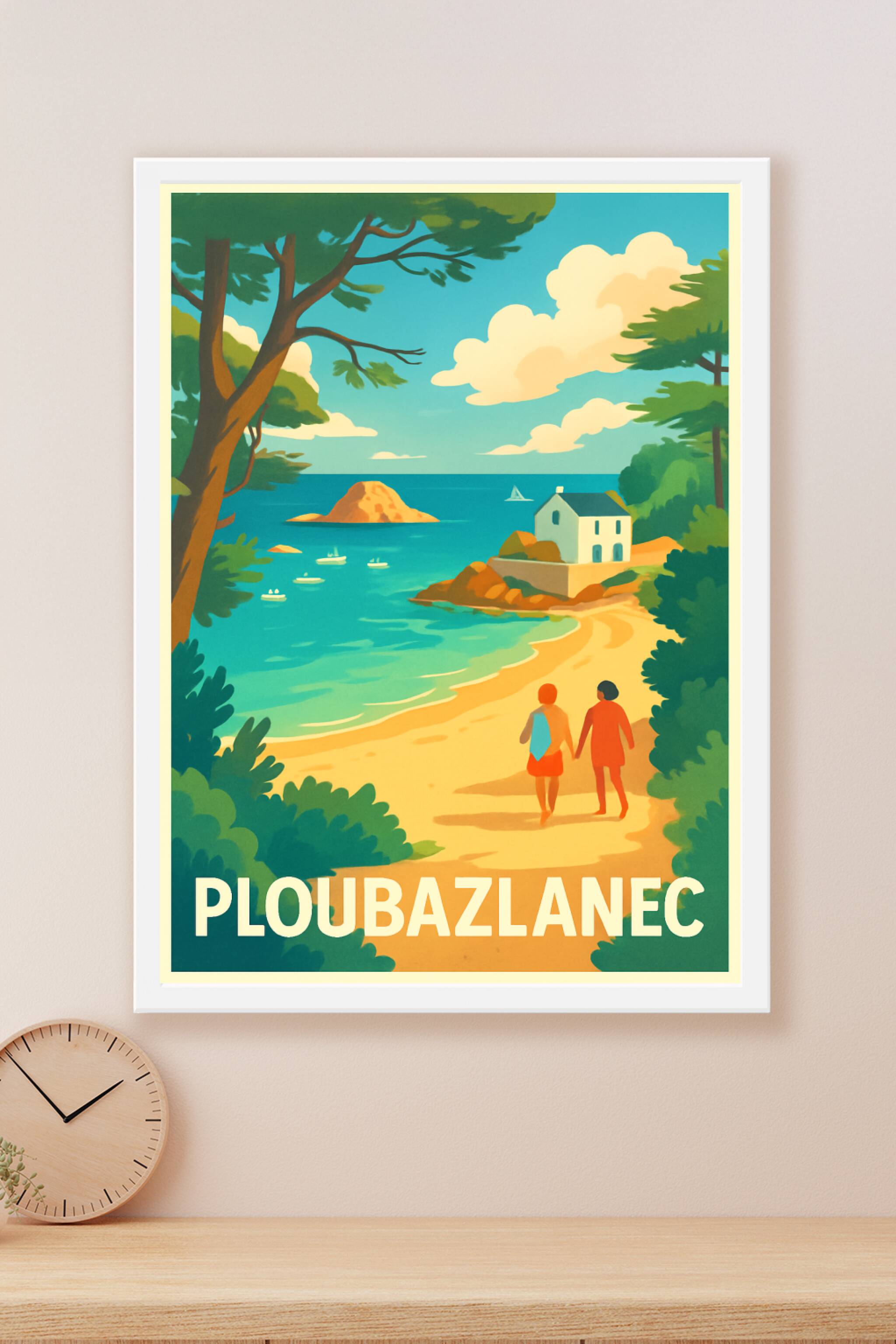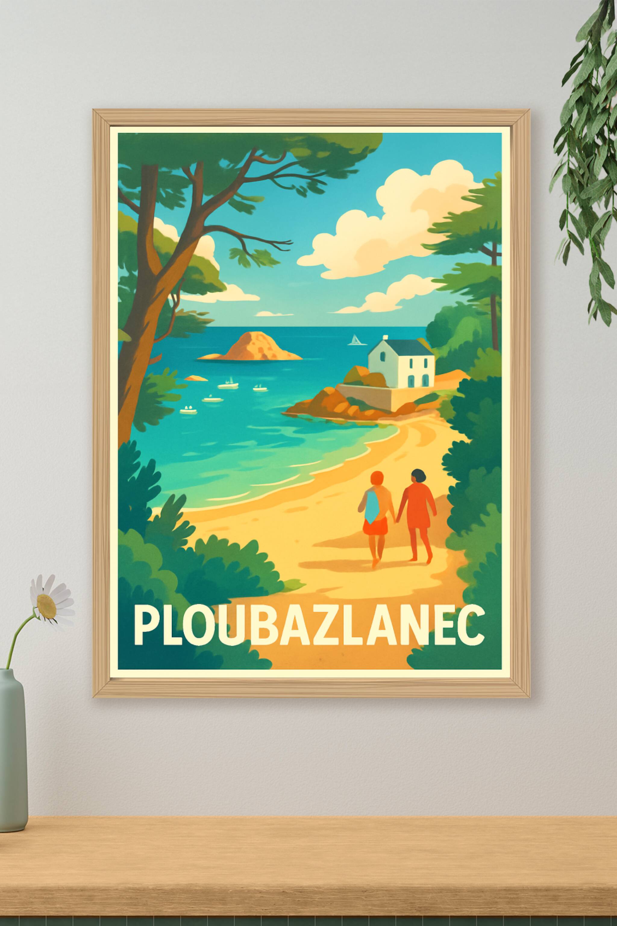 Découvrez la magie de Ploubazlanec à travers cette affiche au style vintage plein de charme qui capture une paisible balade en bord de mer. L'océan...