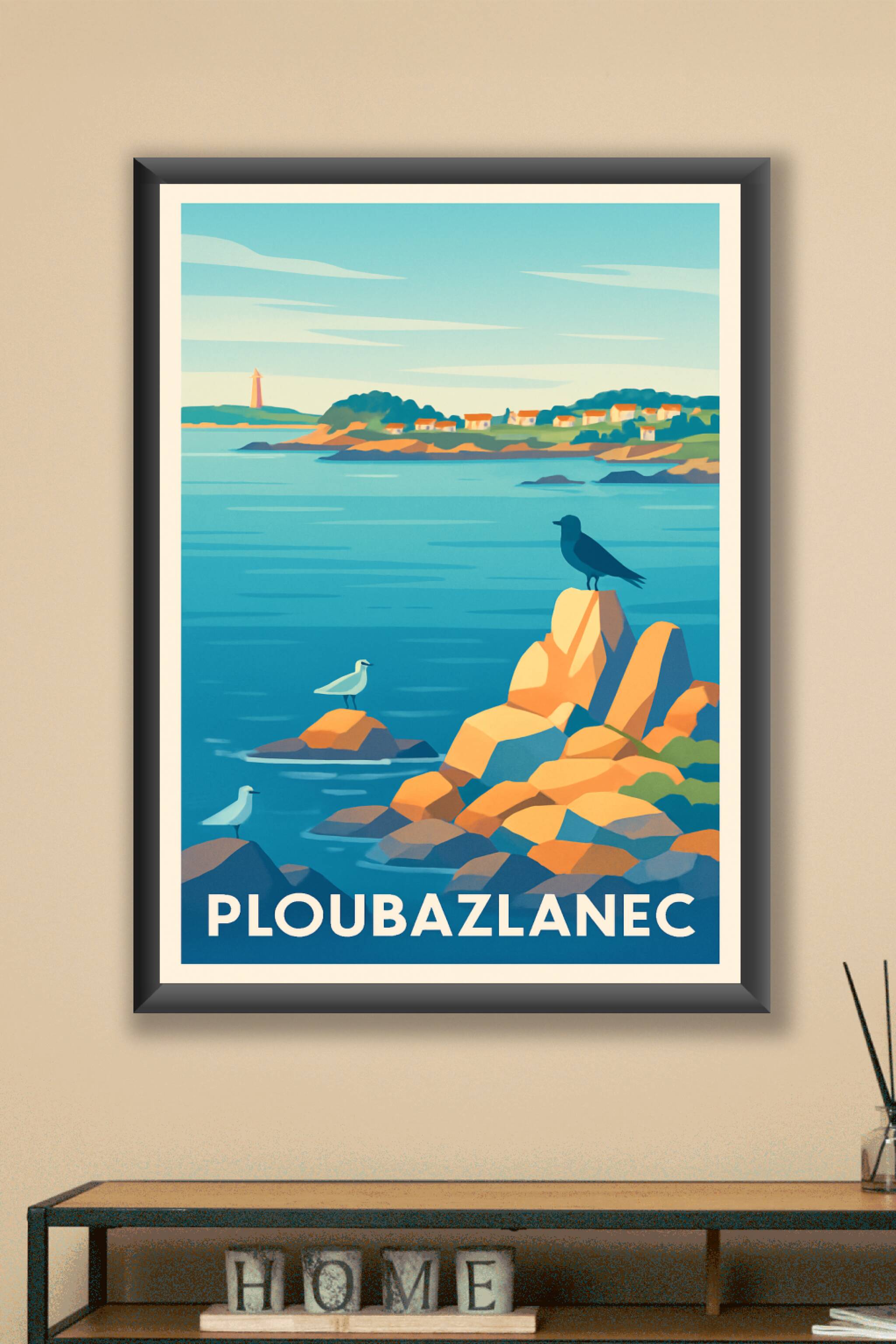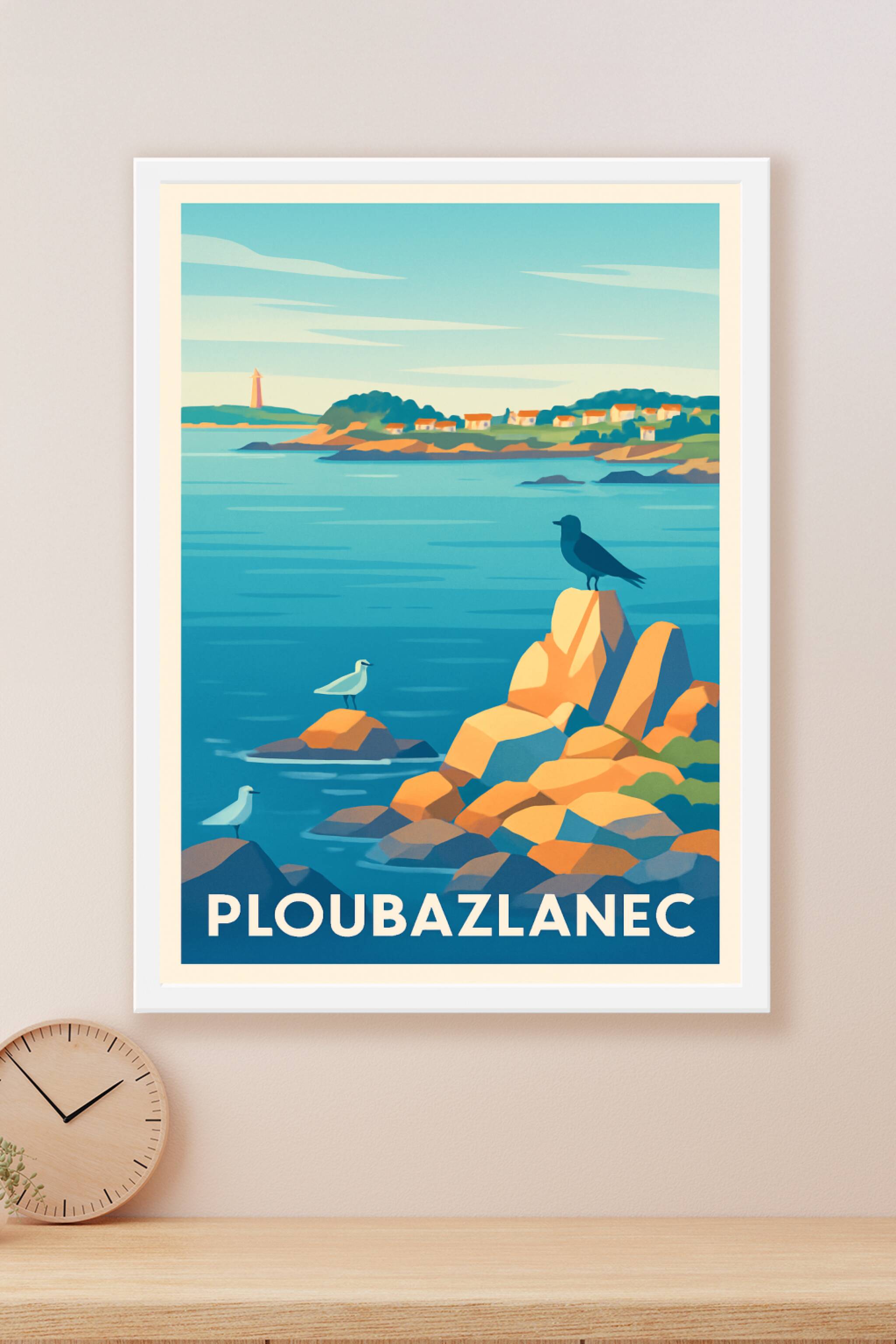 Découvrez la douceur de vivre bretonne avec cette affiche illustrée de Ploubazlanec, où la mer paisible et les maisons pittoresques se laissent adm...