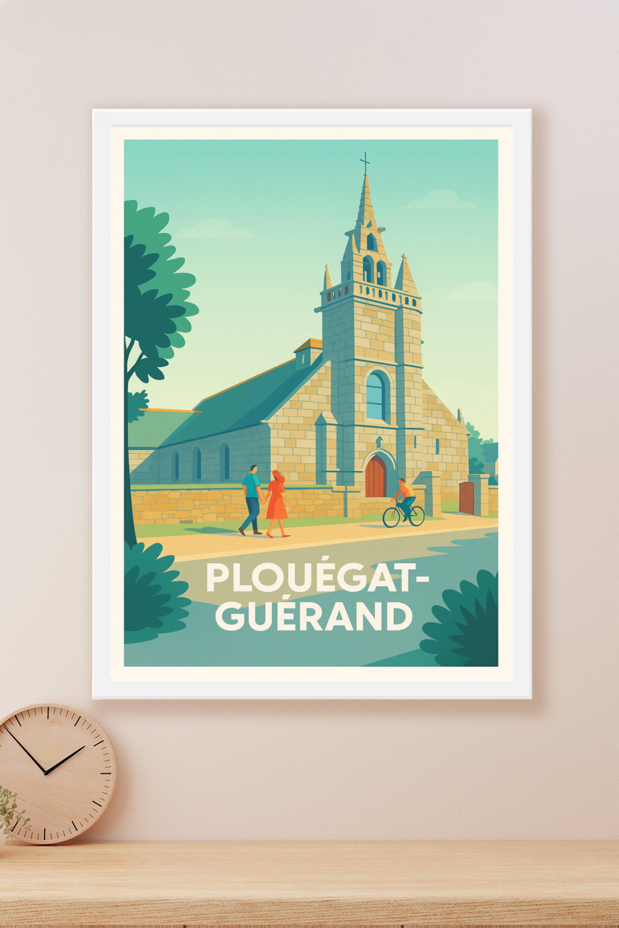 Apportez une touche authentique et paisible à votre décoration avec ce poster illustré représentant l'église emblématique de Plouégat-Guérand. Cett...