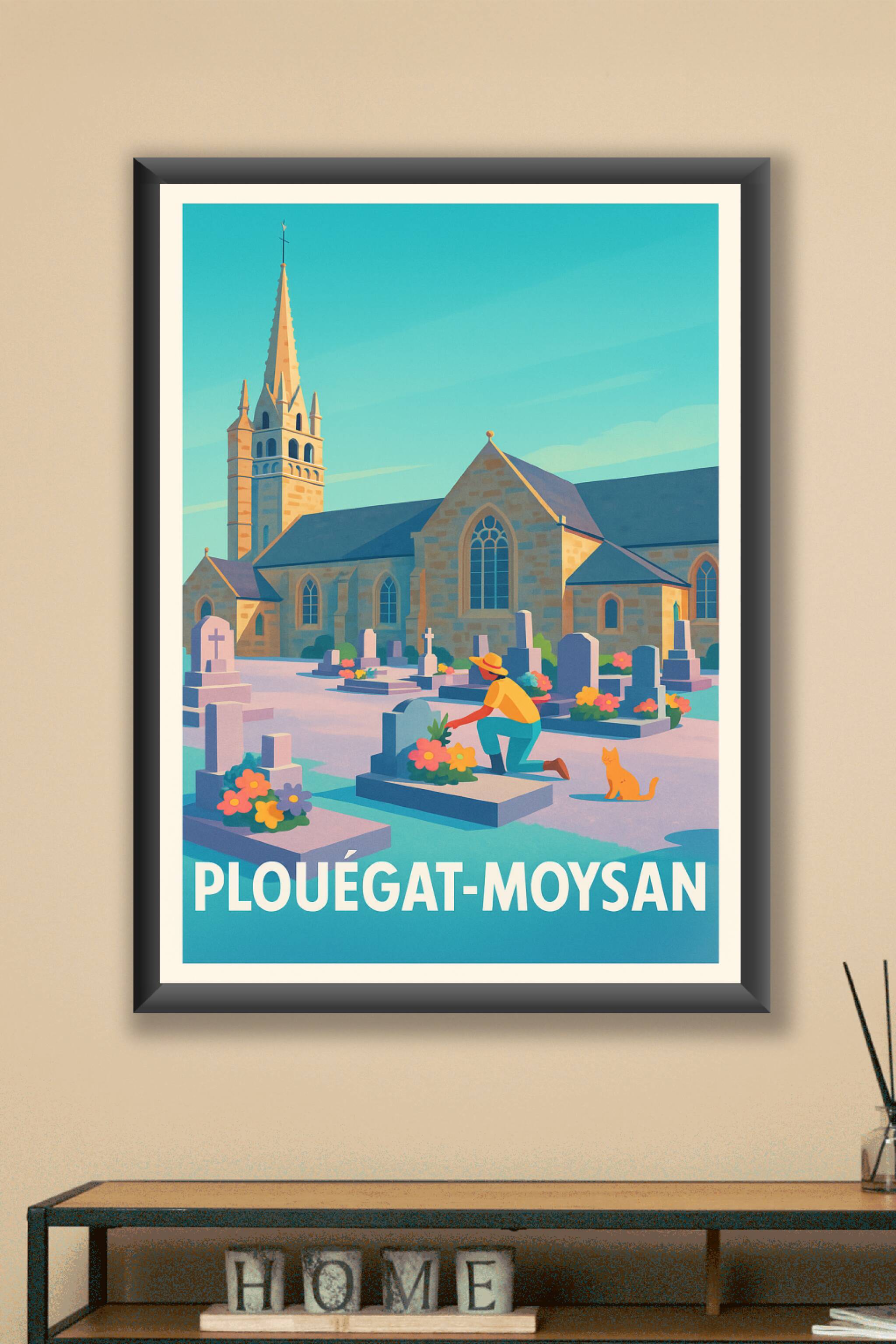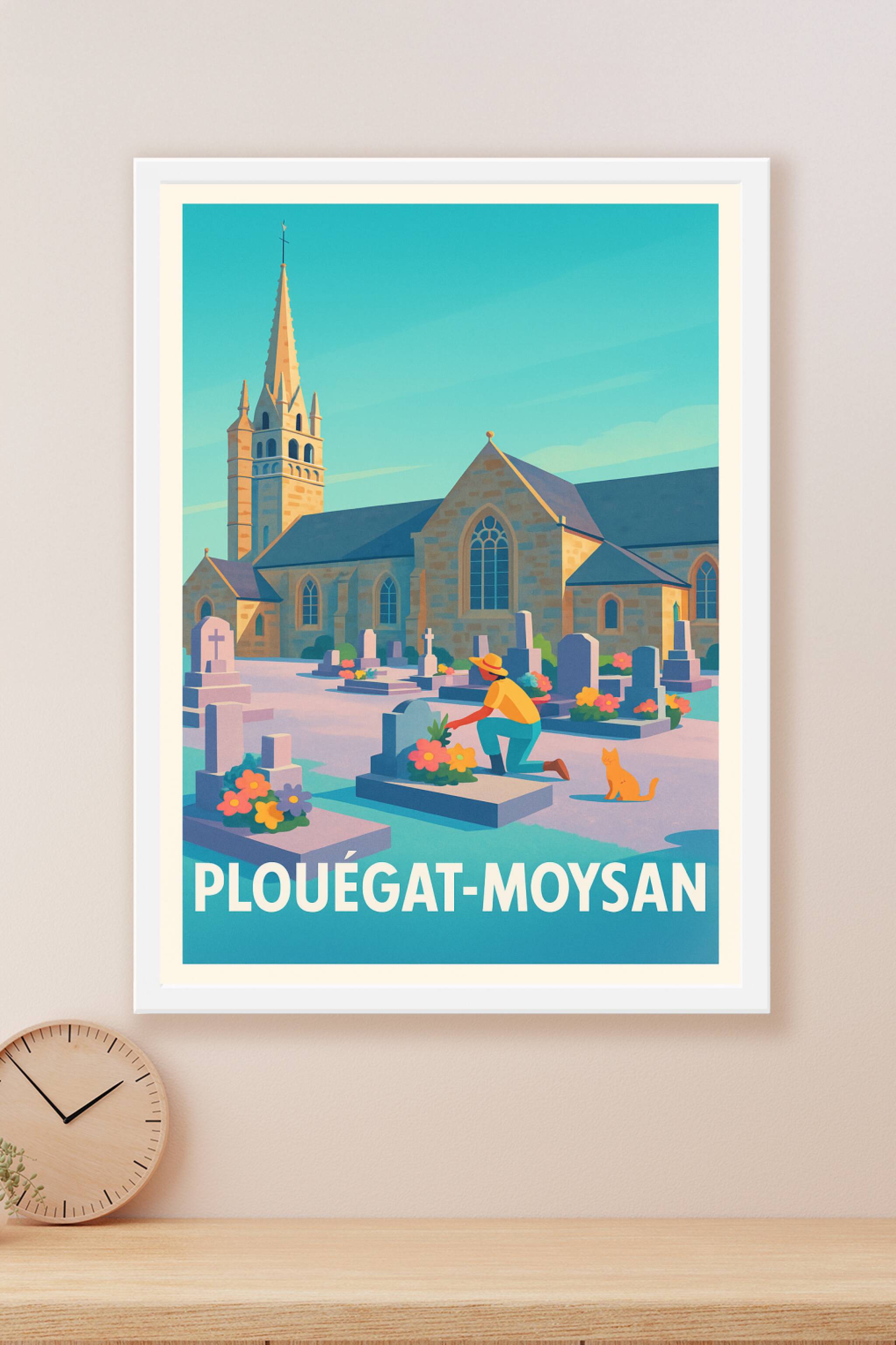 Découvrez la tranquillité et le charme authentique de Plouégat-Moysan à travers cette affiche illustrée. Le poster met en scène l'église et son cim...