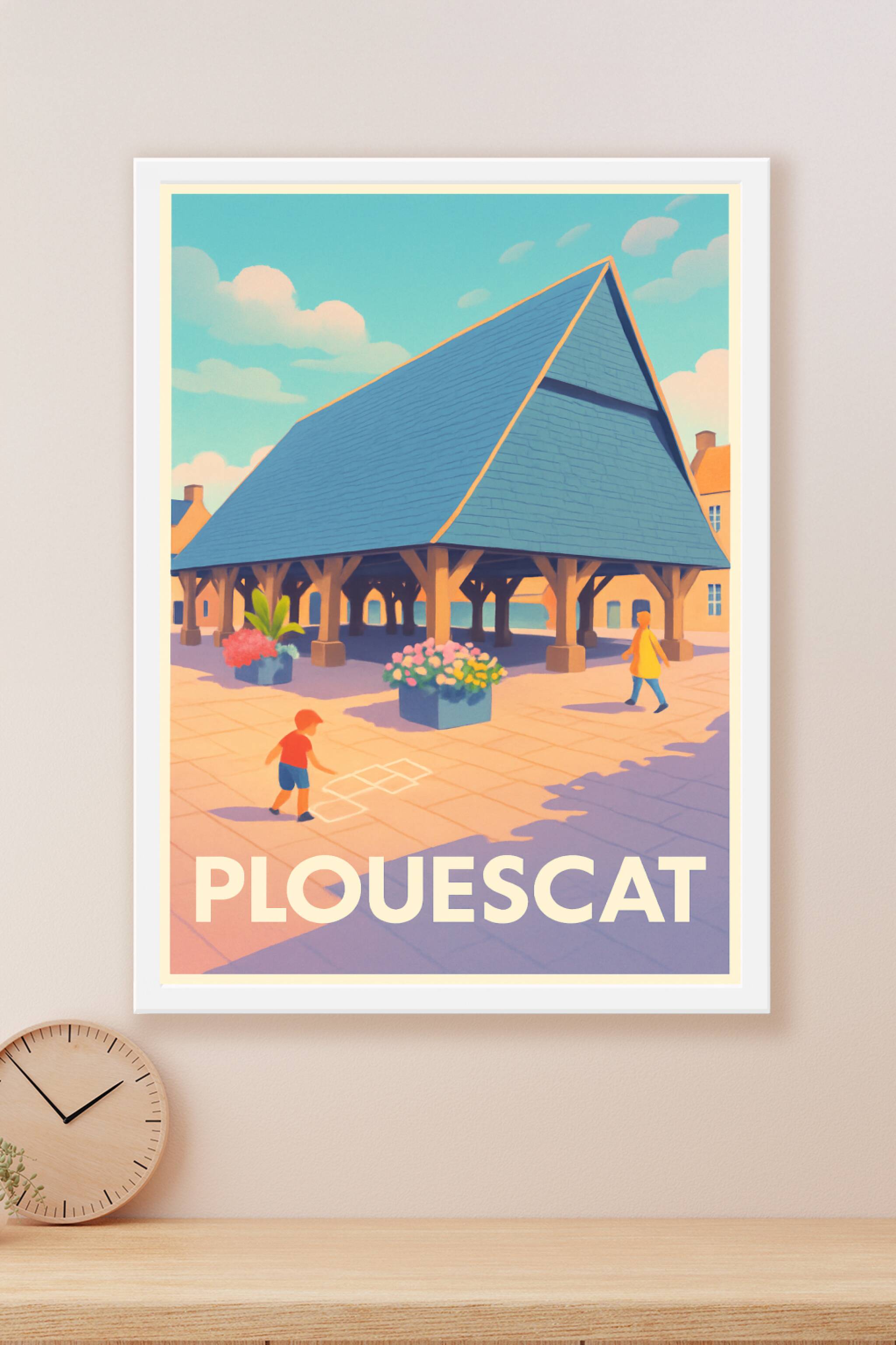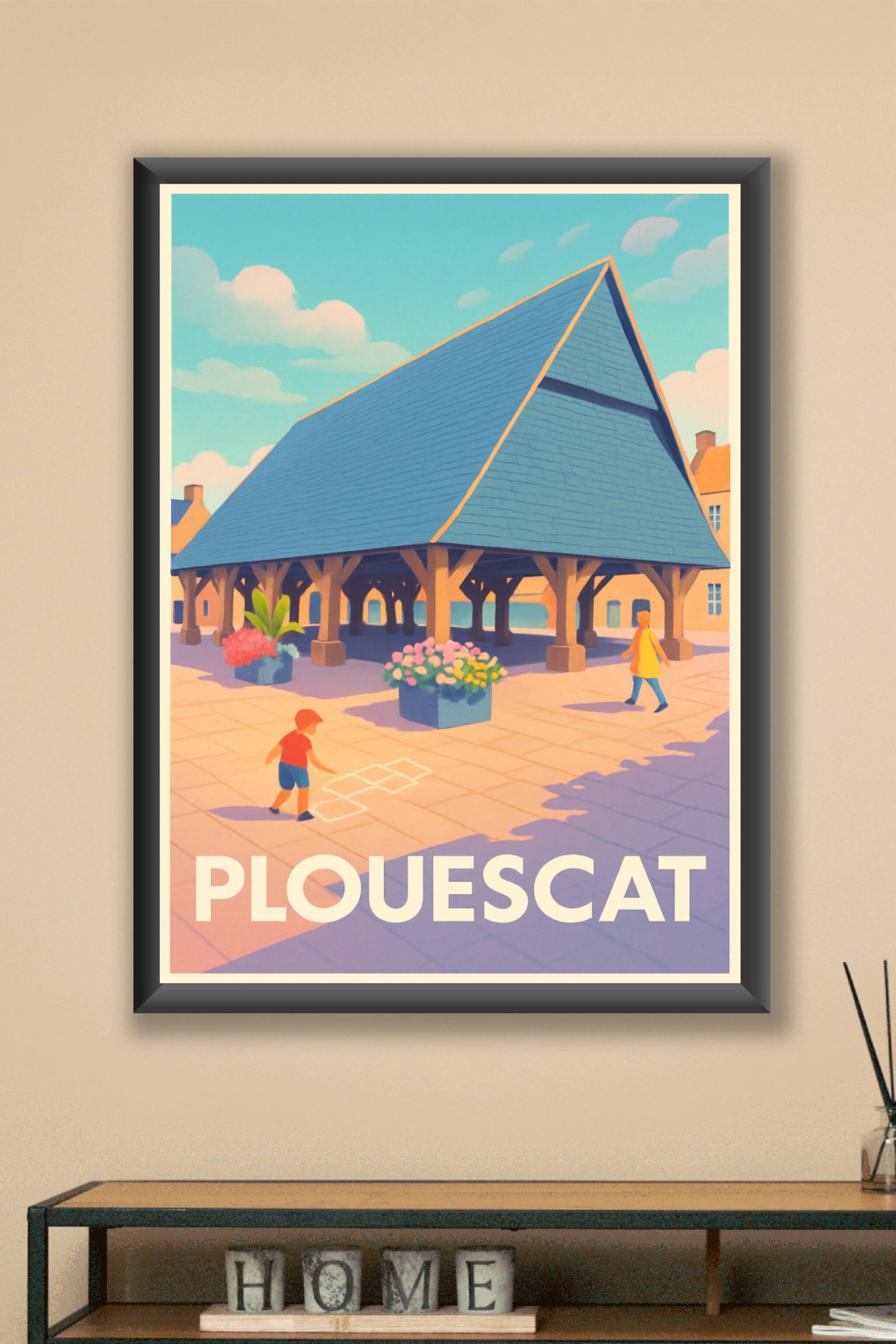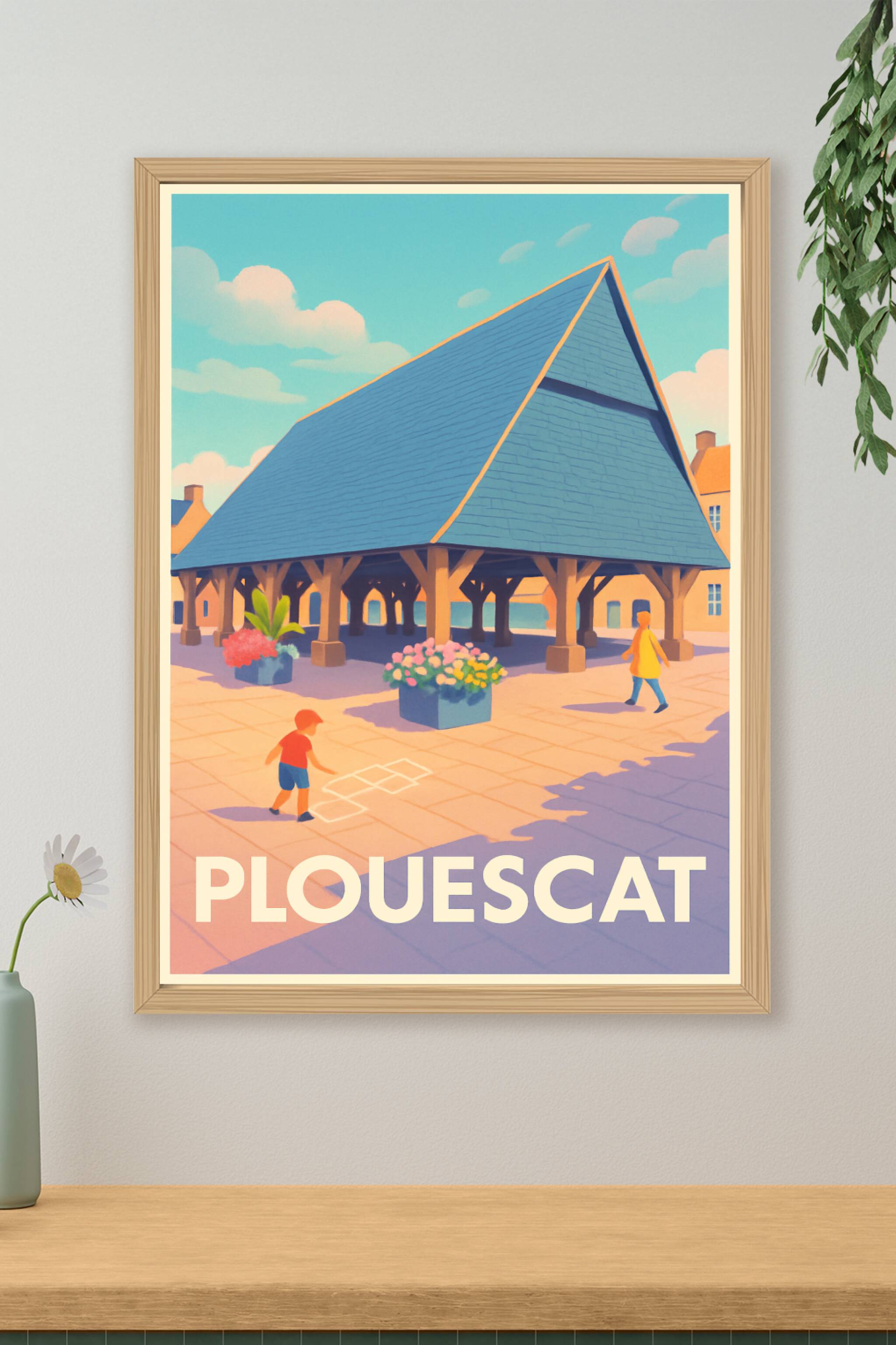 Découvrez l'atmosphère paisible et authentique de Plouescat avec cette affiche illustrée qui capture une scène typique du marché sous la halle bois...