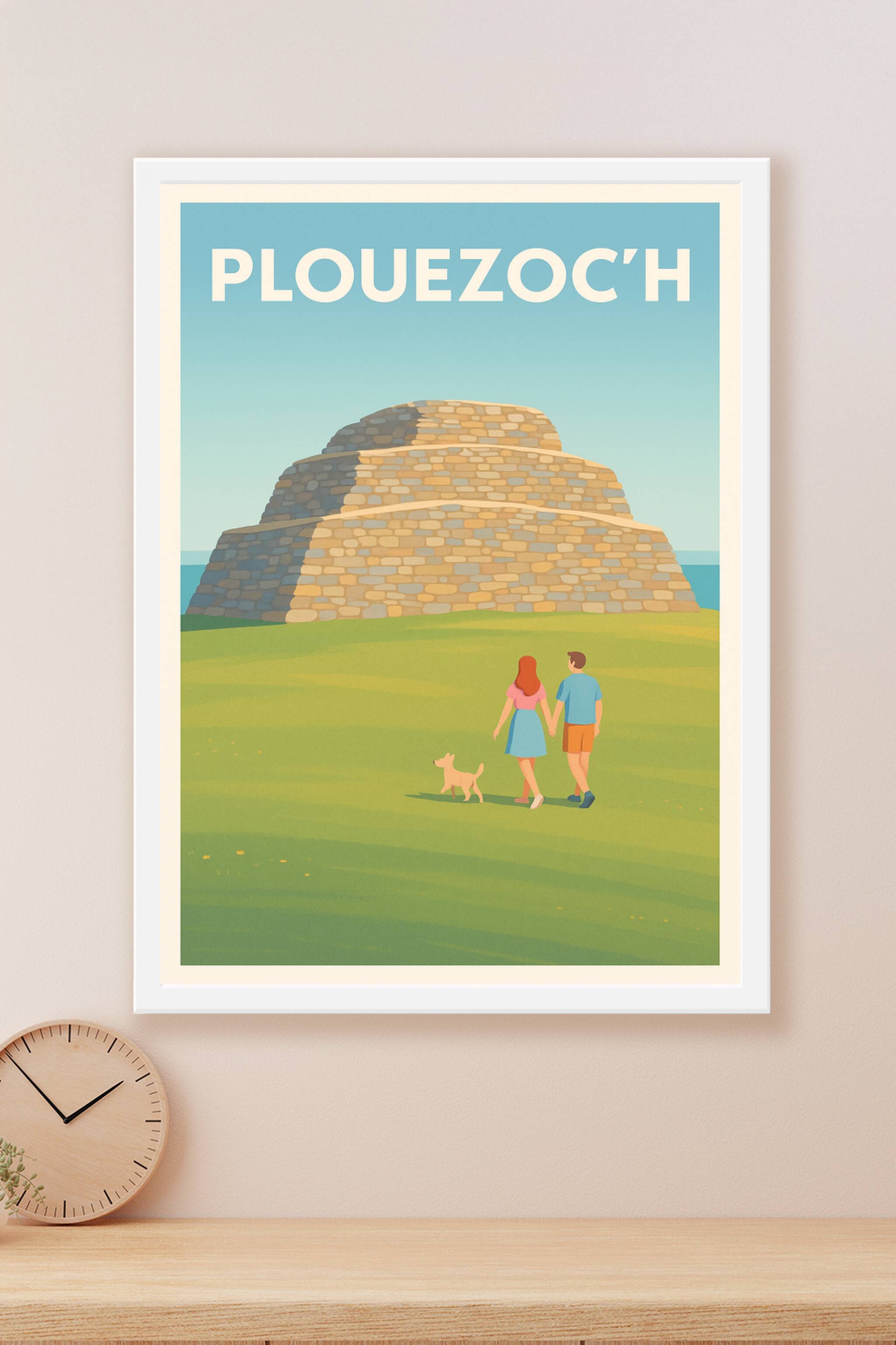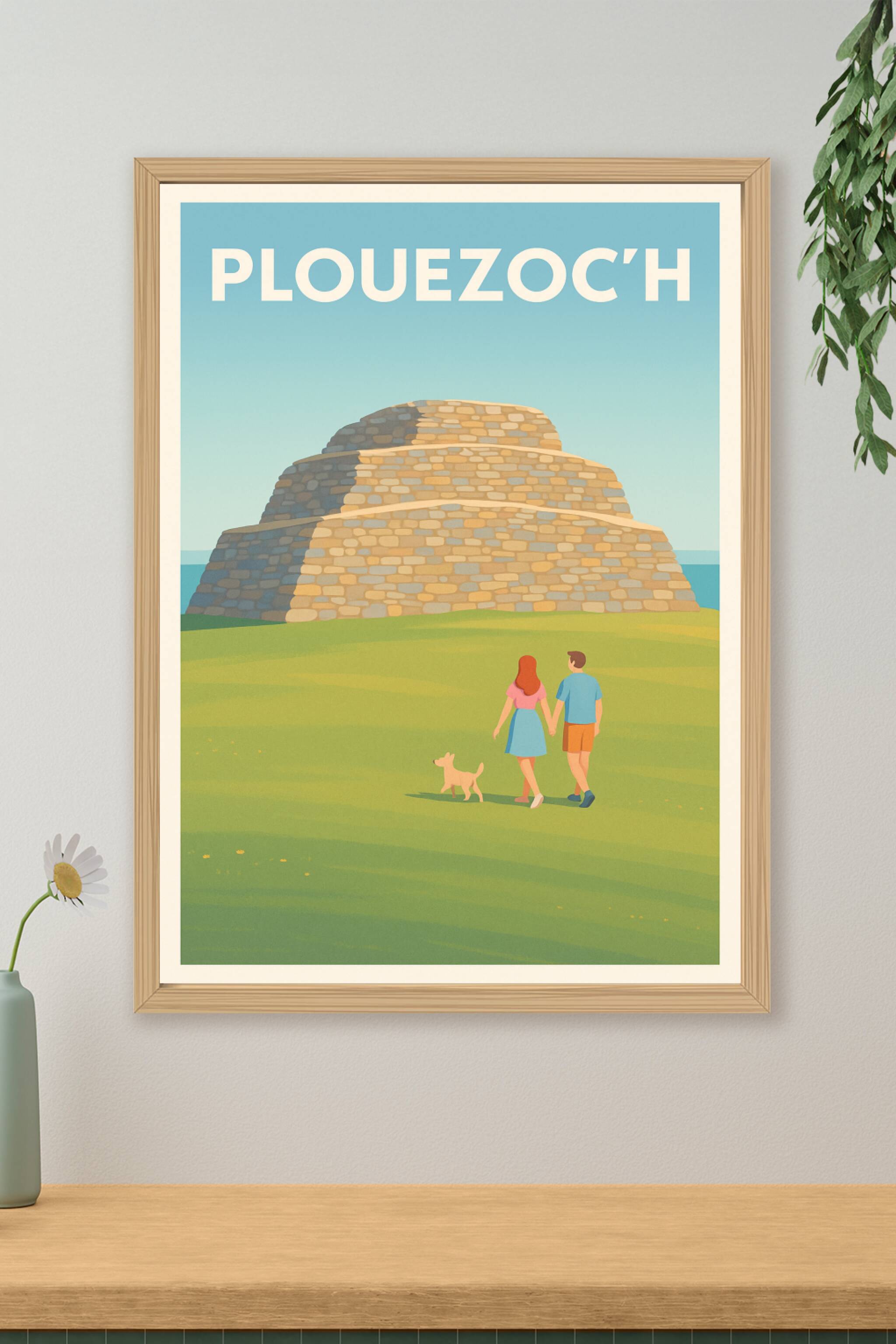 Découvrez la beauté intemporelle de Plouezoc'h avec cette affiche élégante mettant en scène le célèbre Cairn de Barnenez, monument mégalithique emblématique de la région. Illustrée dans un style doux et rétro, cette affiche invite à la promenade et à la découverte en bord de mer, avec un couple et leur chien admirant l'édifice sous un ciel azur.Les posters sont proposés en tirage "Fine Art", imprimés sur un papier de qualité supérieure 305g coton, assurant une finesse et une durabilité exceptionnelles. Disponibles en formats A1 à A4, avec ou sans cadre, ces affiches s'adaptent parfaitement à toutes les décorations intérieures, apportant une touche naturelle et historique à votre espace. Fabriquée avec soin en France, cette affiche est une invitation idéale pour les amoureux de la Bretagne et des sites patrimoniaux.