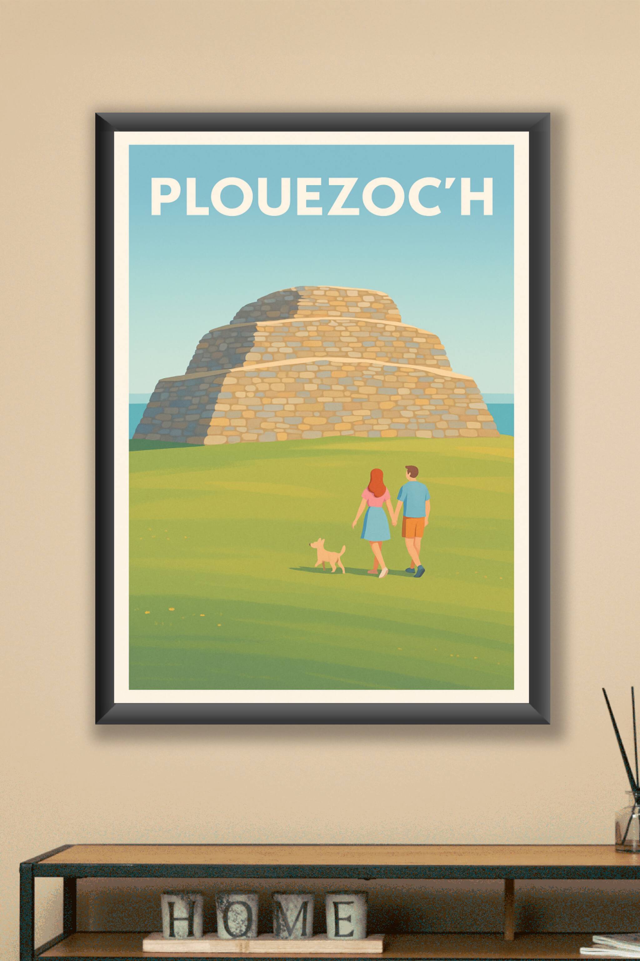 Découvrez la beauté intemporelle de Plouezoc'h avec cette affiche élégante mettant en scène le célèbre Cairn de Barnenez, monument mégalithique emb...