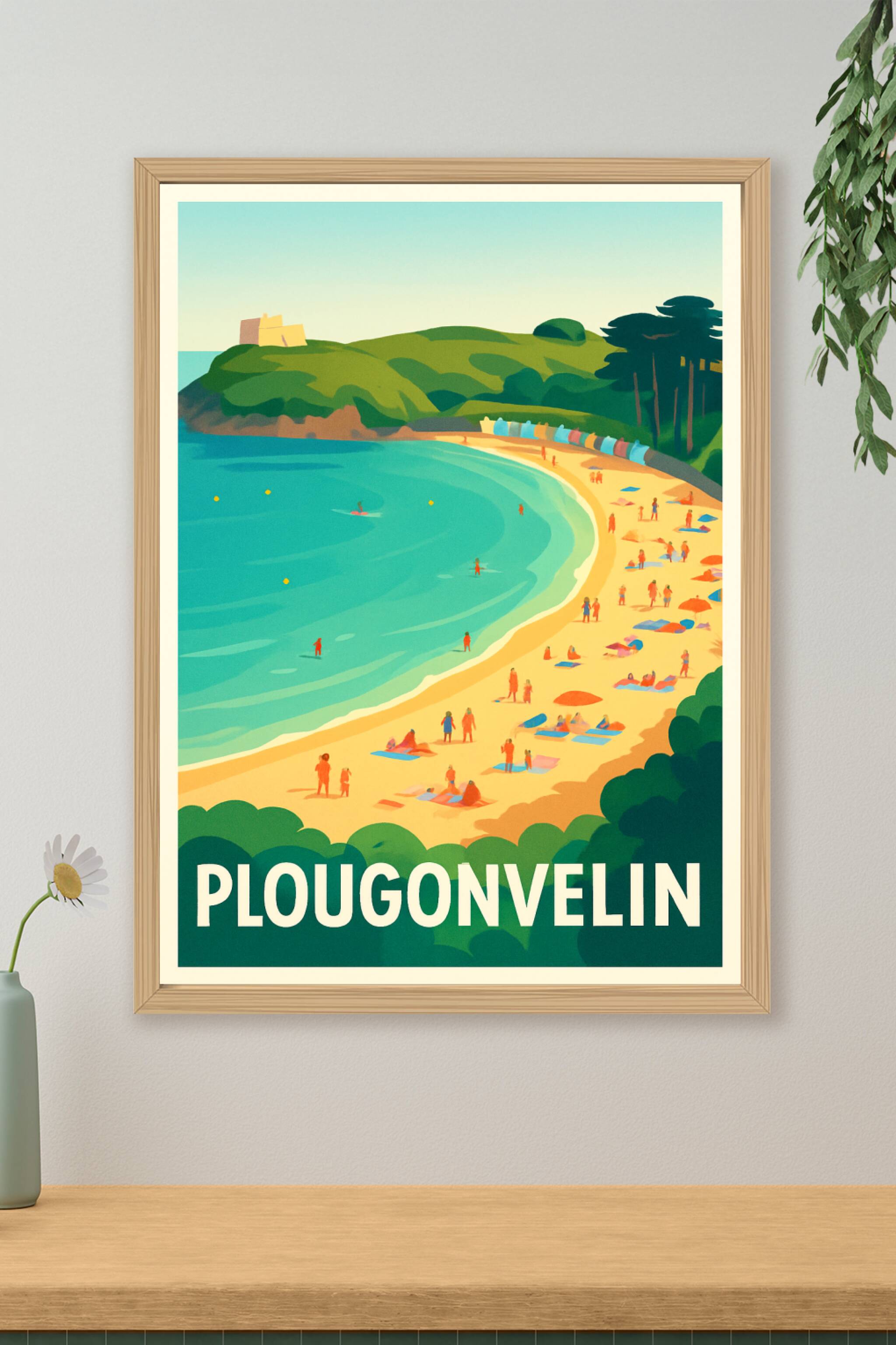 Découvrez la beauté naturelle de Plougonvelin avec cette affiche plein de fraîcheur et de lumière, représentant une plage animée bordée de dunes ve...