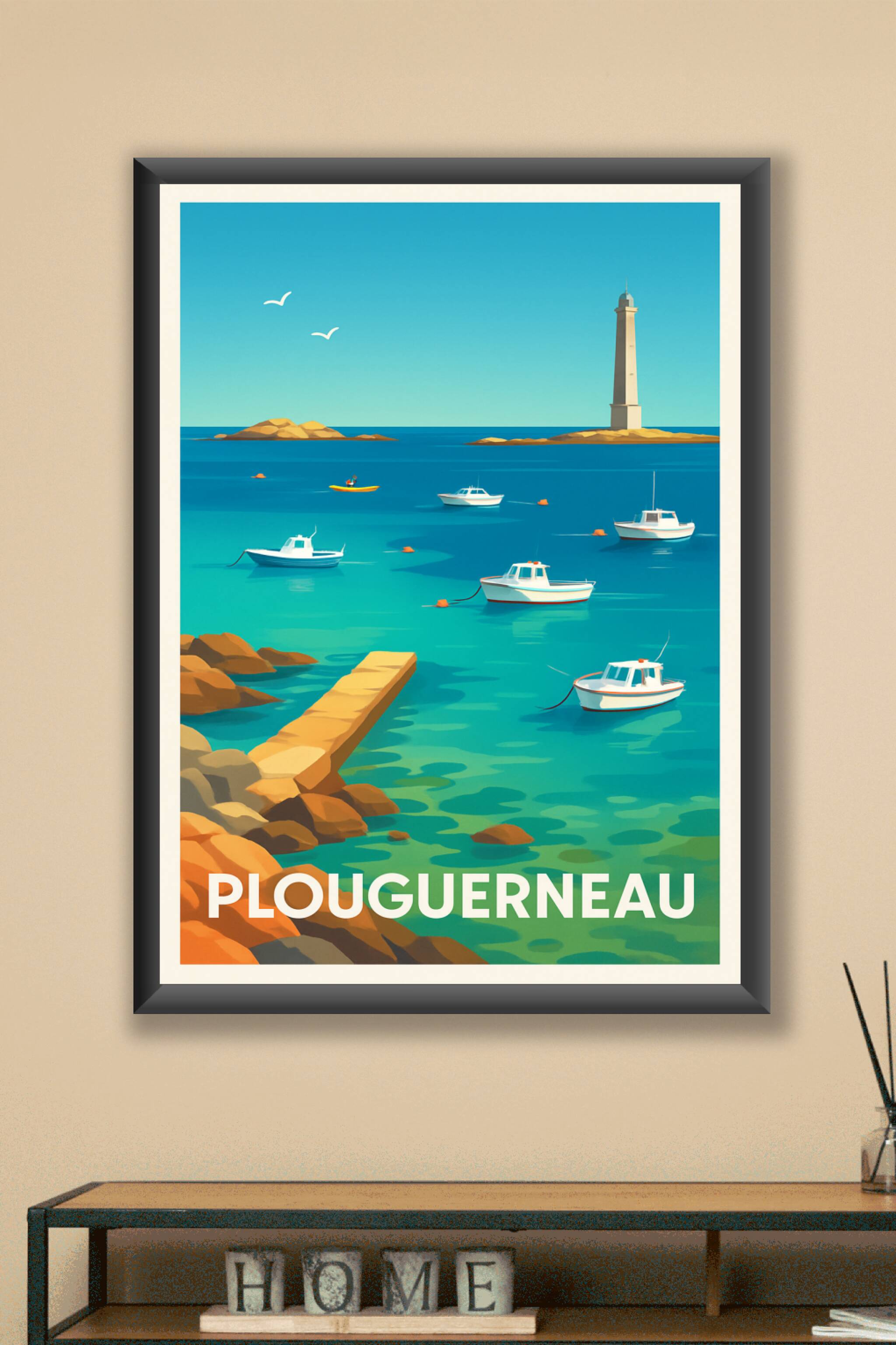 Découvrez la sérénité du littoral breton avec cette affiche illustrée représentant les eaux translucides et les petits bateaux amarrés face au phar...