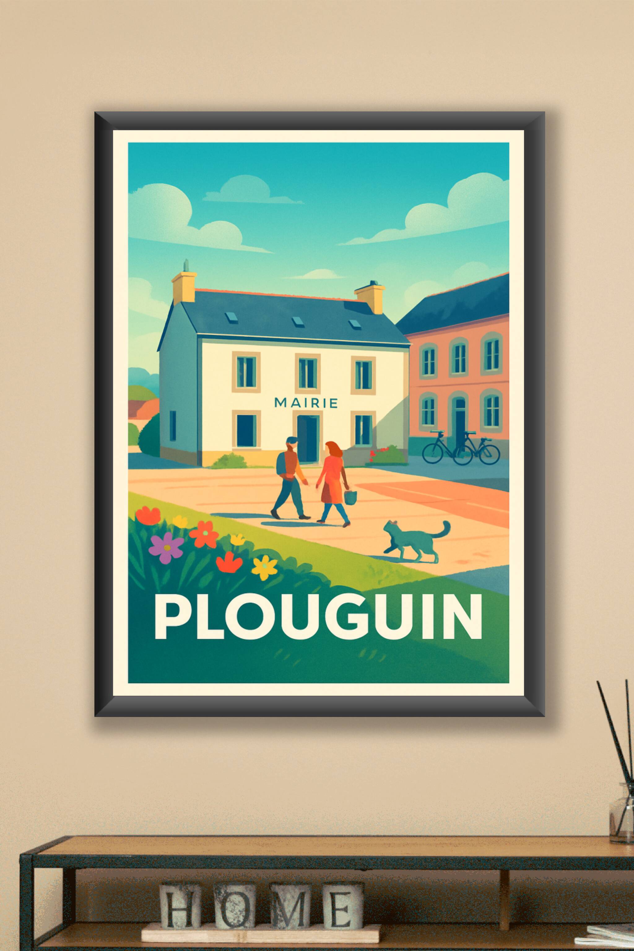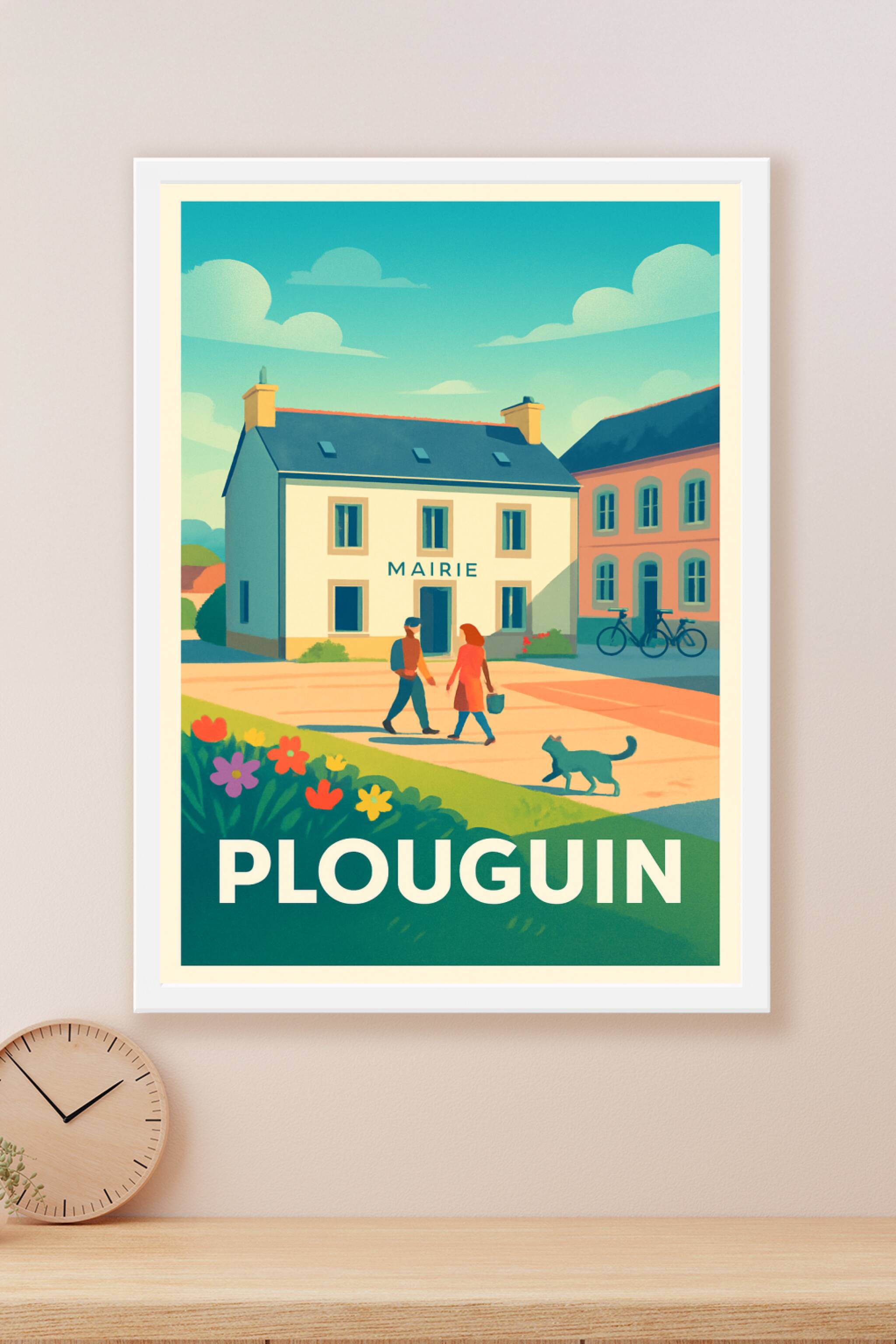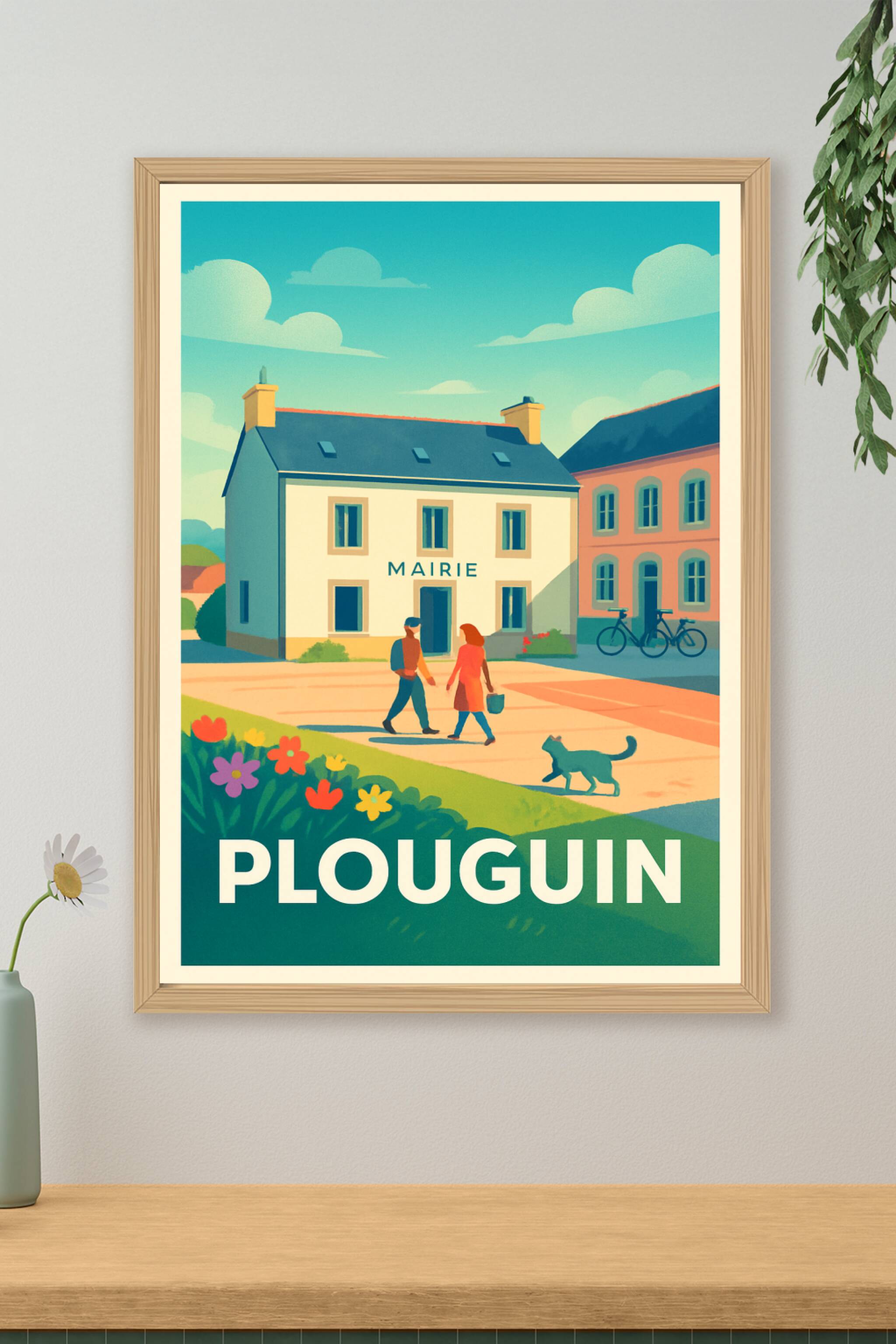 Découvrez l'élégance tranquille de Plouguin à travers cette affiche illustrée, représentant la mairie au cœur d'une scène paisible printanière. Ce poster capture l'esprit authentique de la Bretagne, avec ses maisons traditionnelles, ses habitants en promenade et une ambiance bucolique toute en douceur. Imprimé en tirage "Fine Art" sur un papier 305g coton de qualité supérieure, ce poster garantit des couleurs éclatantes et une durabilité optimale. Disponible en formats A1 à A4, avec ou sans cadre, cette affiche est idéale pour apporter une touche de douceur et de patrimoine breton à votre intérieur ou offrir un cadeau raffiné à un amoureux de la région.