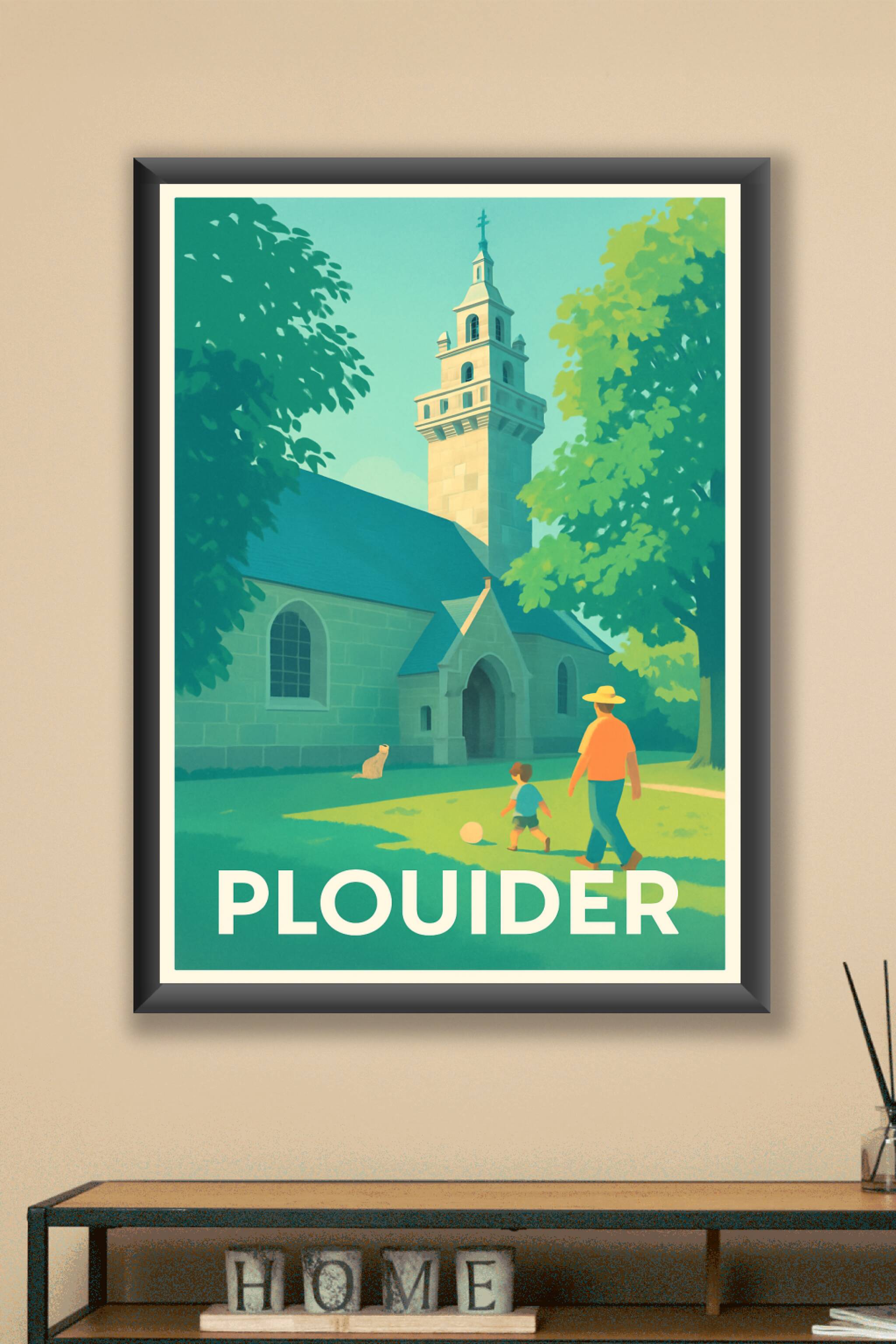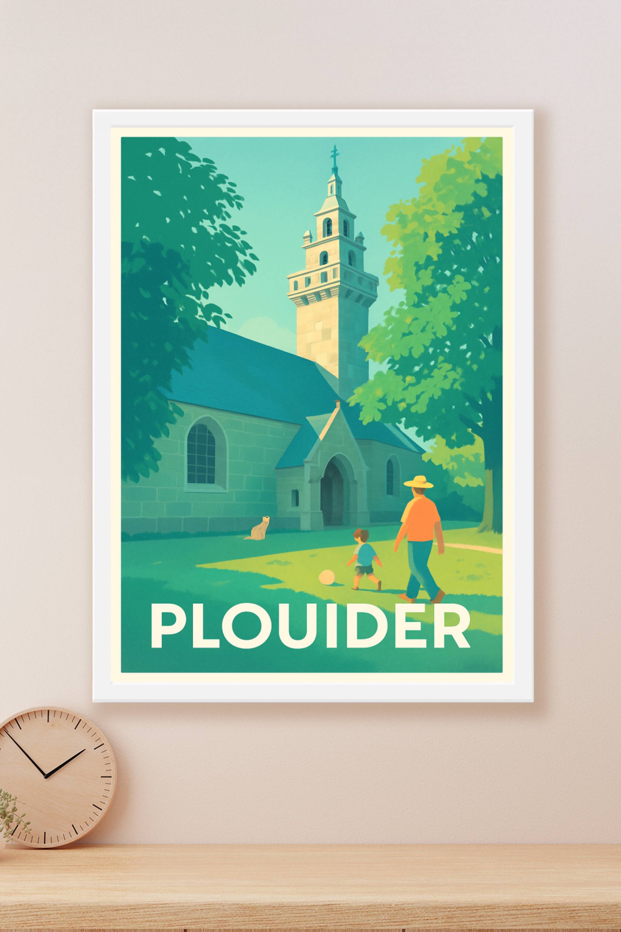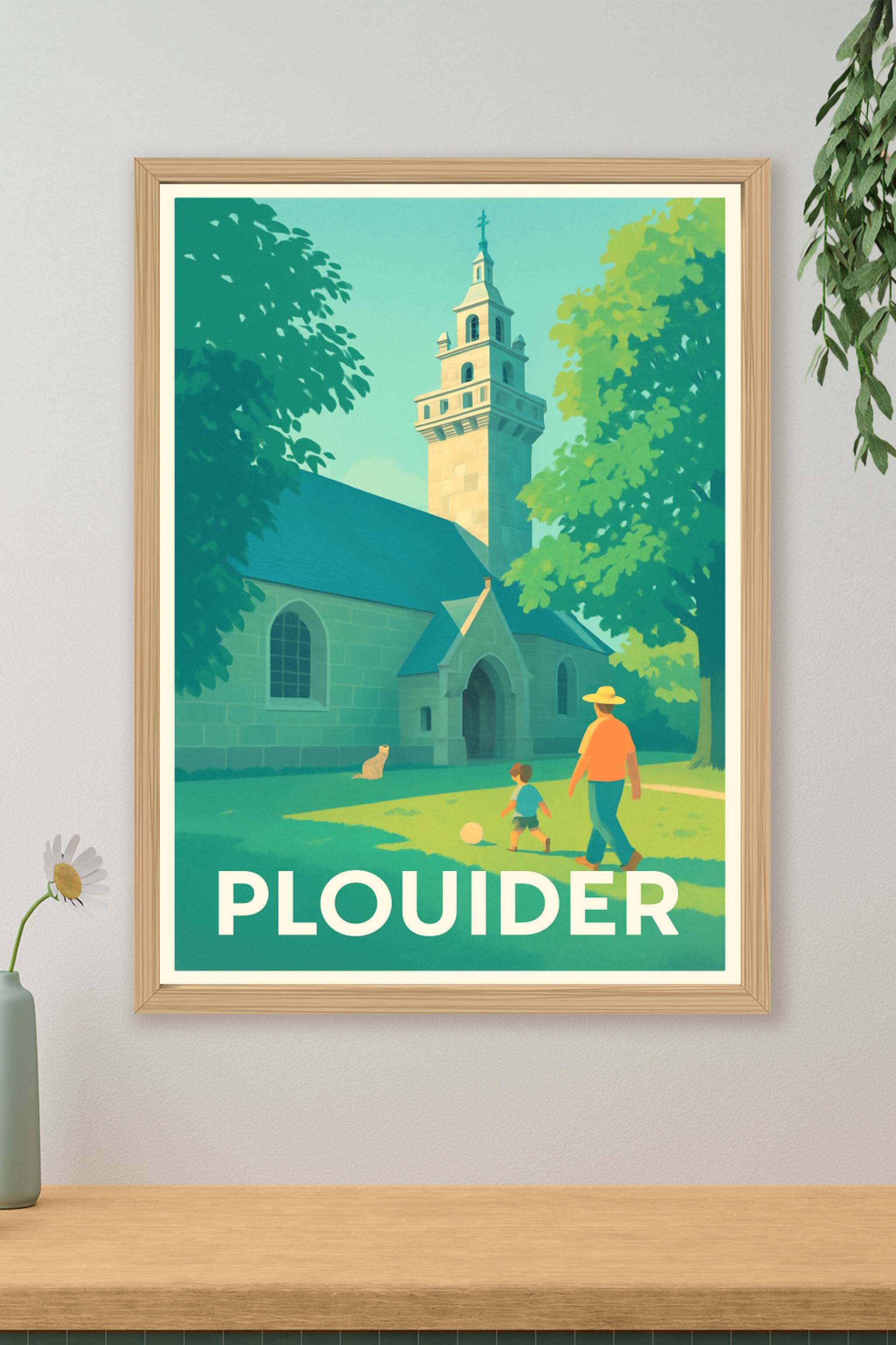 Découvrez l'ambiance paisible de Plouider avec cette affiche illustrée mettant en scène une scène de vie simple devant une bâtisse historique typiq...