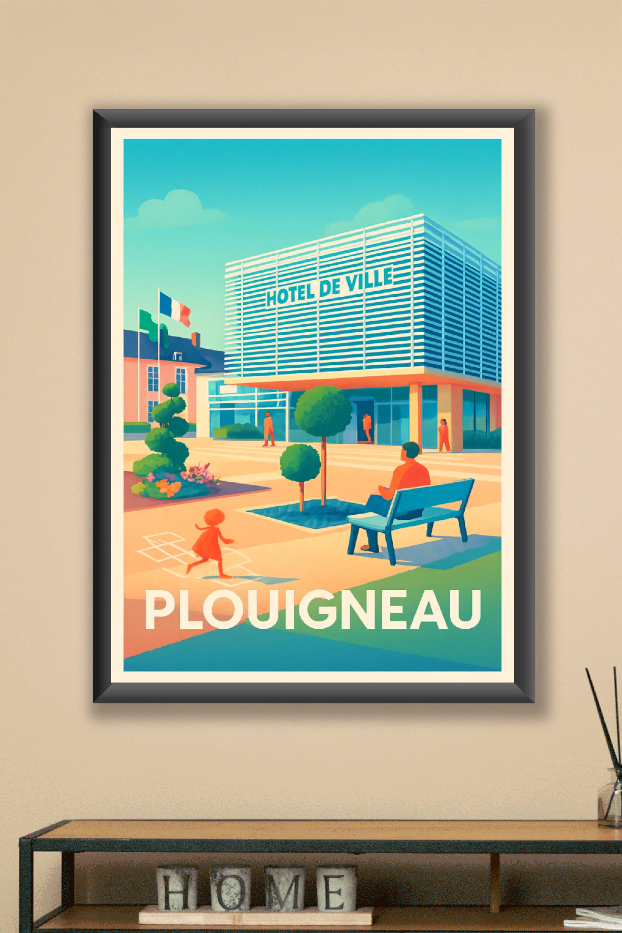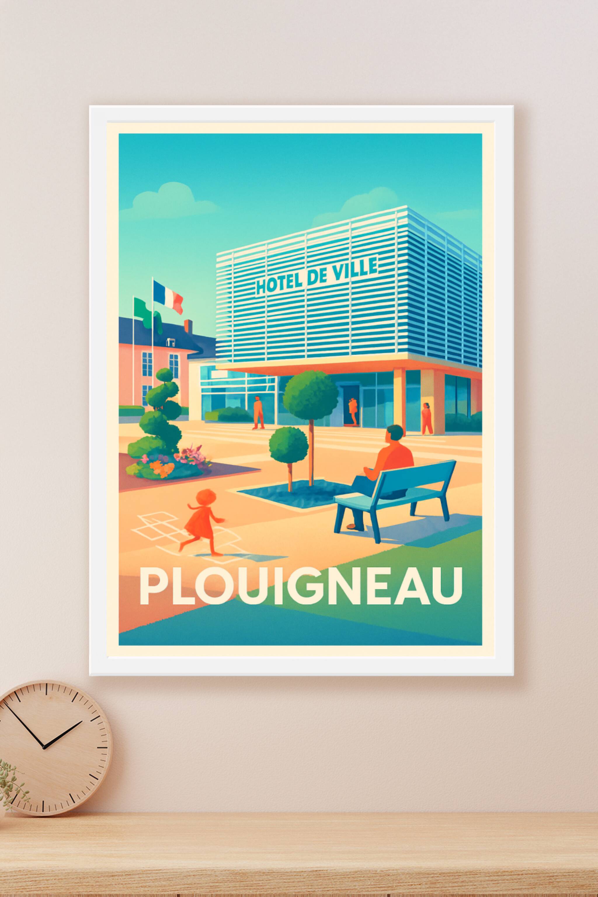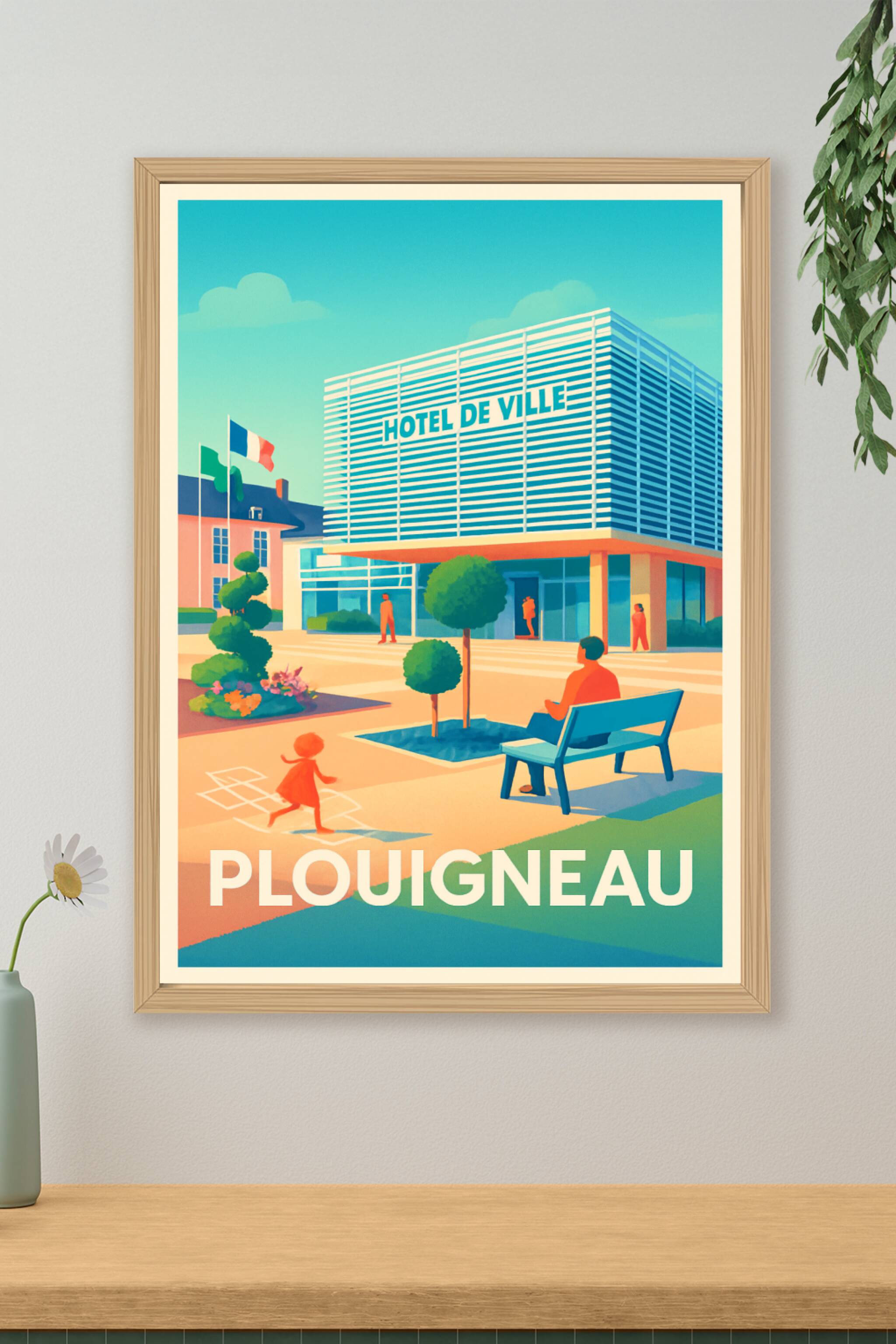 Découvrez l'ambiance paisible et moderne de Plouigneau à travers cette affiche illustrée mettant en scène l'Hôtel de Ville, un symbole de vie local...