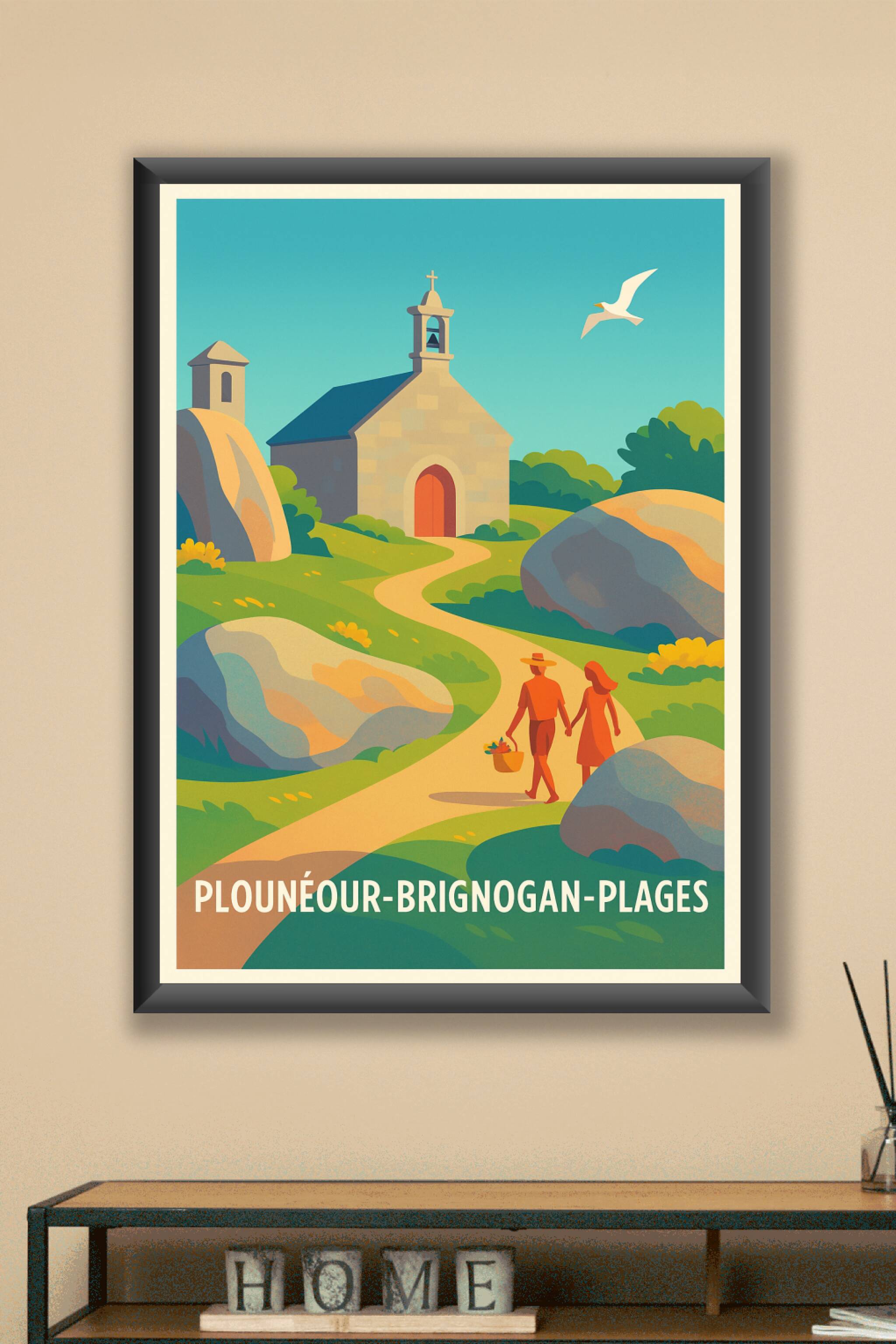 Découvrez la sérénité de Plounéour-Brignogan-Plages avec cette affiche illustrée dans un style vintage chaleureux et coloré. L'image met en scène un couple se promenant sur un chemin sinueux au cœur d'un paysage naturel ponctué de rochers, d'une chapelle traditionnelle et d'une mouette en plein vol. Ce poster est imprimé en tirage "Fine Art" sur papier 305g coton pour une qualité d'impression exceptionnelle, offrant une restitution fidèle des couleurs et des détails. Disponible du format A1 à A4, avec ou sans cadre, cette affiche apportera une touche de charme et de douceur méridionale à votre intérieur. Offrez-vous une décoration raffinée 100% fabriquée en France ou un cadeau unique pour les amoureux des paysages bretons.