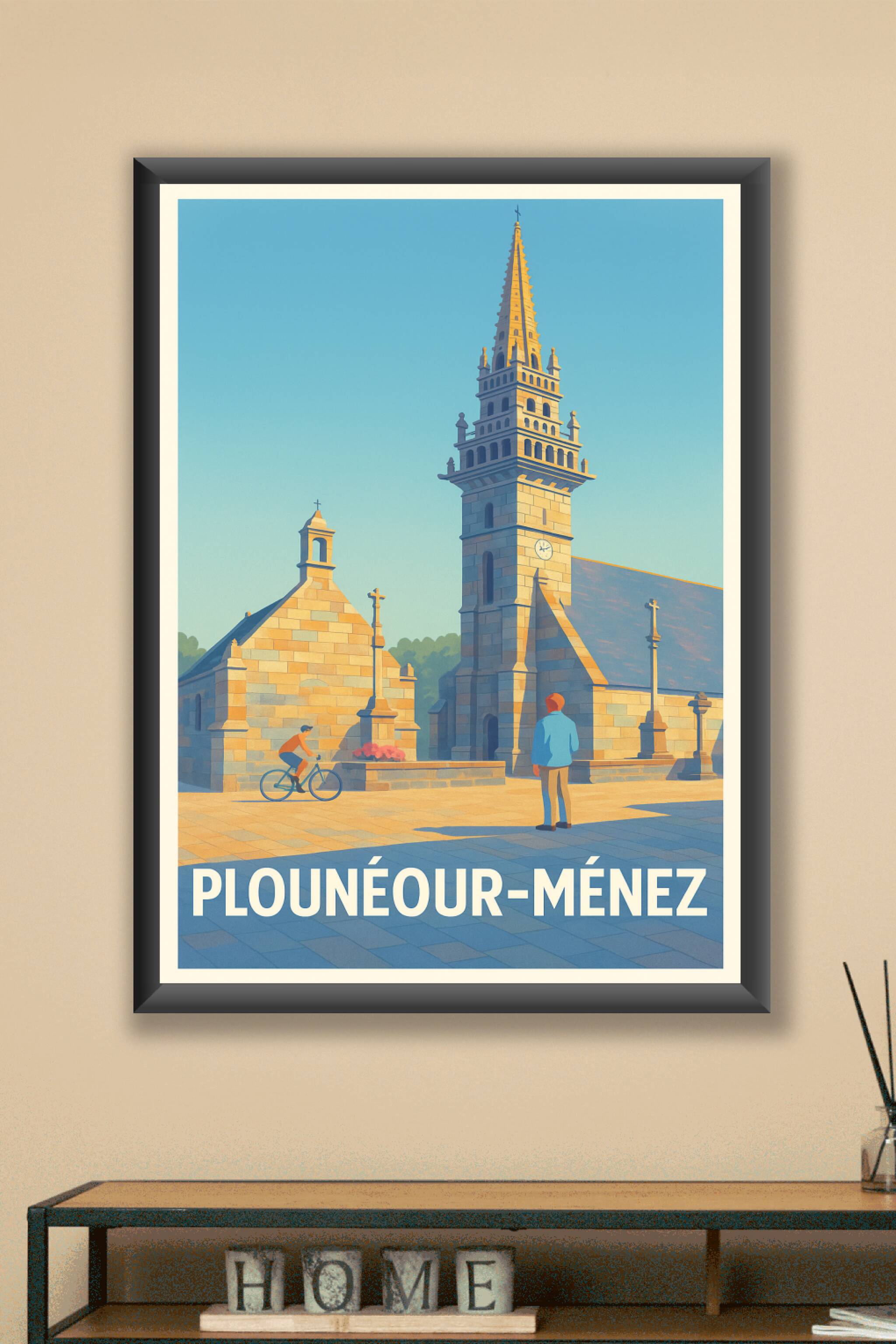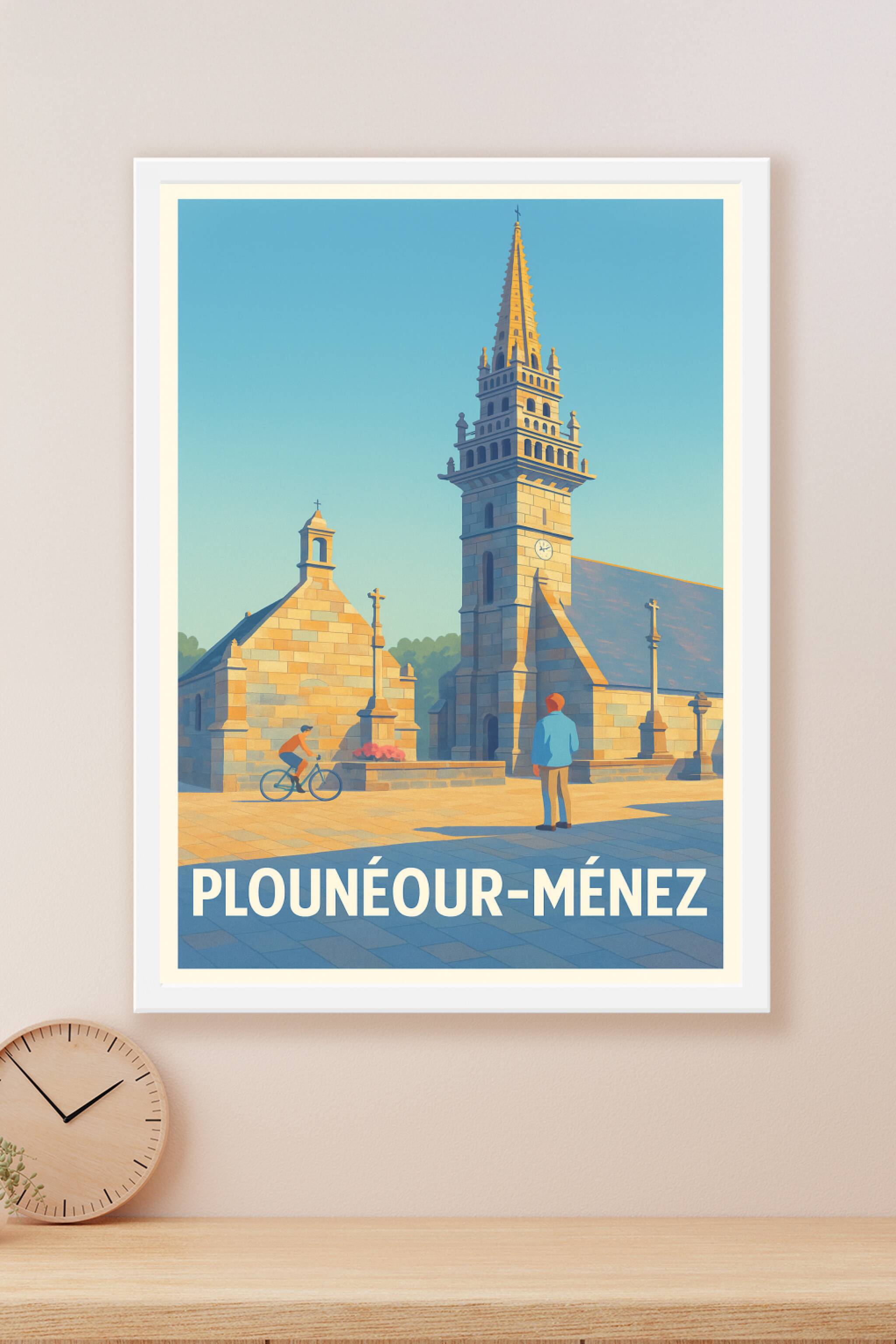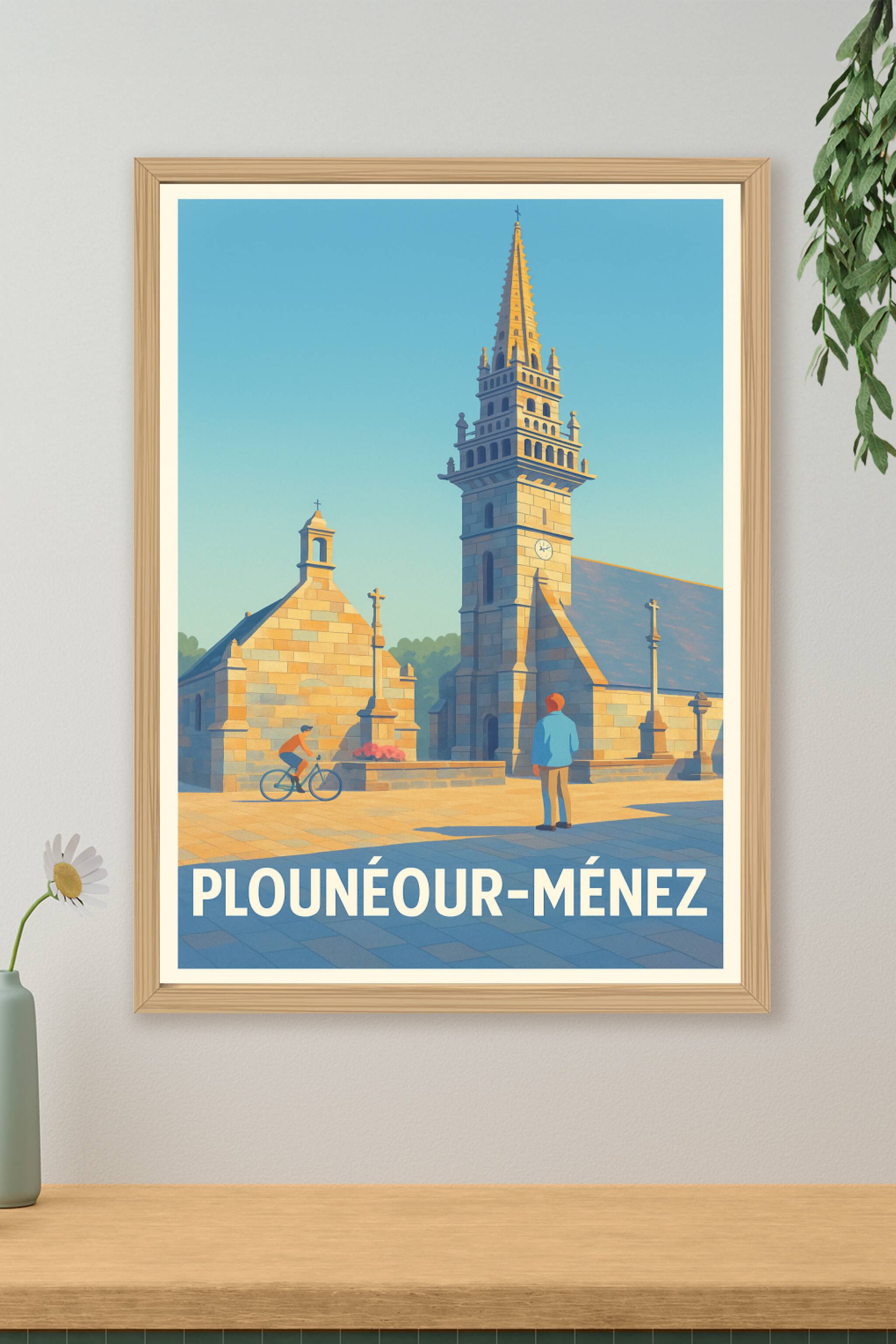 Découvrez la quiétude et l'élégance de Plounéour-Ménez à travers cette affiche illustrant ses monuments en pierre emblématiques baignés par la lumi...