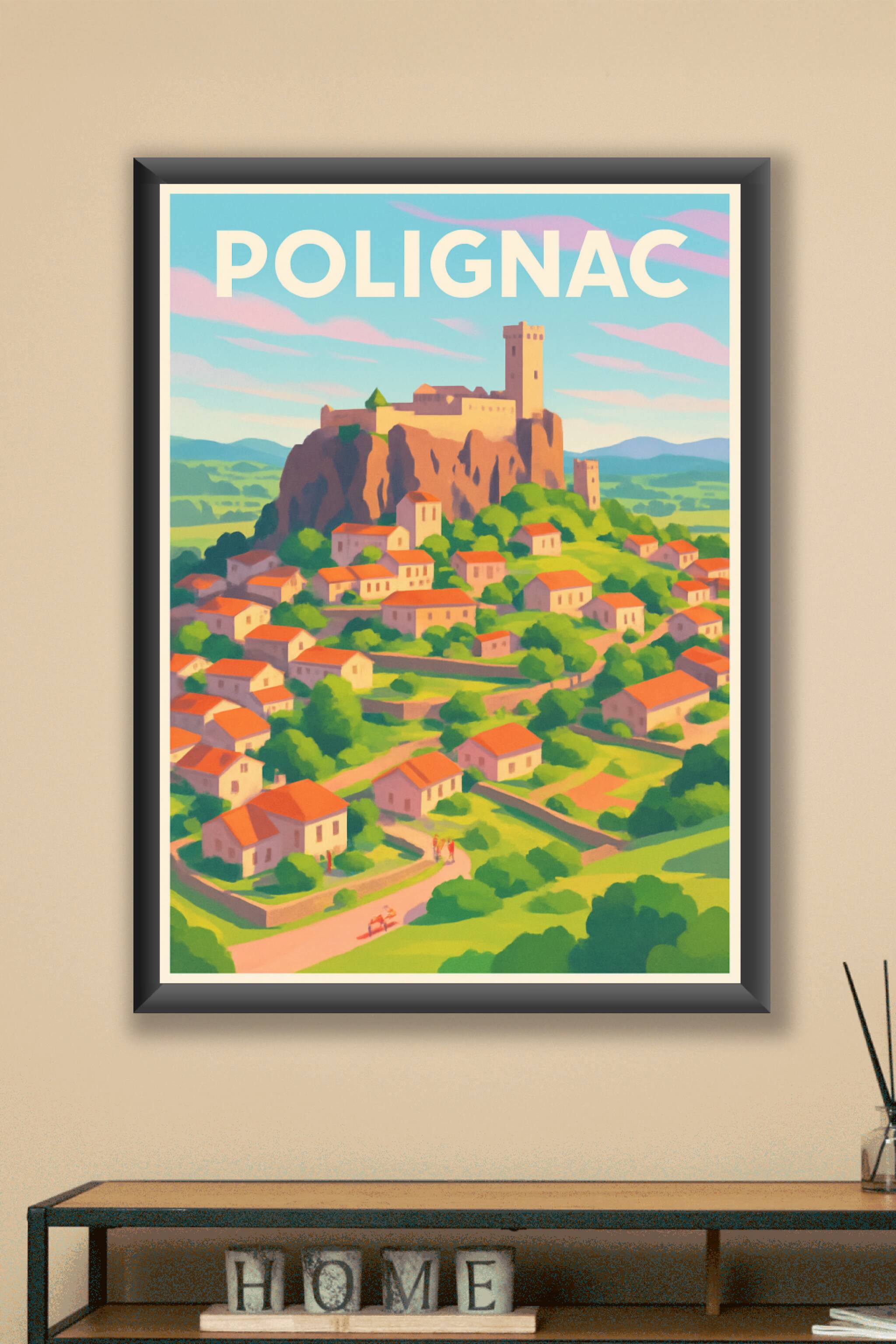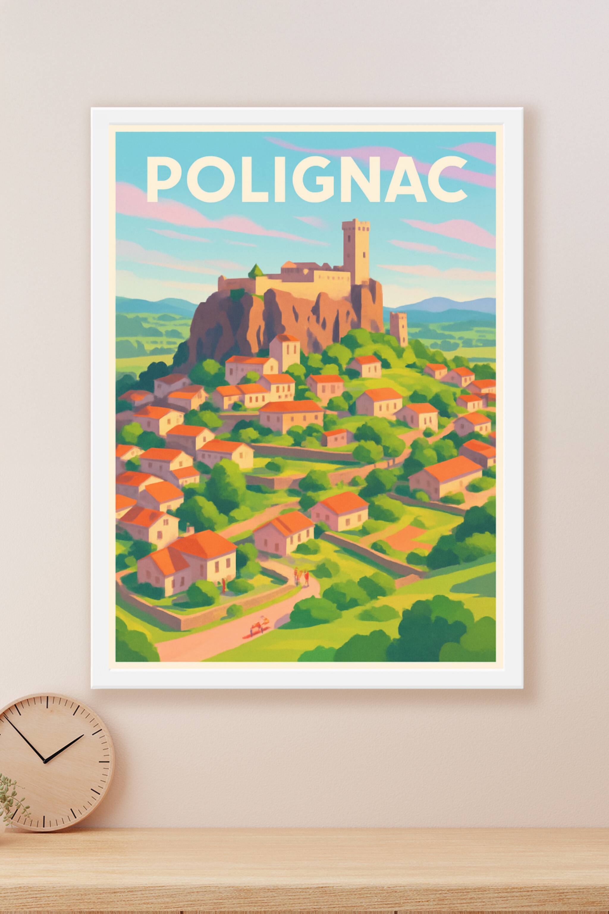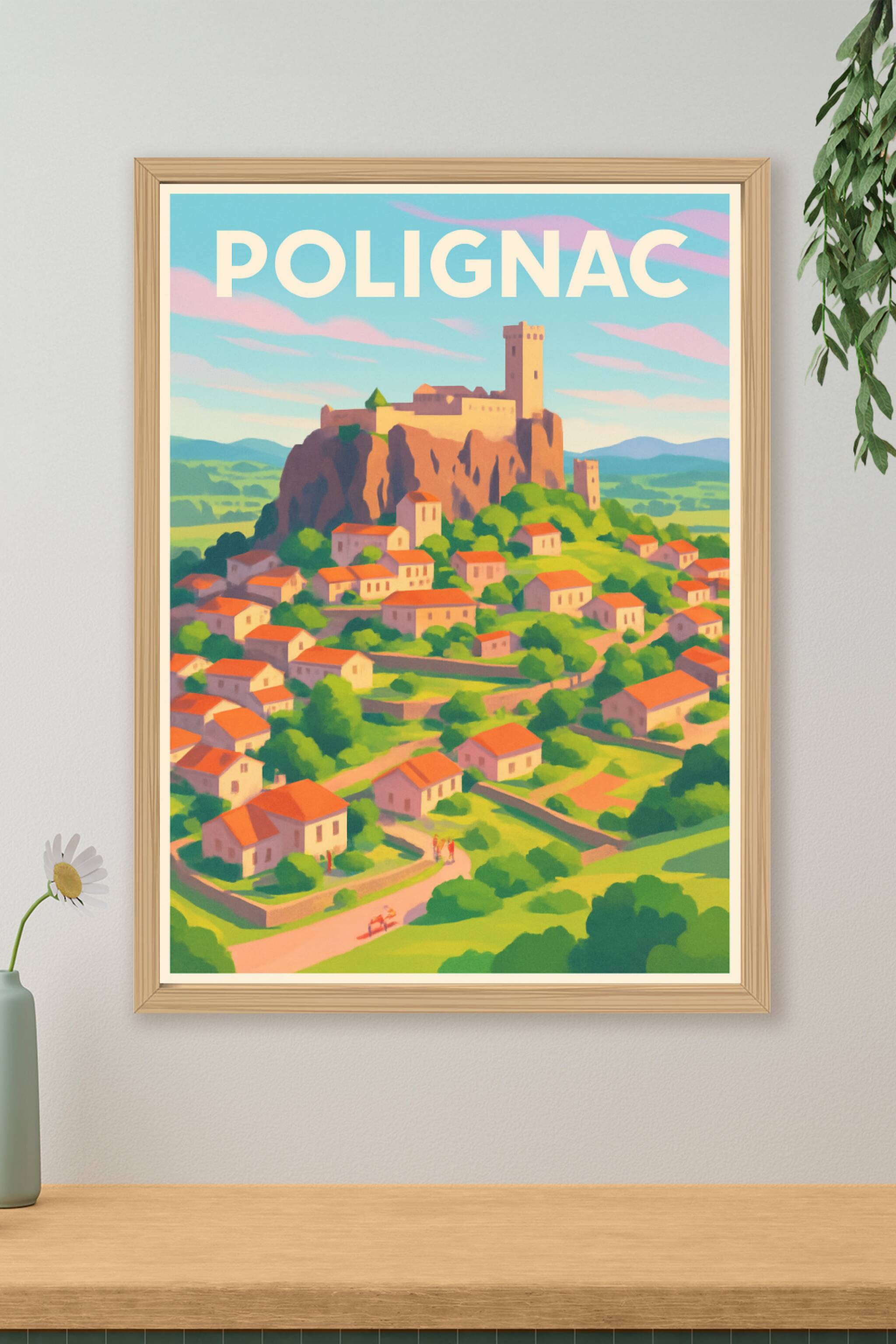 Découvrez le village pittoresque de Polignac avec cette affiche illustrant son célèbre château perché sur un rocher dominant des maisons aux toits ...