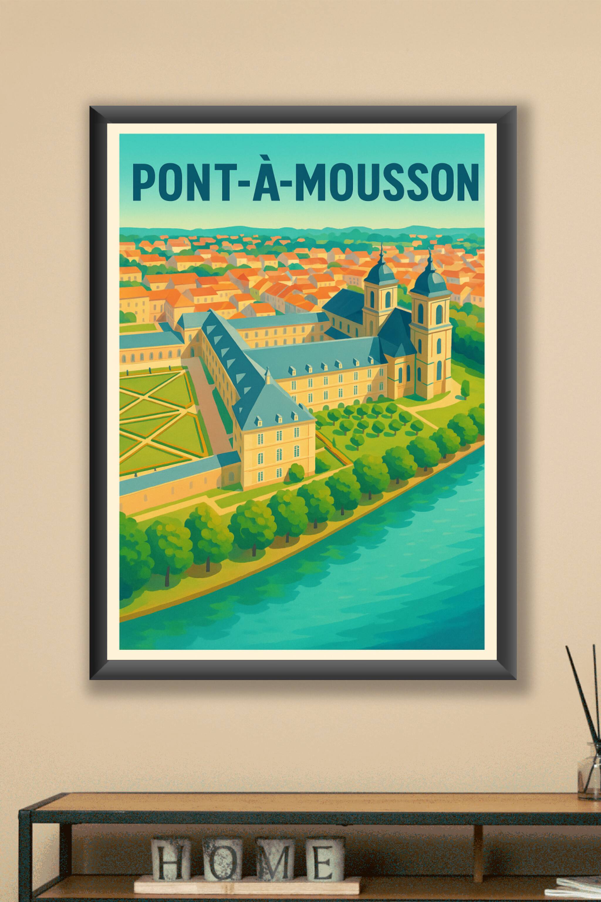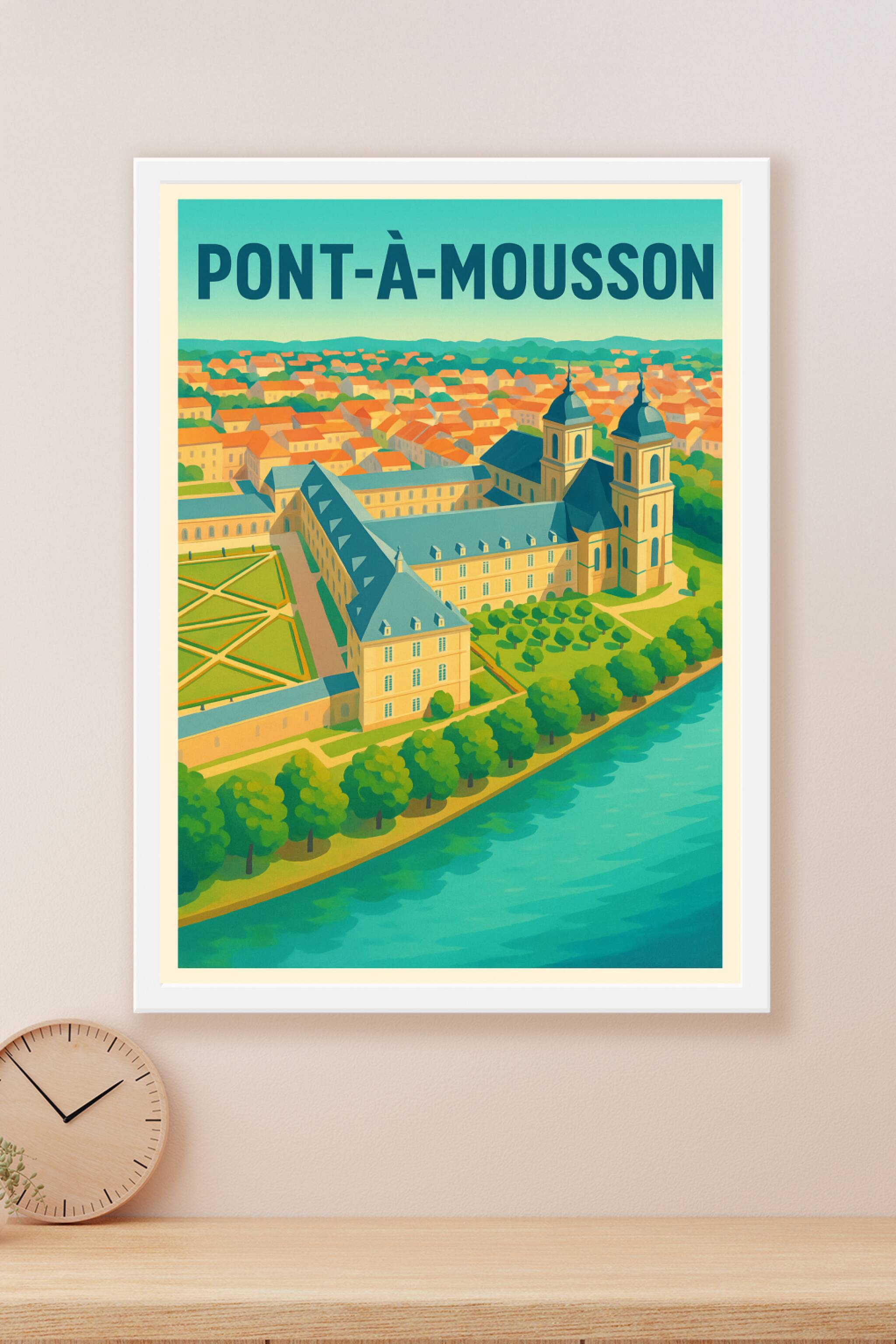 Découvrez l'élégance de Pont-à-Mousson avec cette magnifique affiche illustrée mettant en valeur le patrimoine architectural et les paysages paisib...