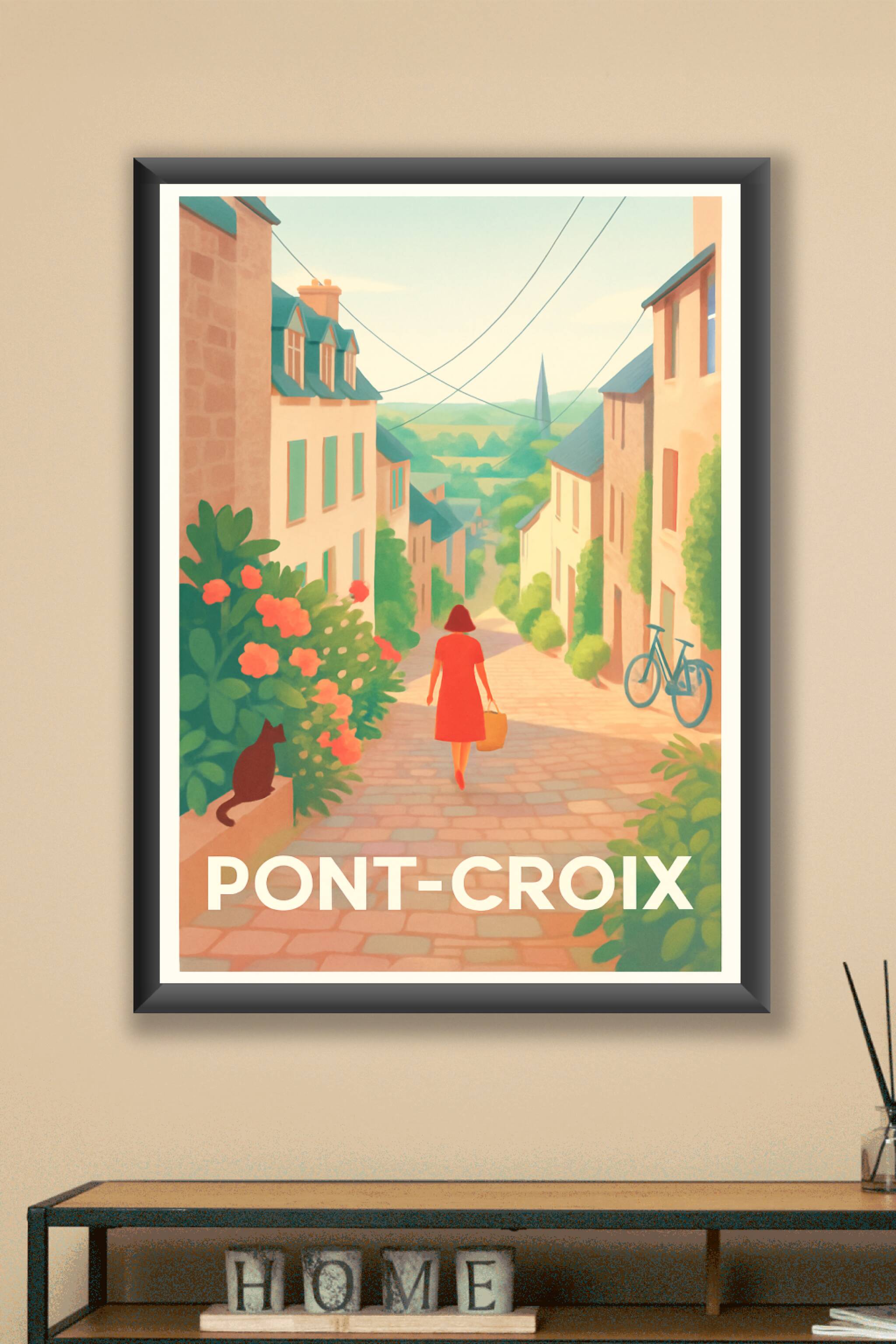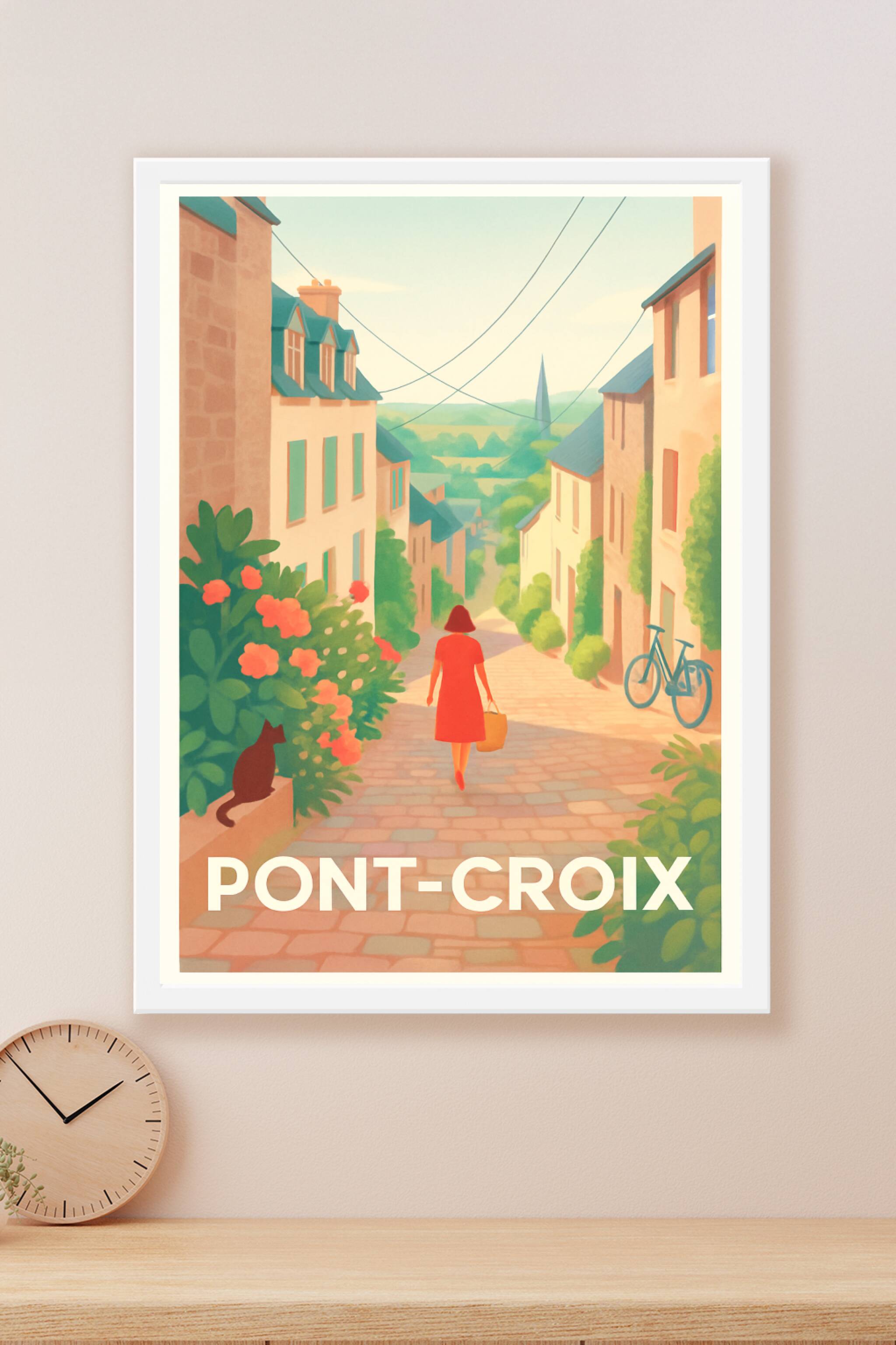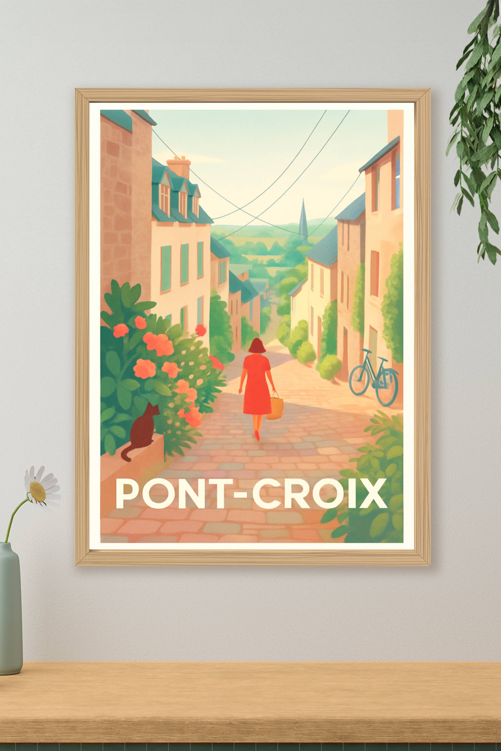Découvrez la douceur de vivre à Pont-Croix avec cette affiche illustrée représentant une ruelle pavée bordée de maisons traditionnelles, baignée pa...