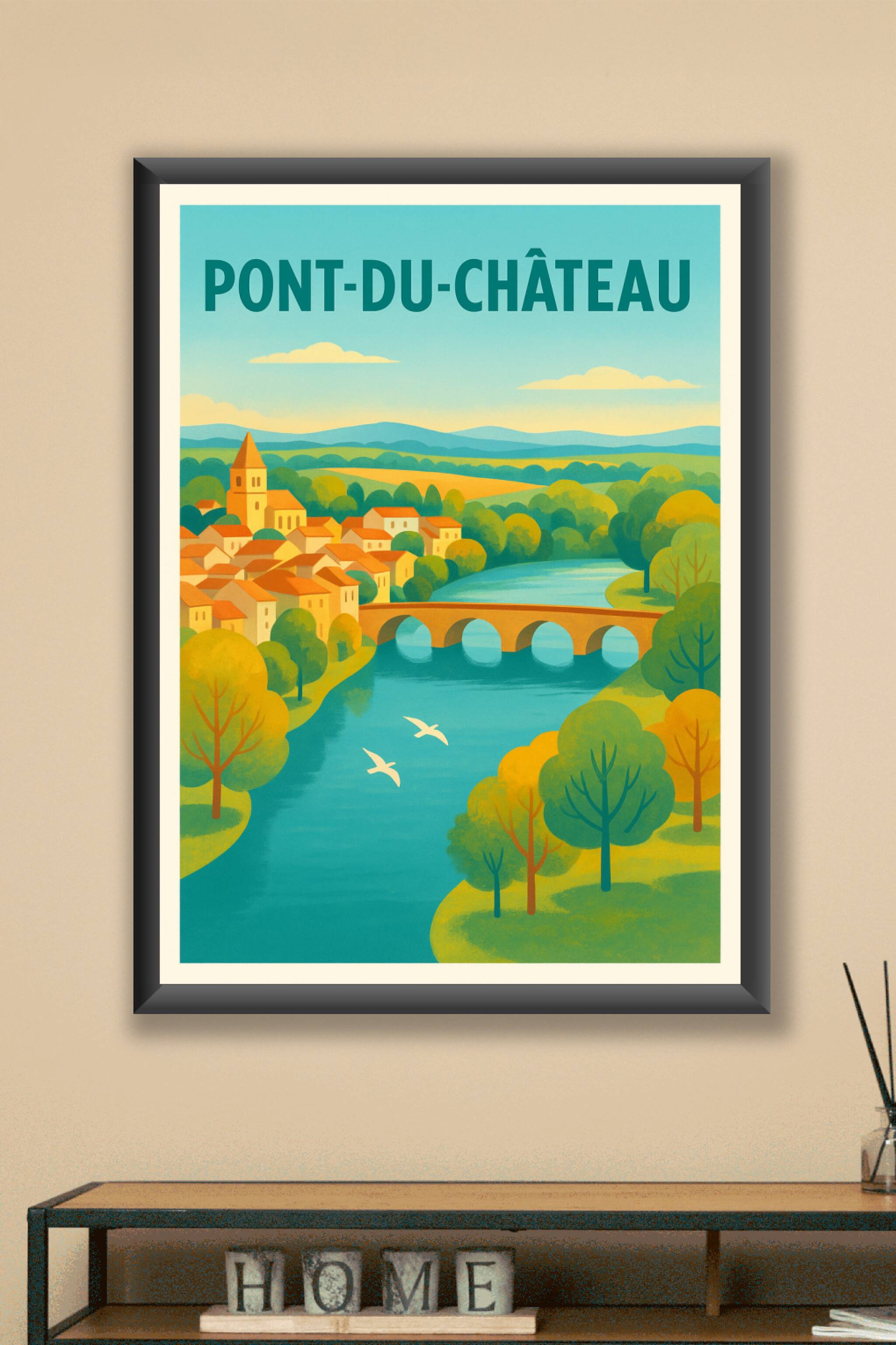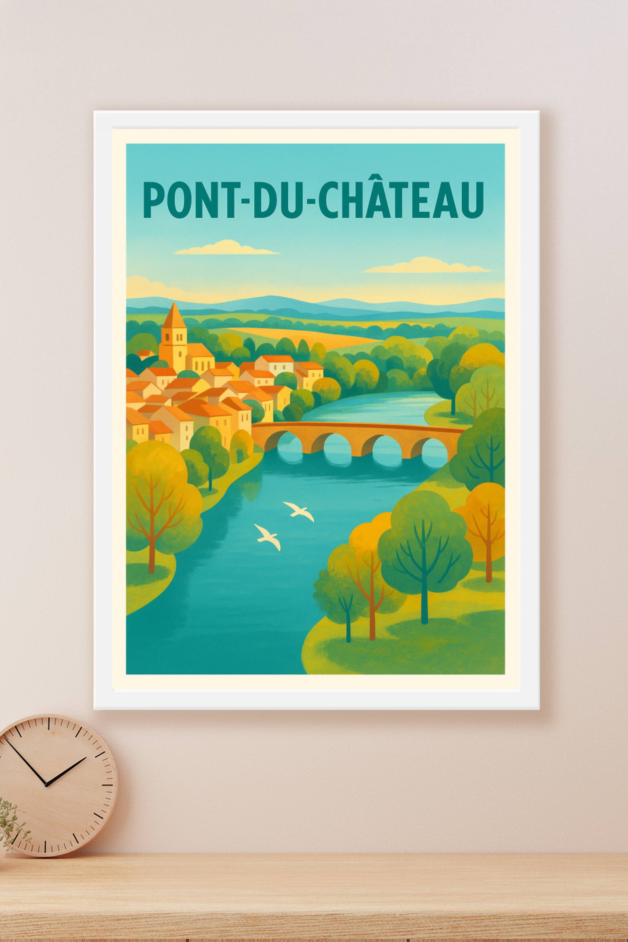 Découvrez la douceur de vivre auvergnate avec cette magnifique affiche illustrée représentant Pont-du-Château, ses maisons chaleureuses, son pont h...