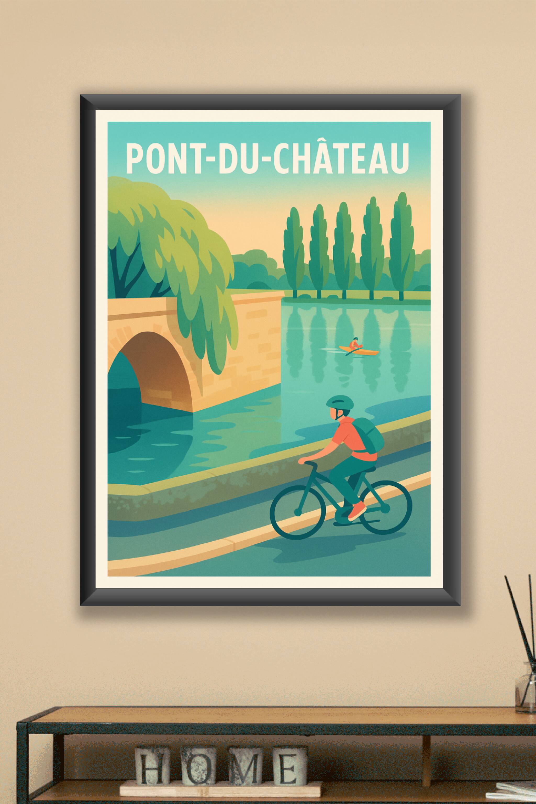 Découvrez le charme paisible de Pont-du-Château avec cette affiche illustrée au style doux et vintage, mettant en scène une promenade à vélo le lon...