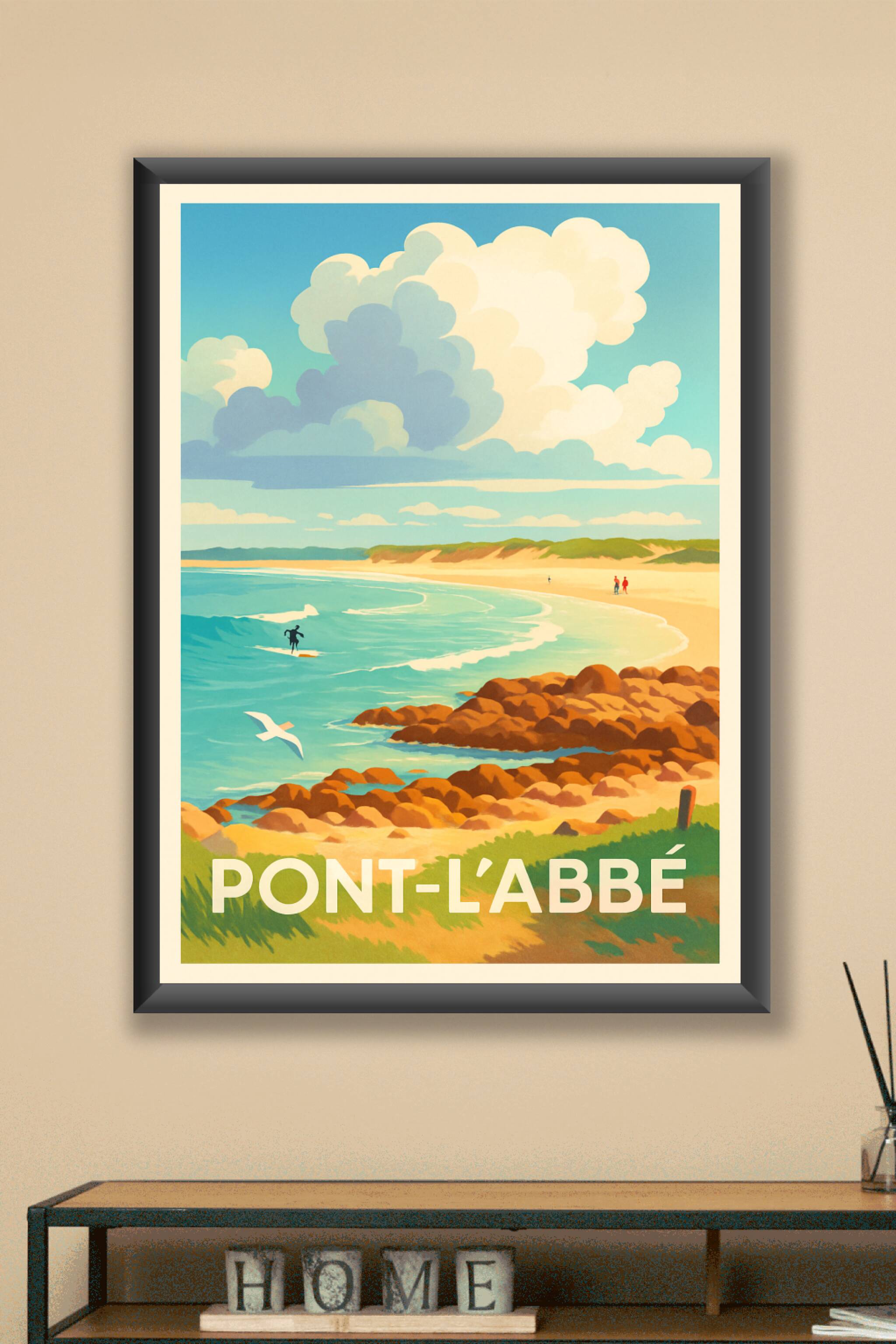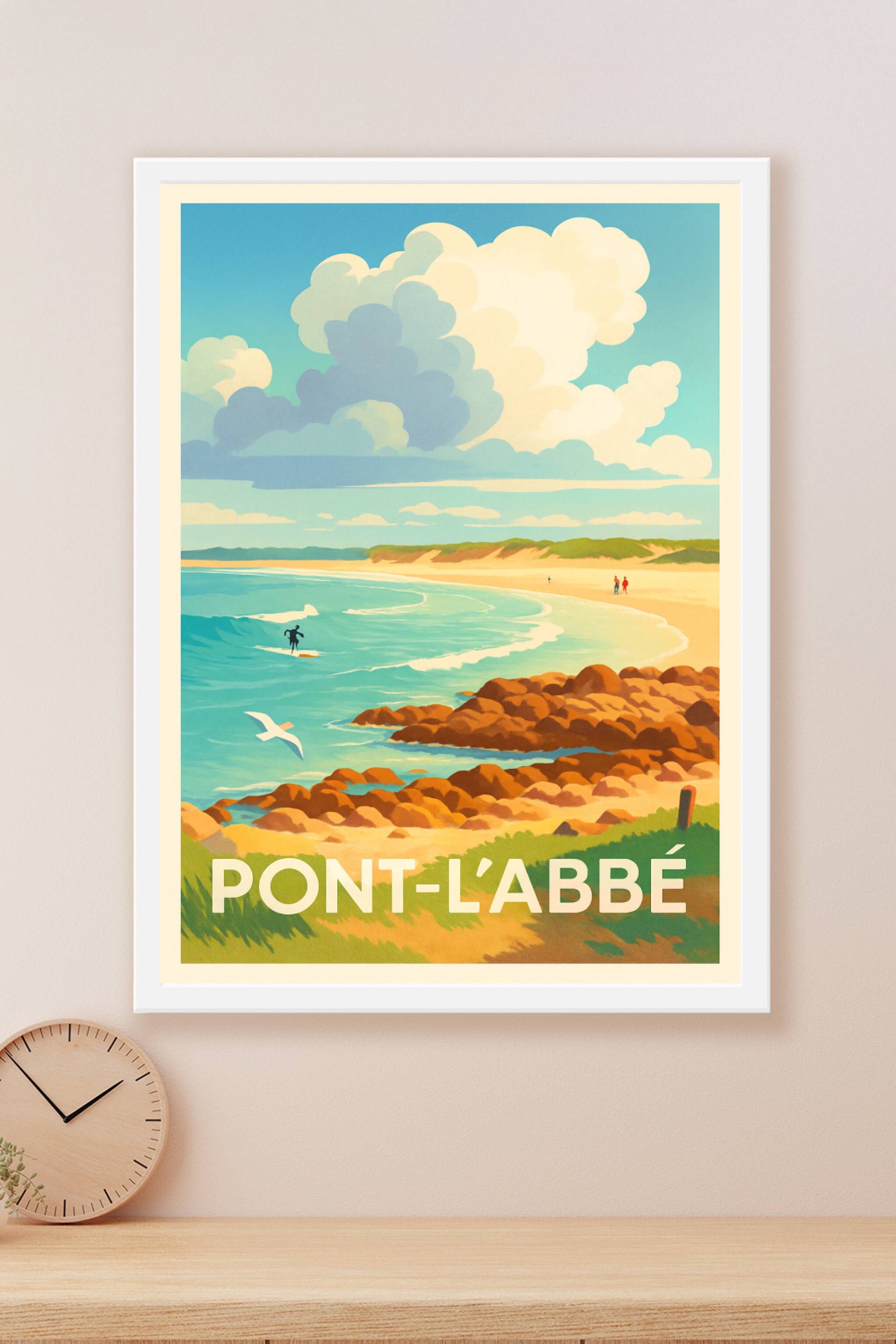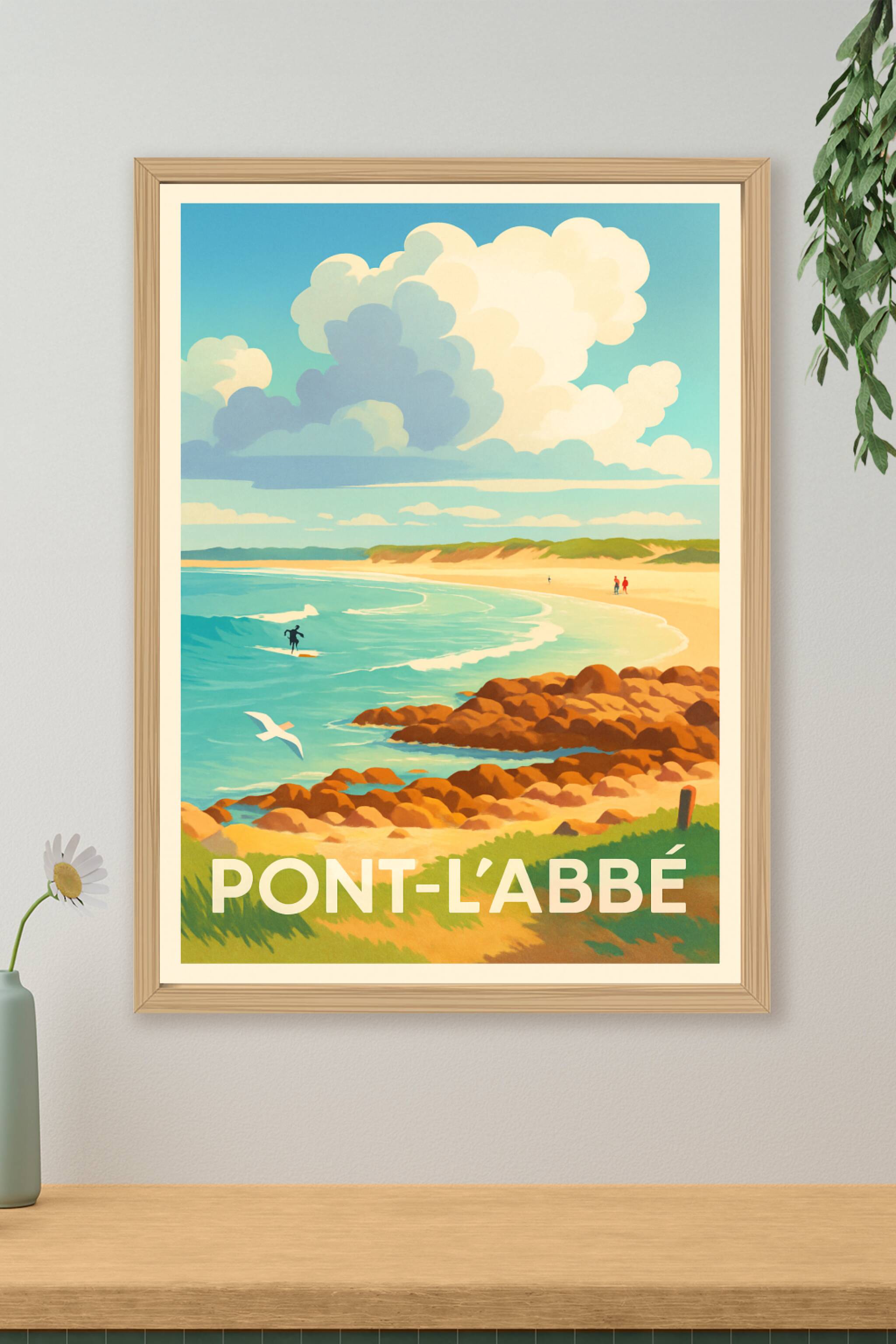 Découvrez la beauté sauvage et apaisante de Pont-l'Abbé à travers cette affiche illustrée au style vintage aux couleurs douces et lumineuses. Cette...