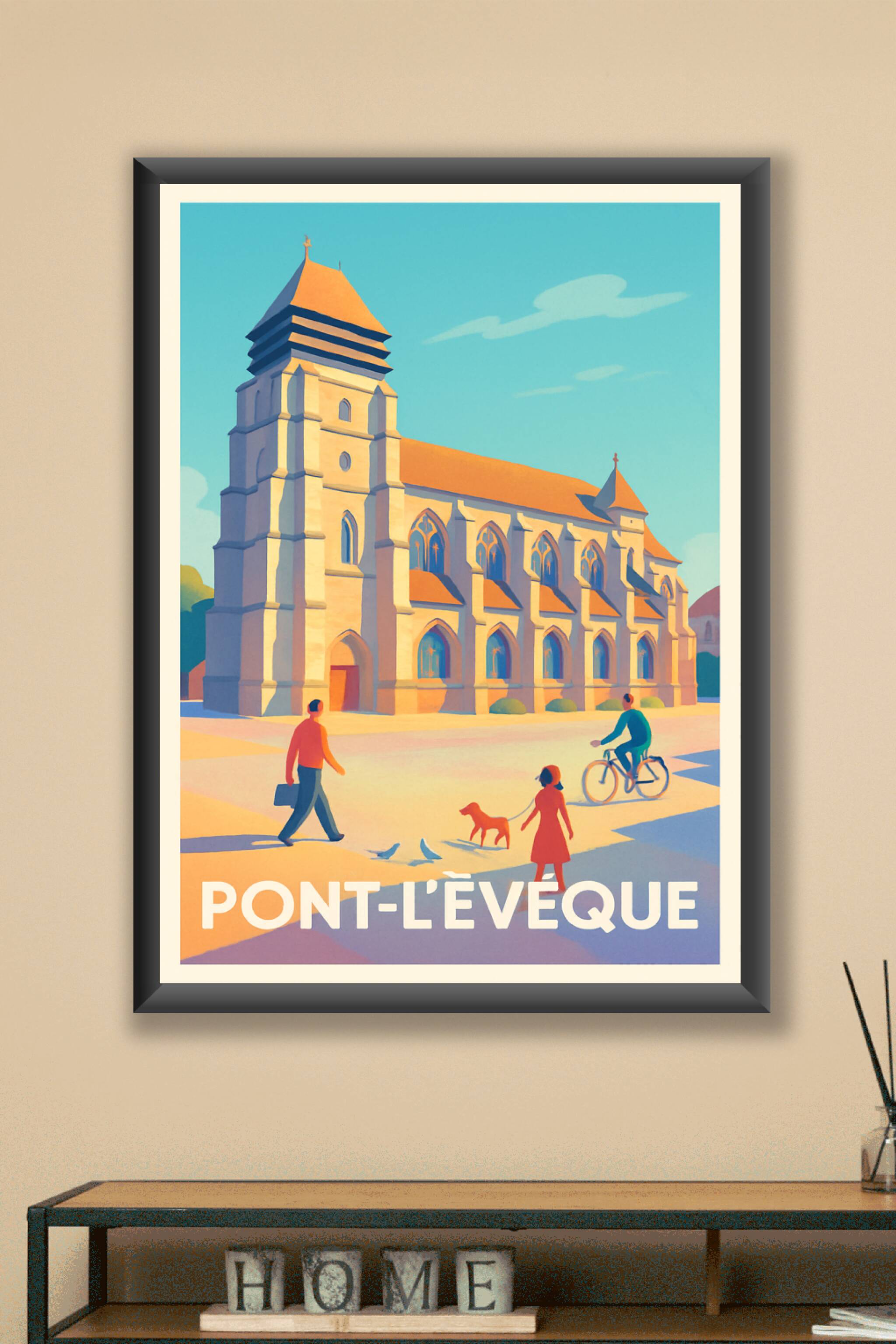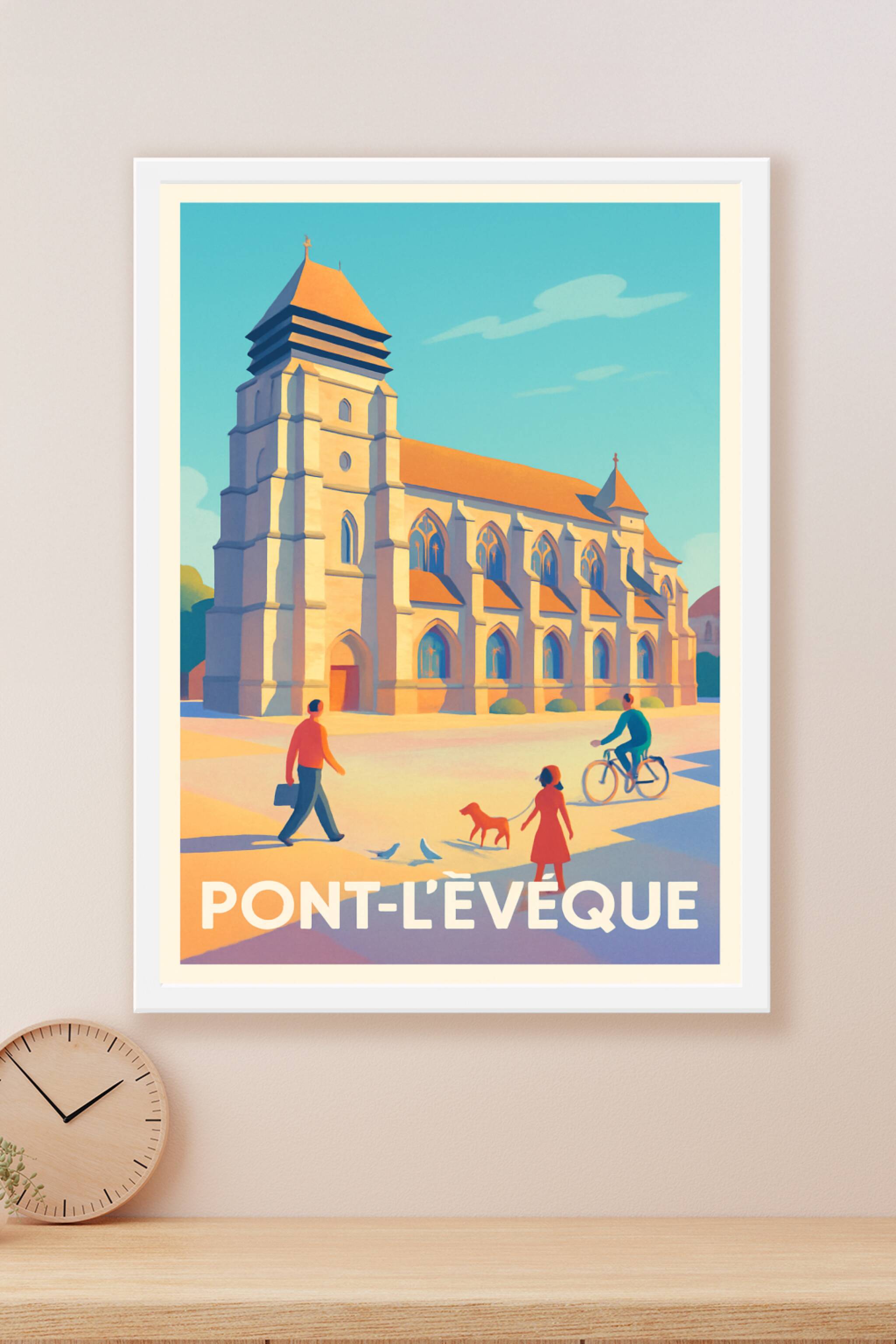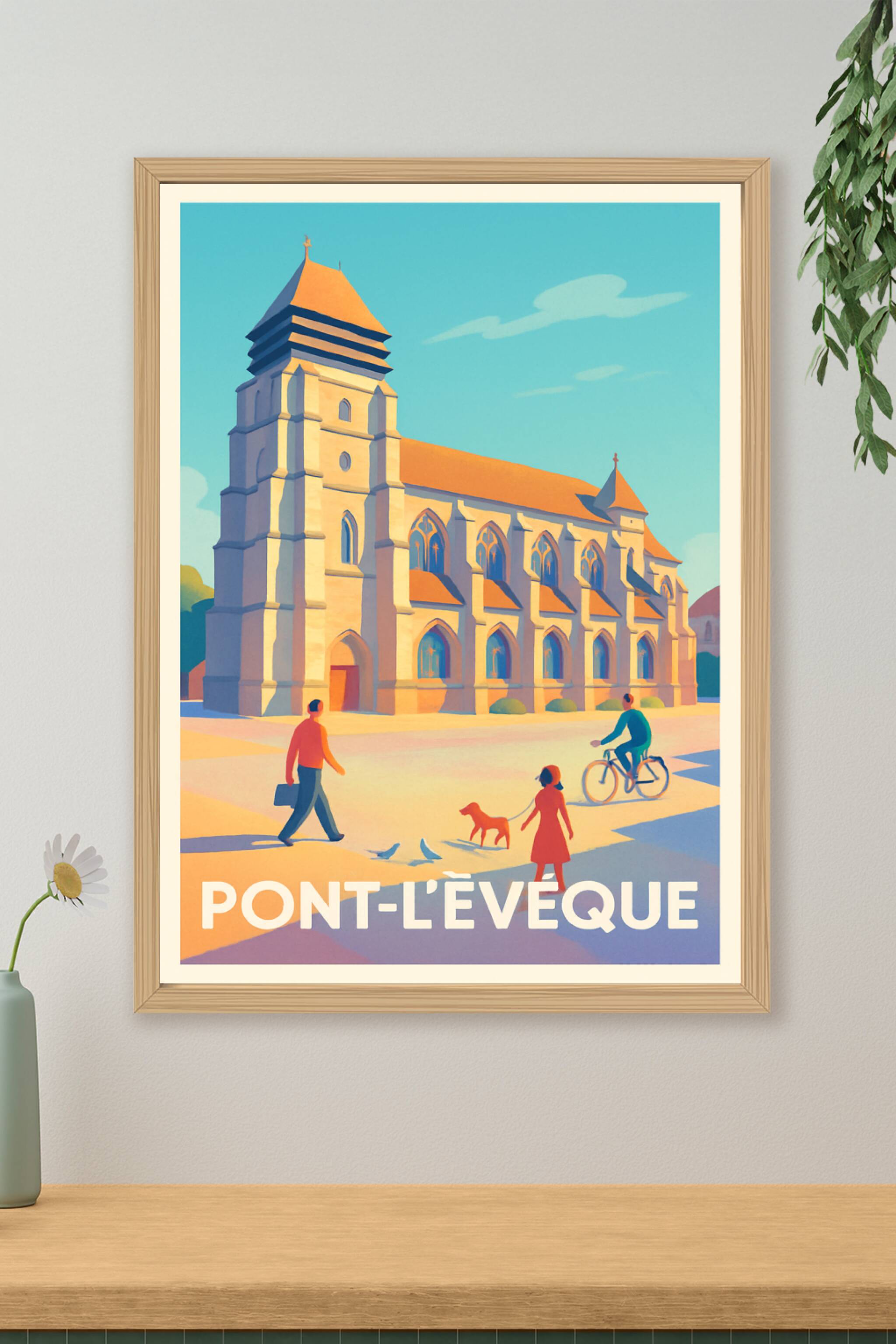 Découvrez l'élégance architecturale de Pont-l'Évêque à travers cette superbe affiche illustrée, mettant en lumière un monument emblématique baigné ...