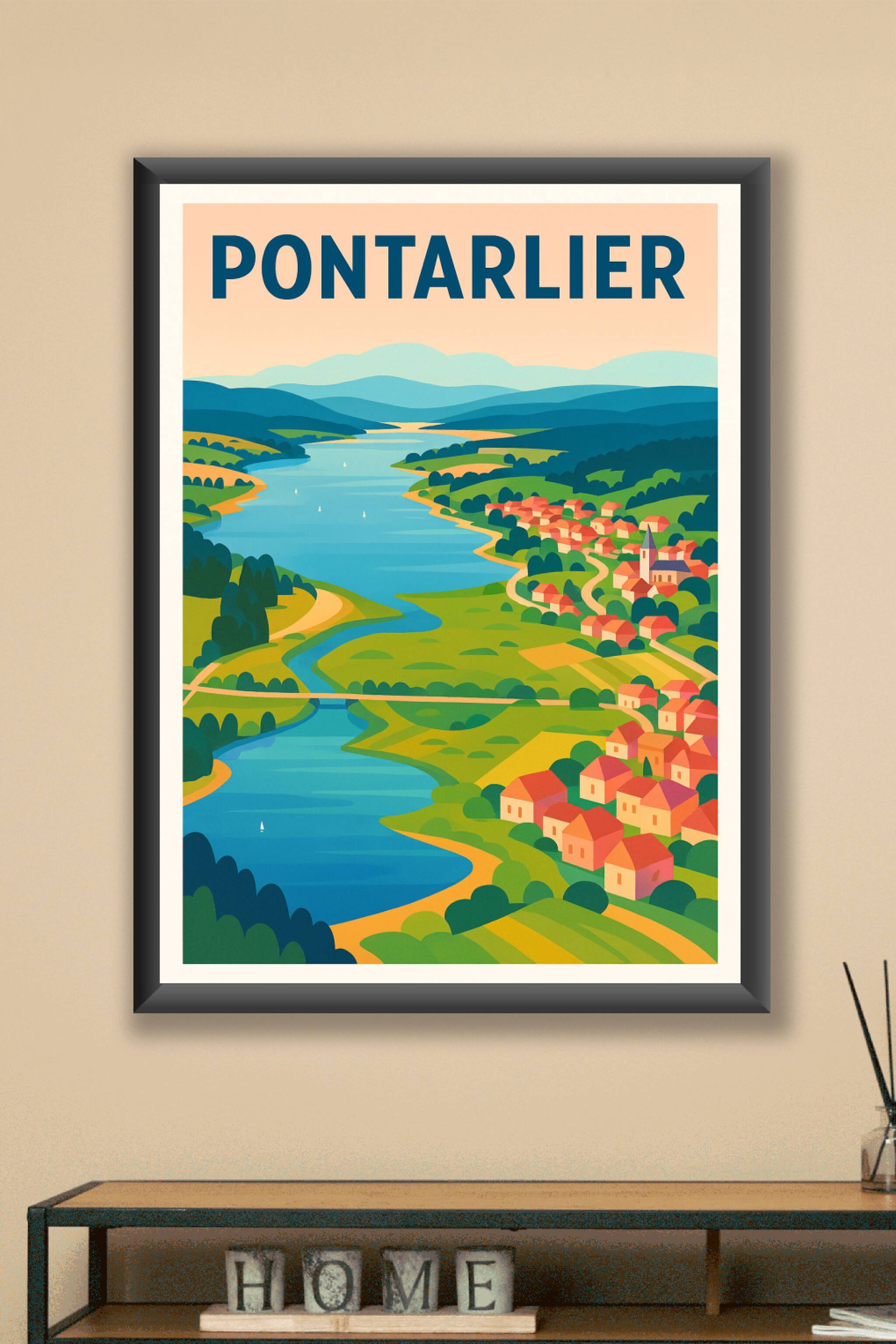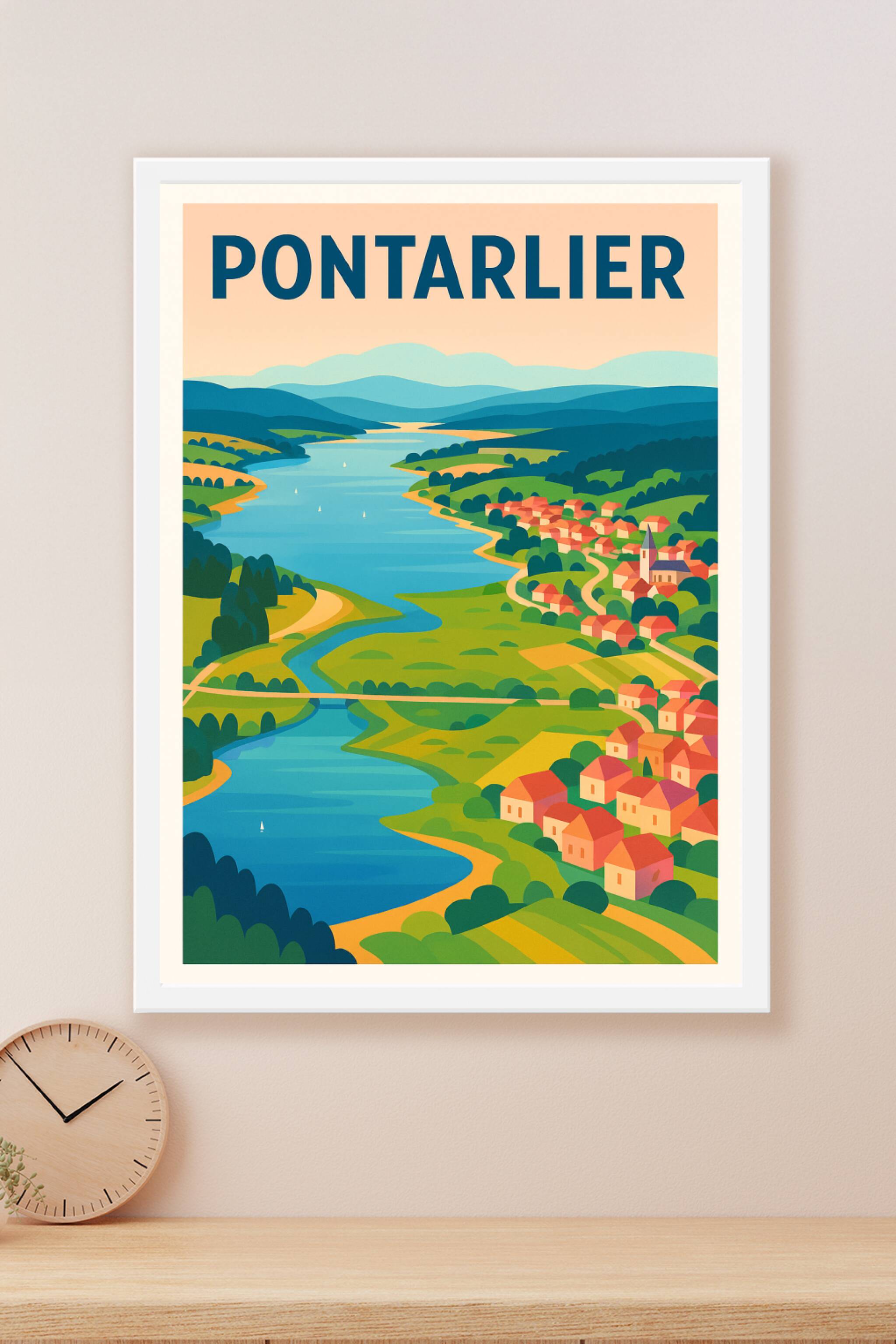 Découvrez la beauté paisible de Pontarlier avec cette affiche illustrée aux couleurs douces et harmonieuses. Ce poster met en valeur les paysages v...