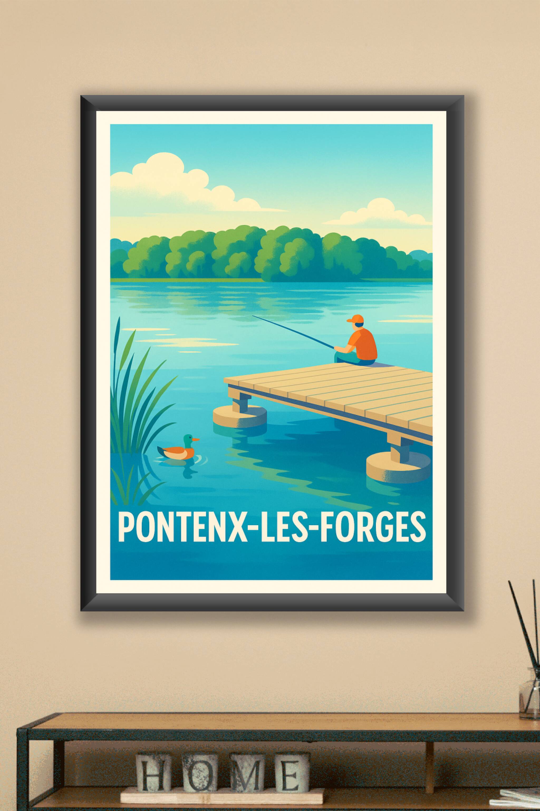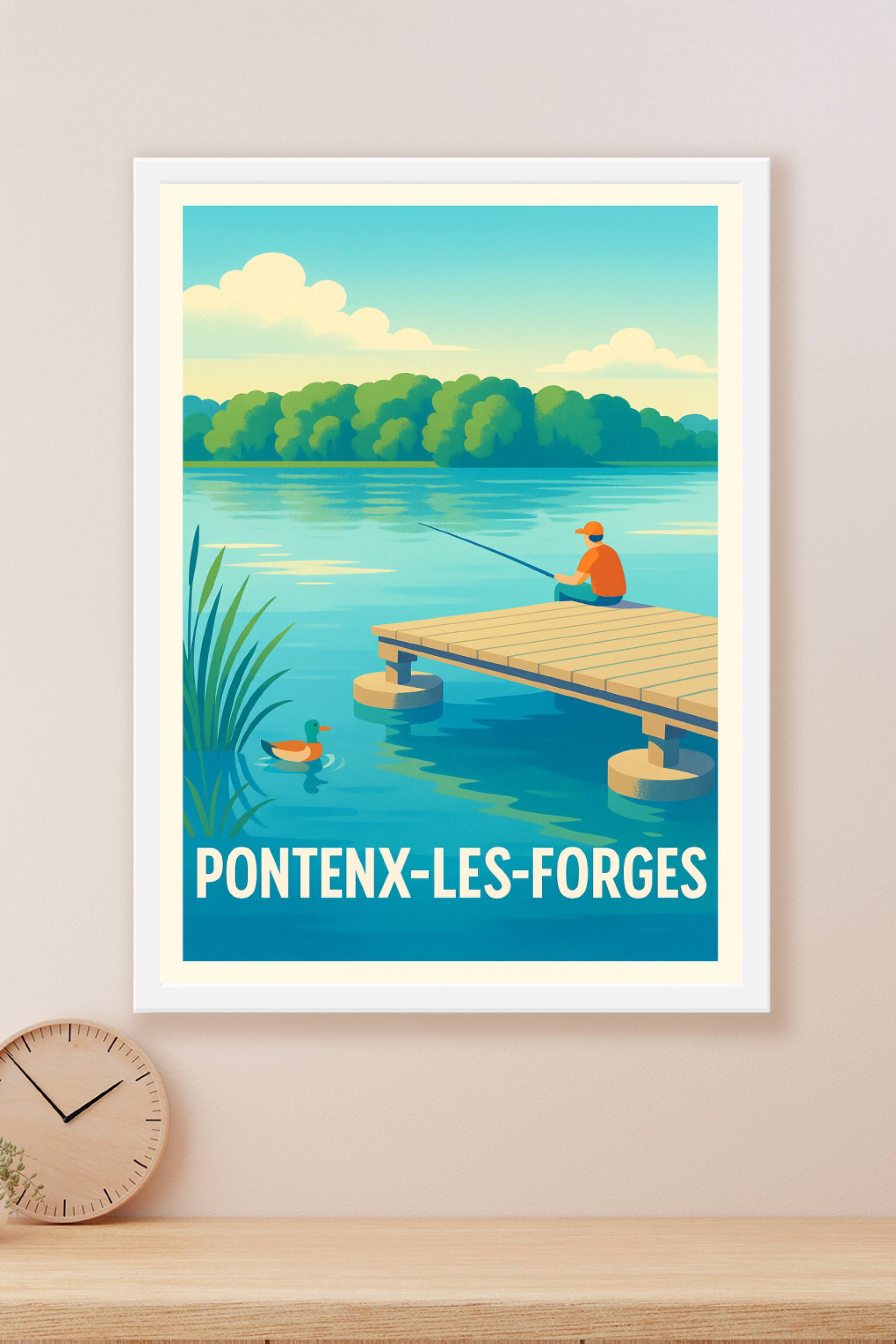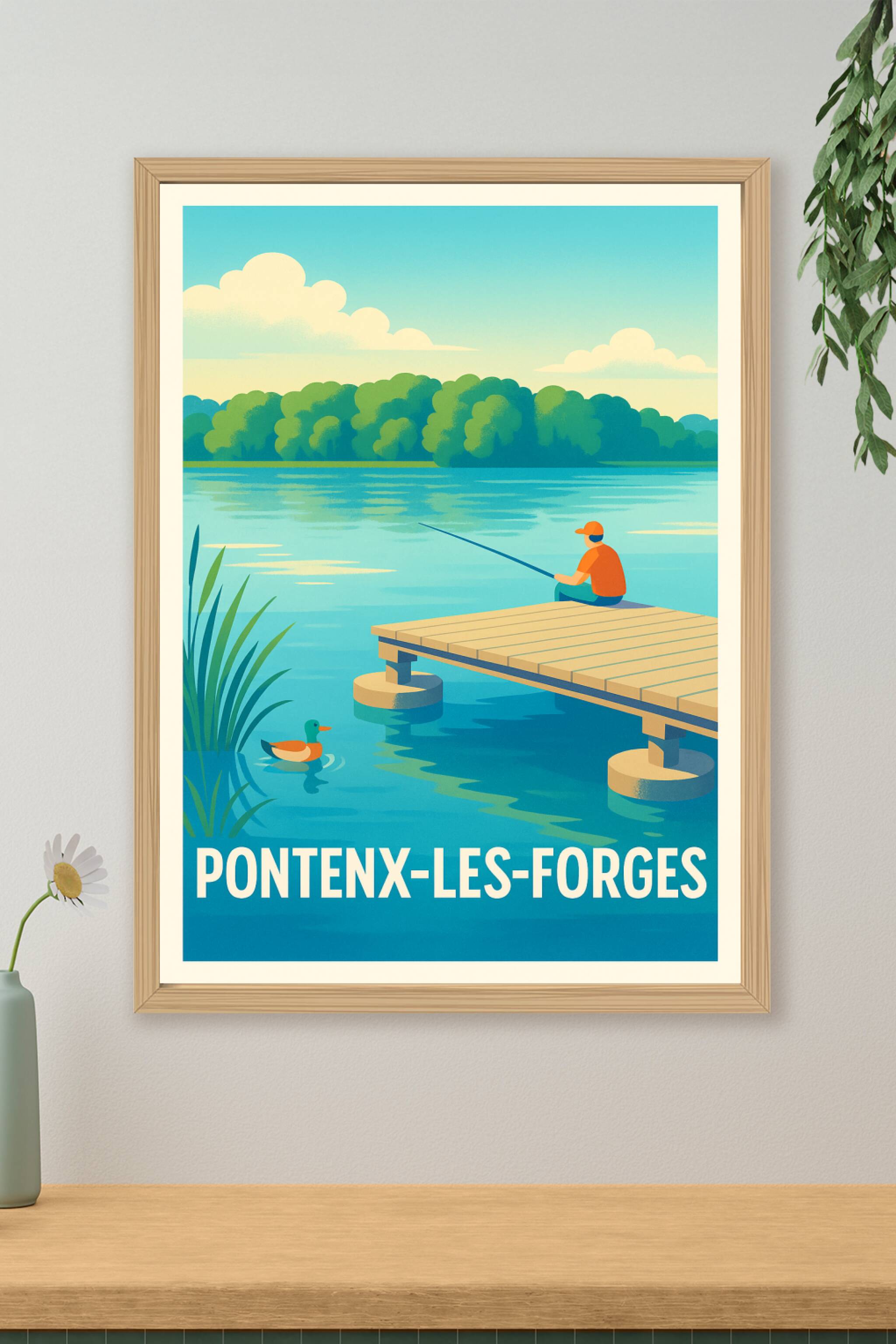 Offrez-vous une pause détente au cœur de la nature avec cette superbe affiche illustrée de Pontenx-les-Forges, mettant en scène un pêcheur tranquil...