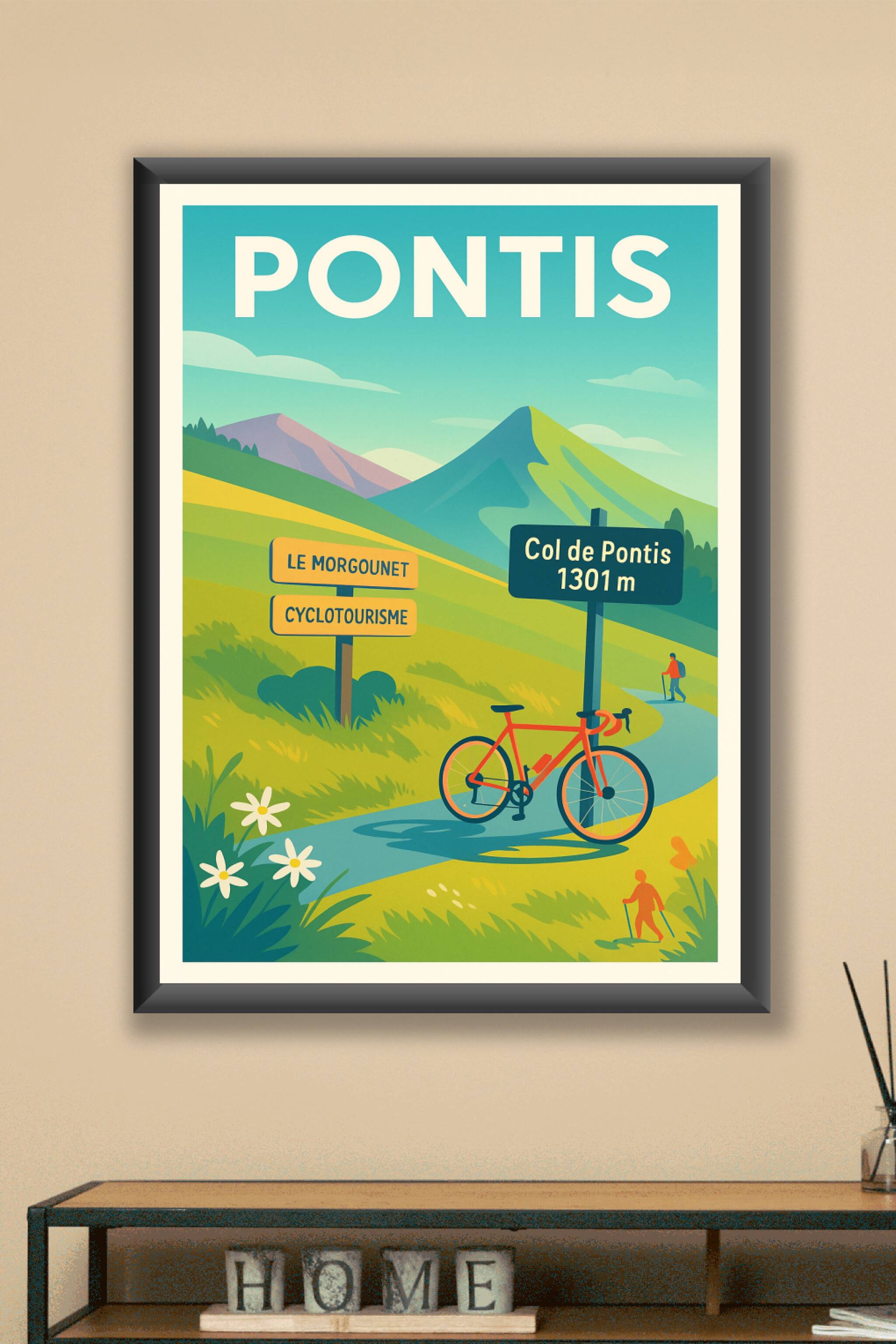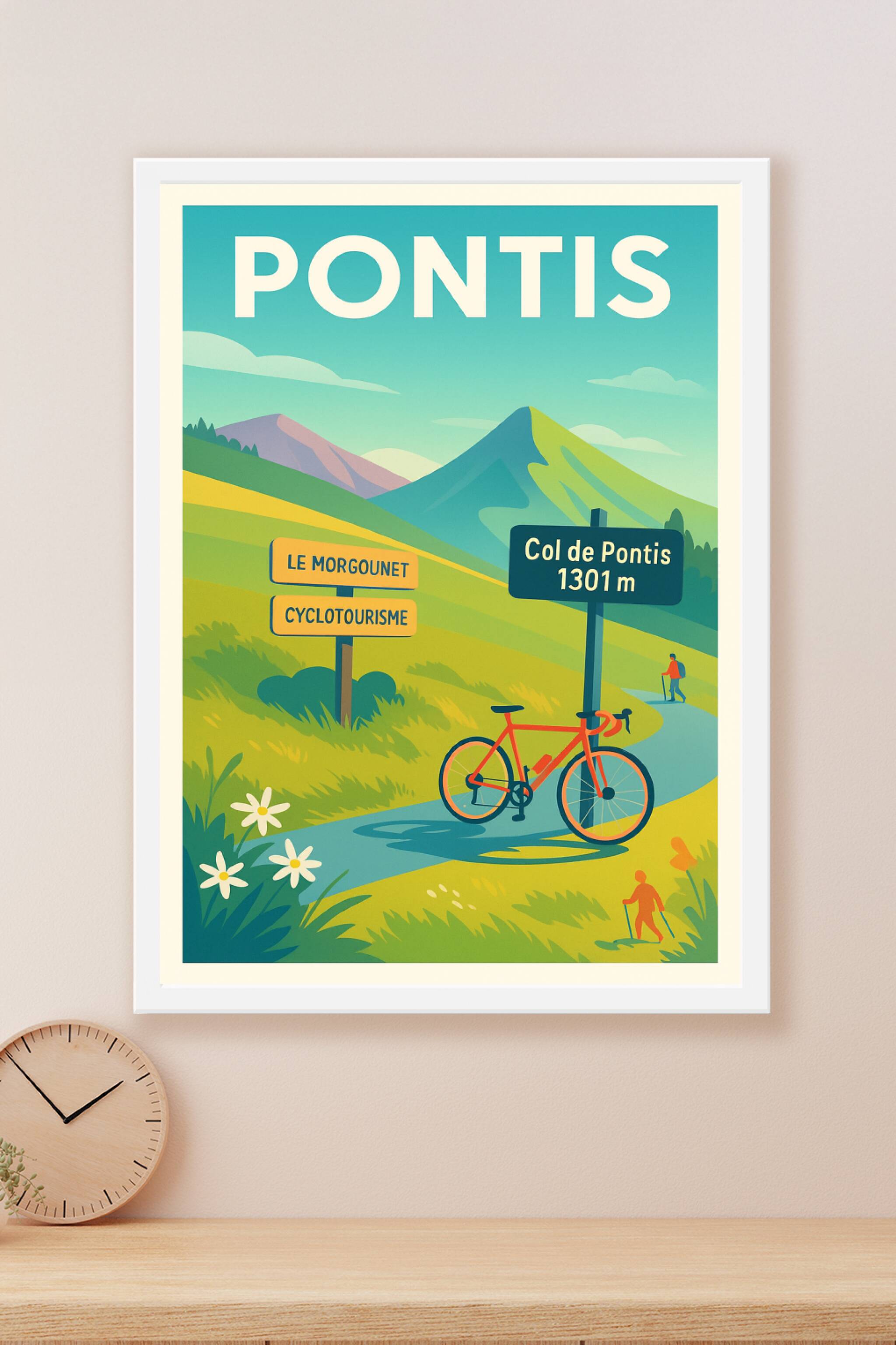 Découvrez le charme paisible du Col de Pontis à 1301 m d'altitude avec cette affiche illustrée d'un style rétro et coloré, idéale pour les amateurs...
