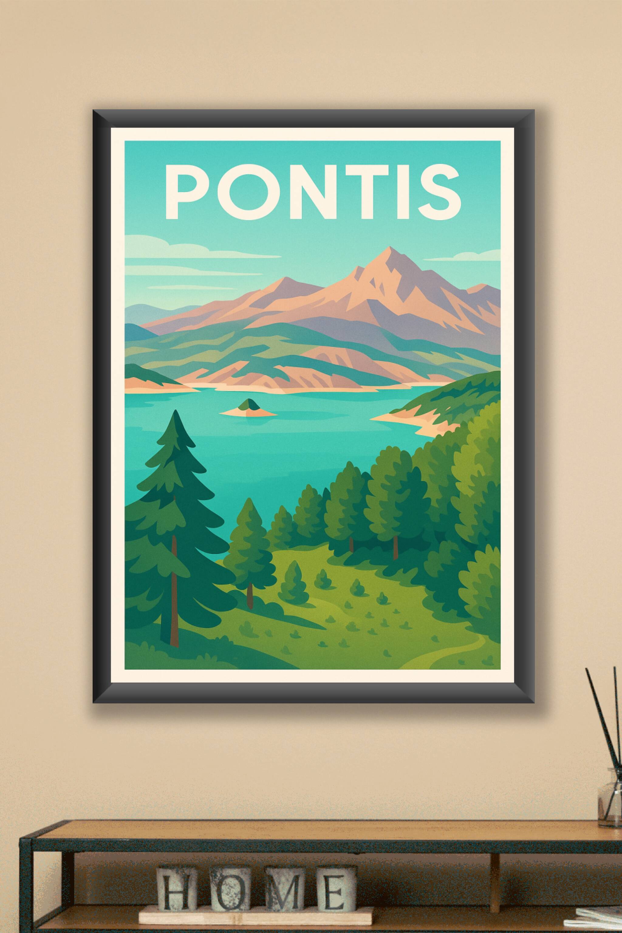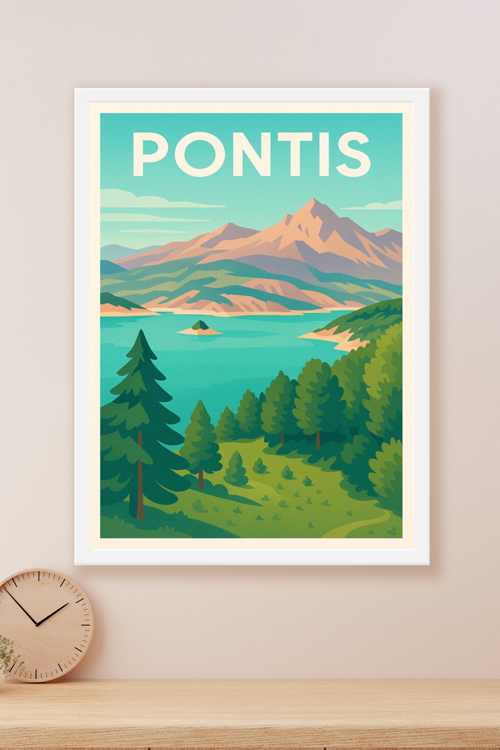 Découvrez la beauté naturelle de Pontis à travers cette affiche illustrée au style vintage, mettant en valeur ses montagnes majestueuses et ses eau...
