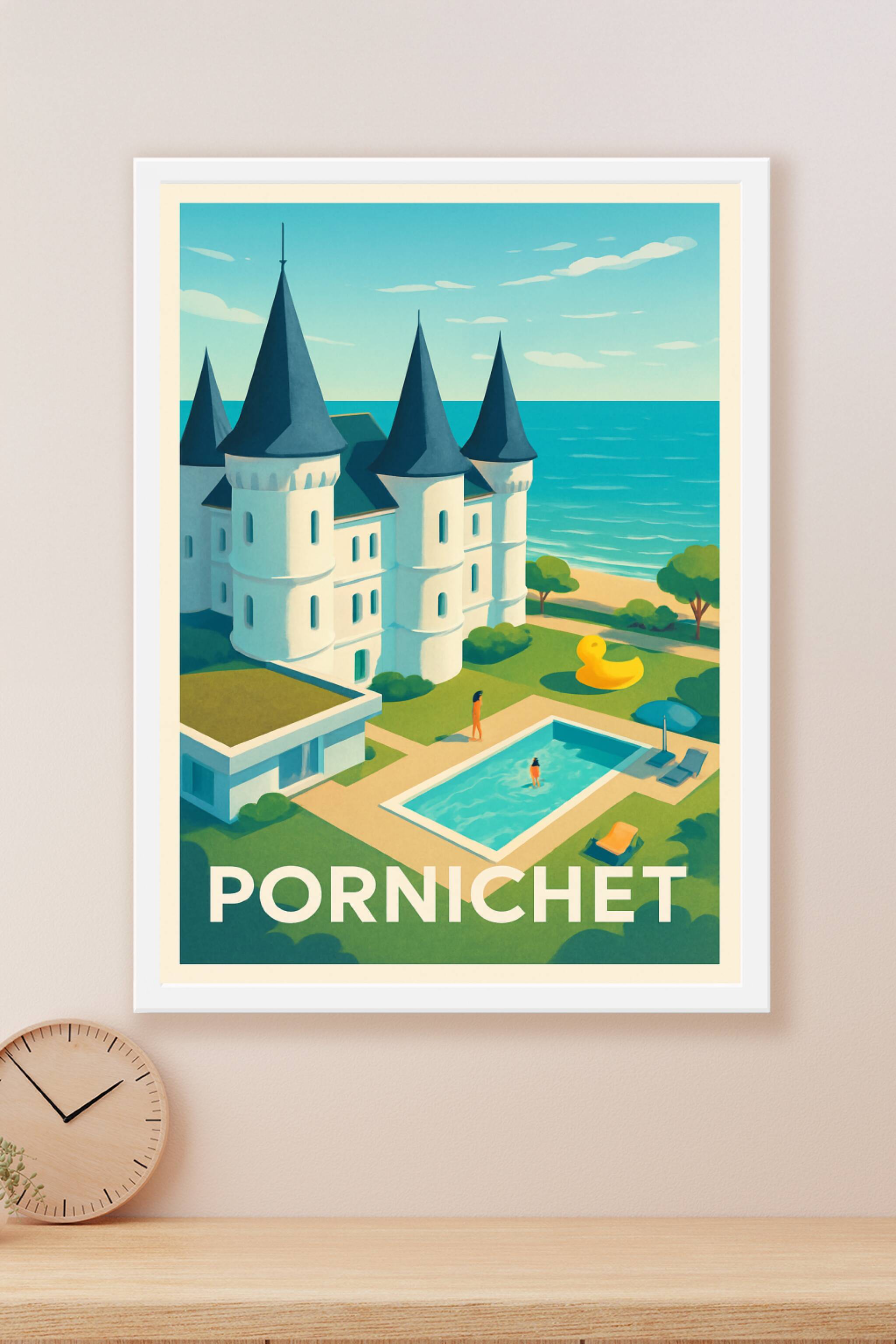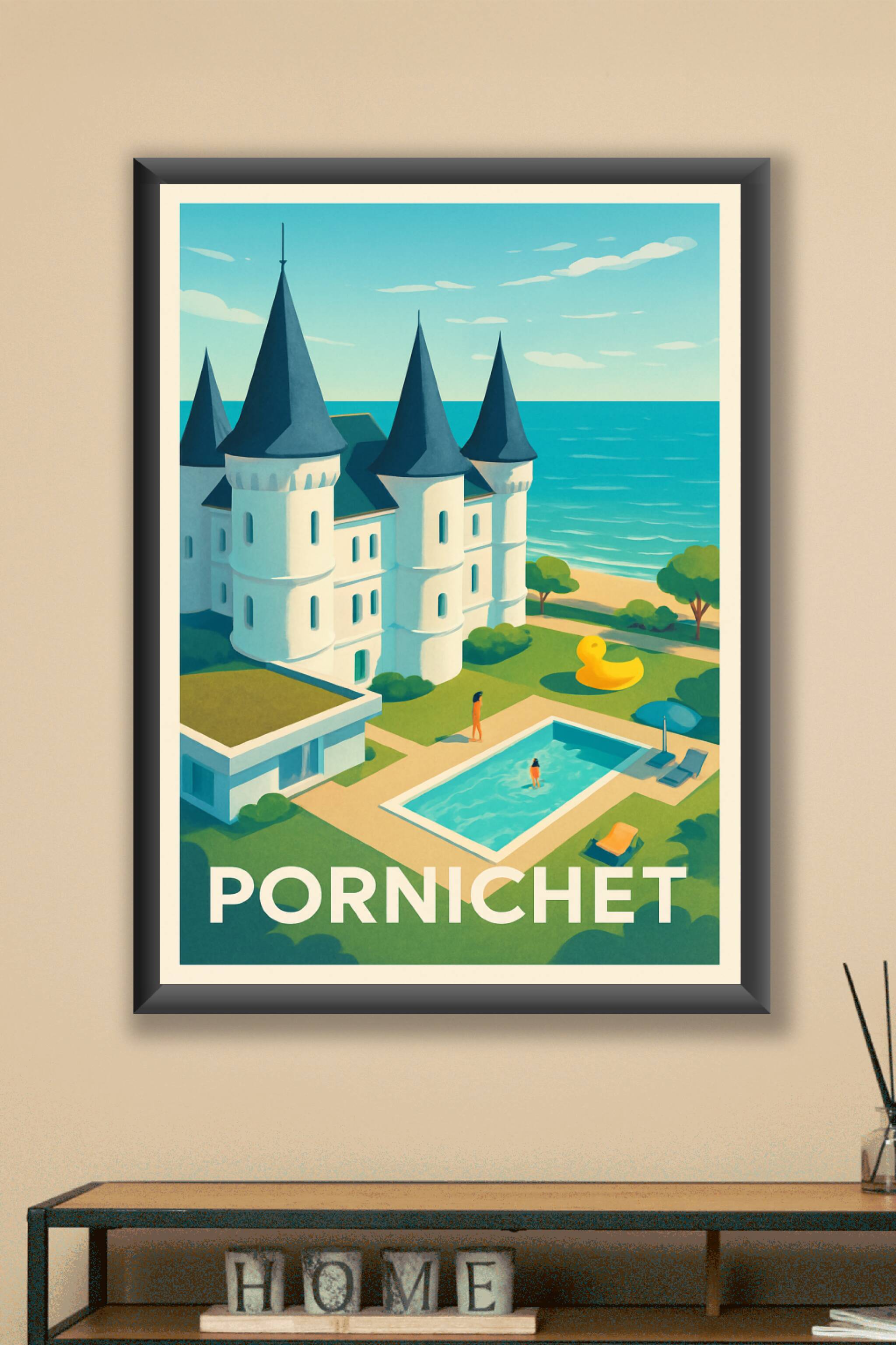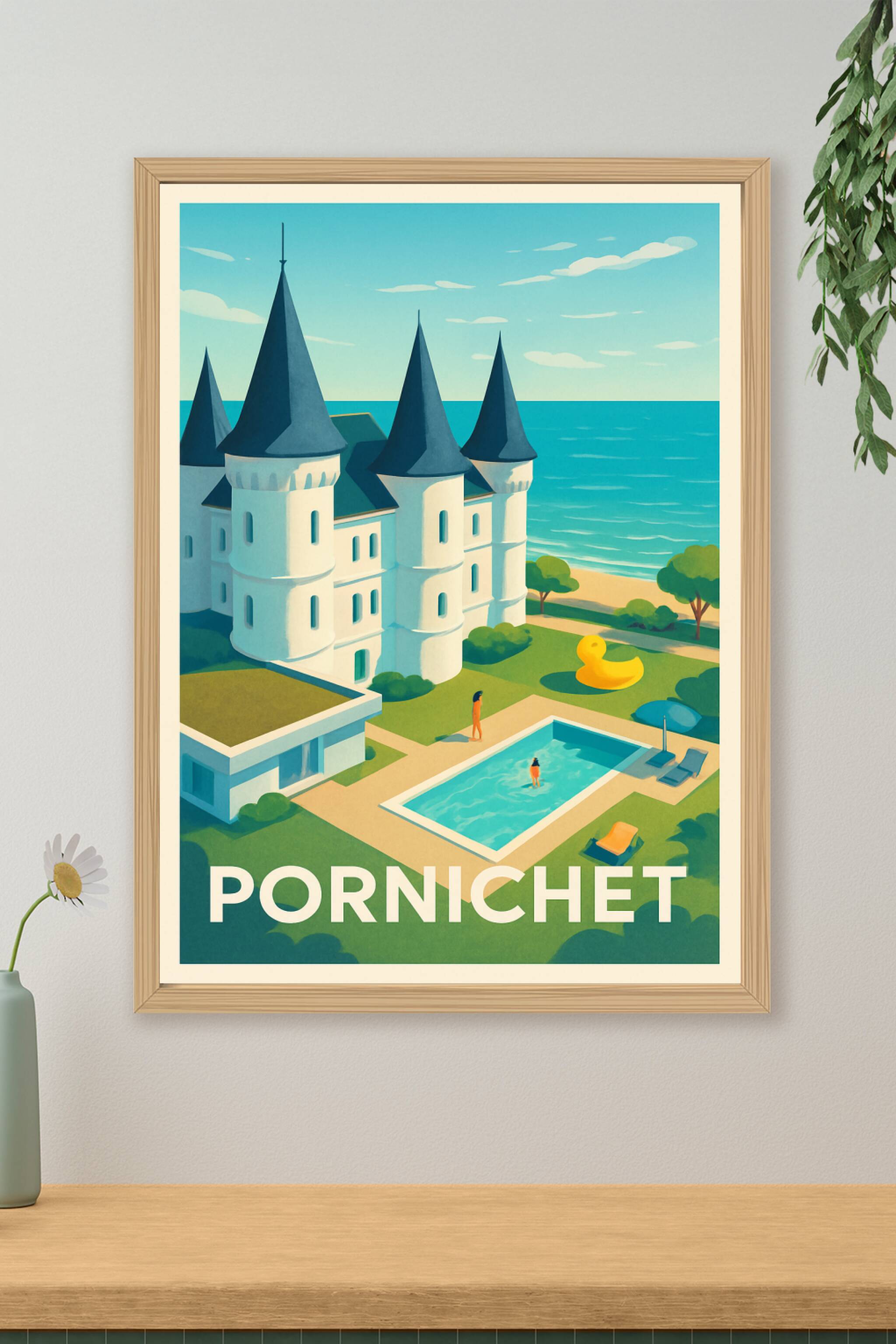 Découvrez l'élégance balnéaire de Pornichet à travers cette affiche au style vintage et lumineux, mettant en scène un château emblématique au bord ...