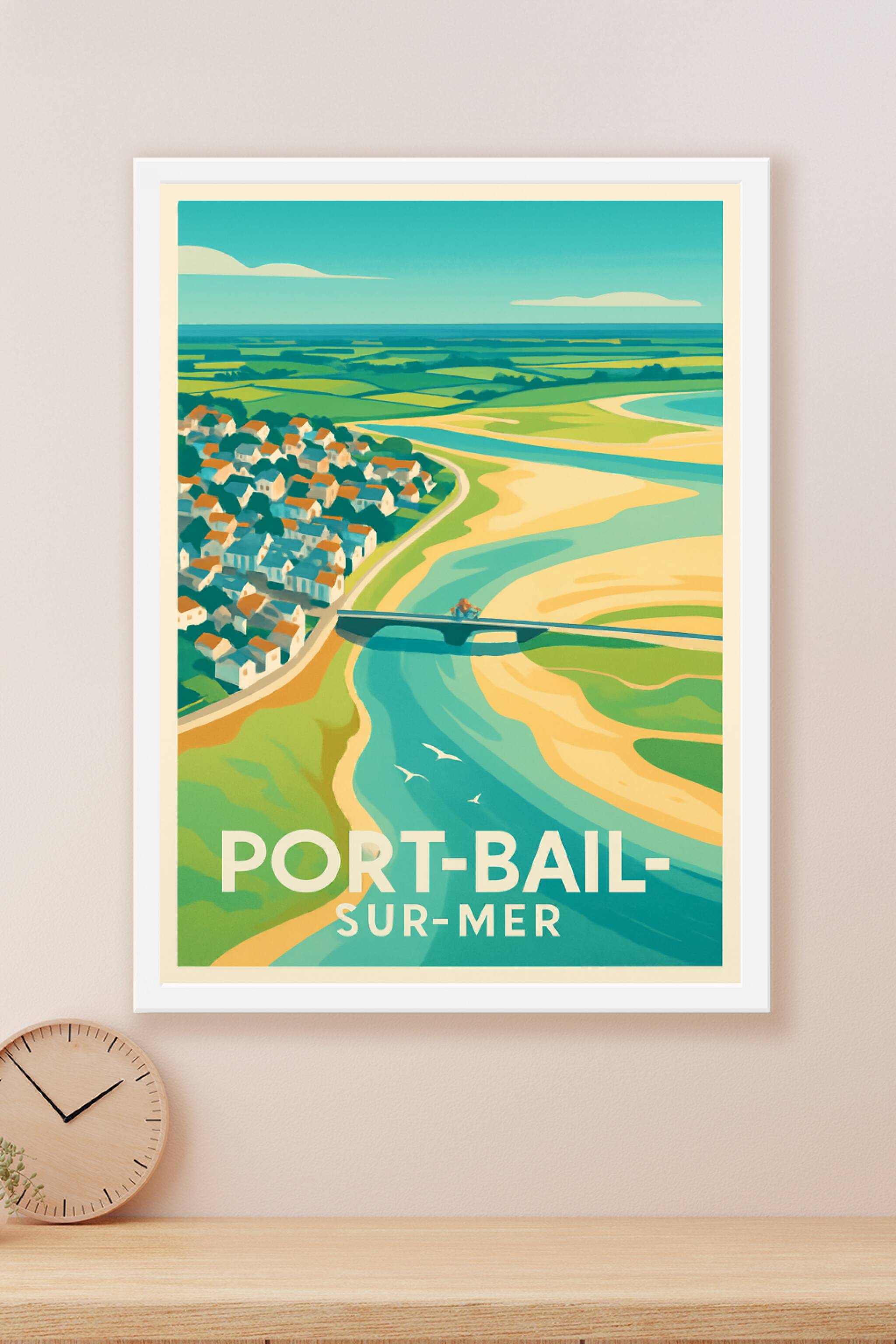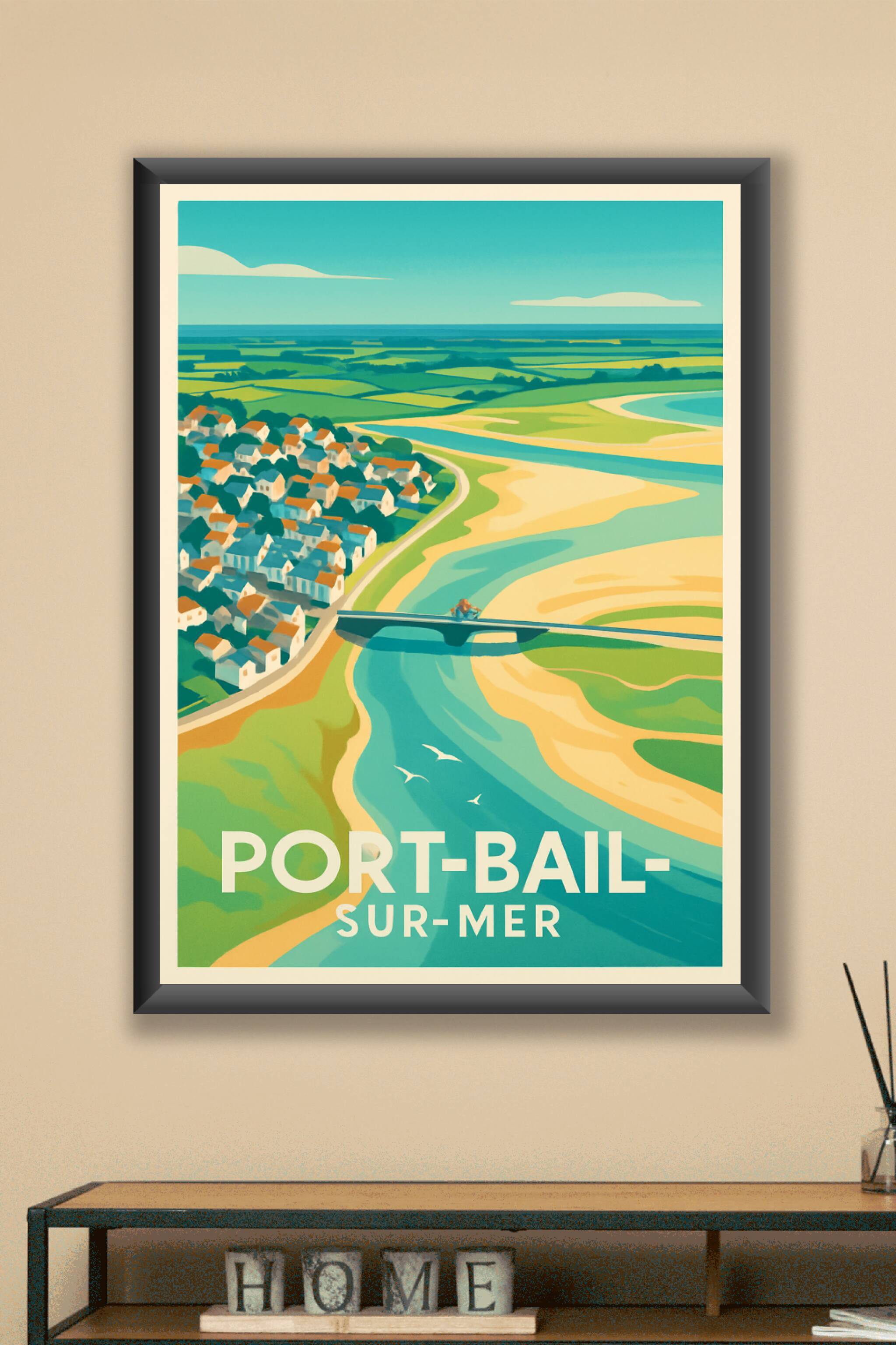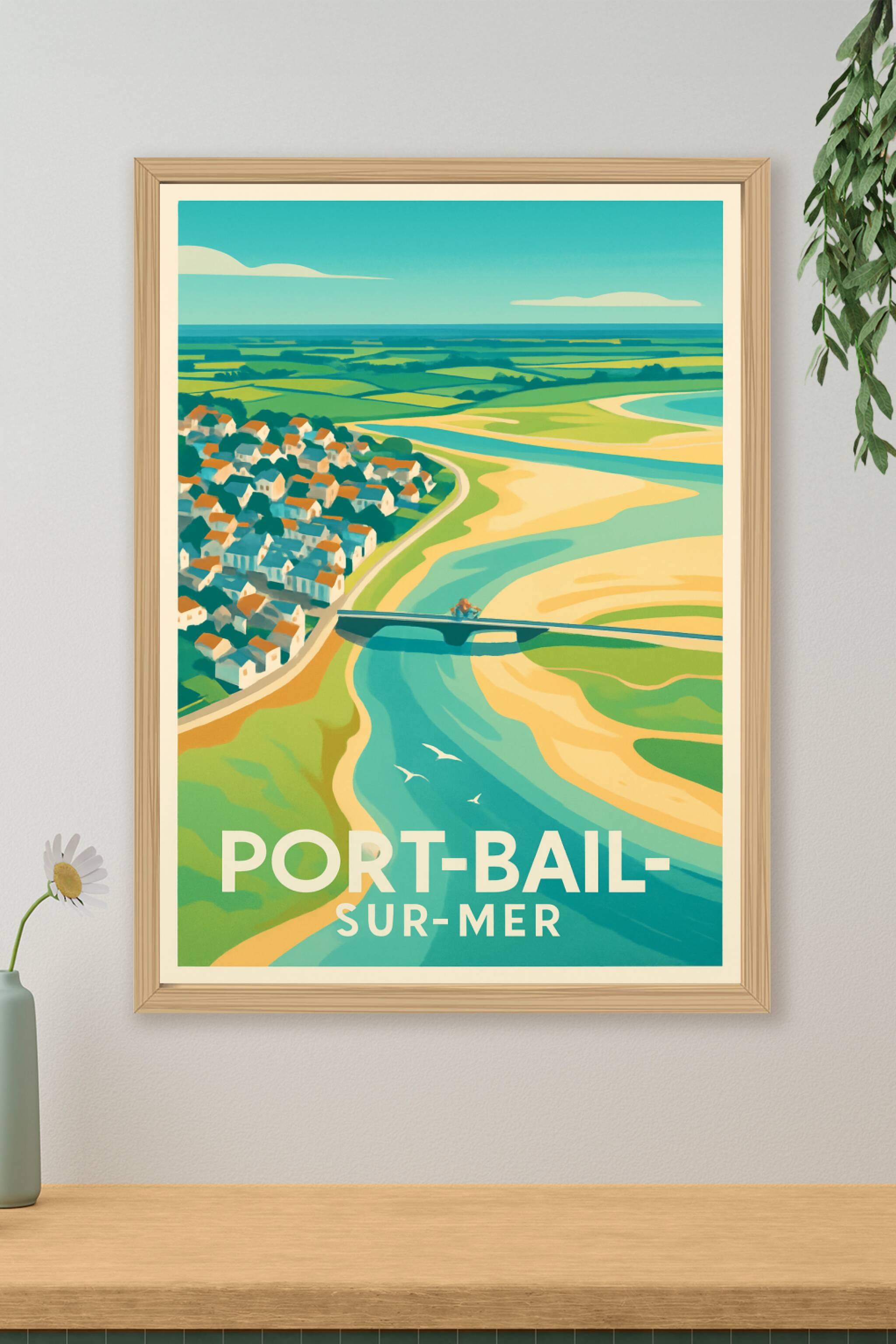 Découvrez la douceur de vivre de Port-Bail-sur-Mer à travers cette affiche au style vintage et coloré qui illustre le charme paisible de cette vill...
