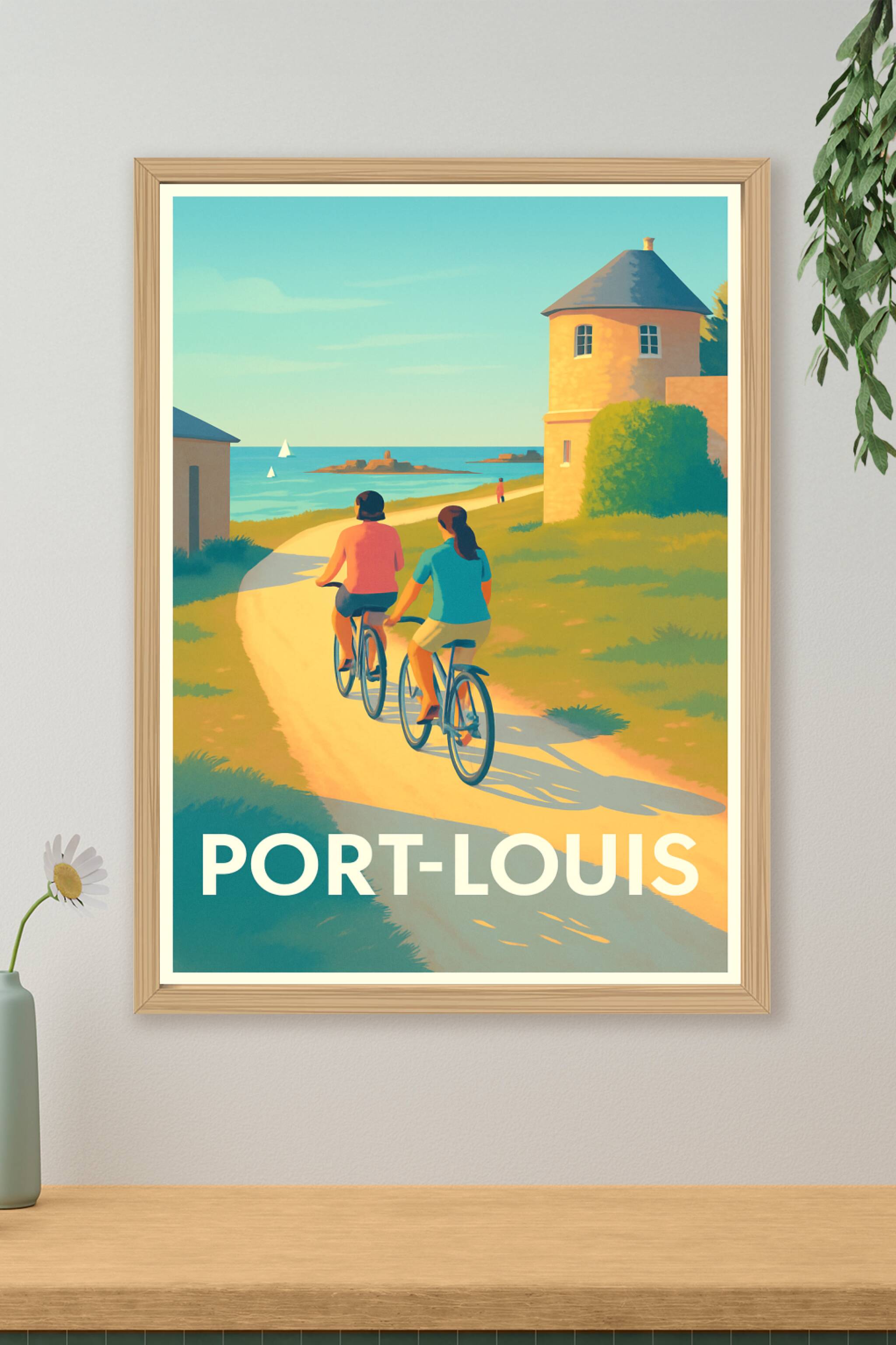 Découvrez la douceur de vivre bretonne avec ce poster illustré capturant une promenade à vélo sur les sentiers côtiers de Port-Louis. L'ambiance pa...