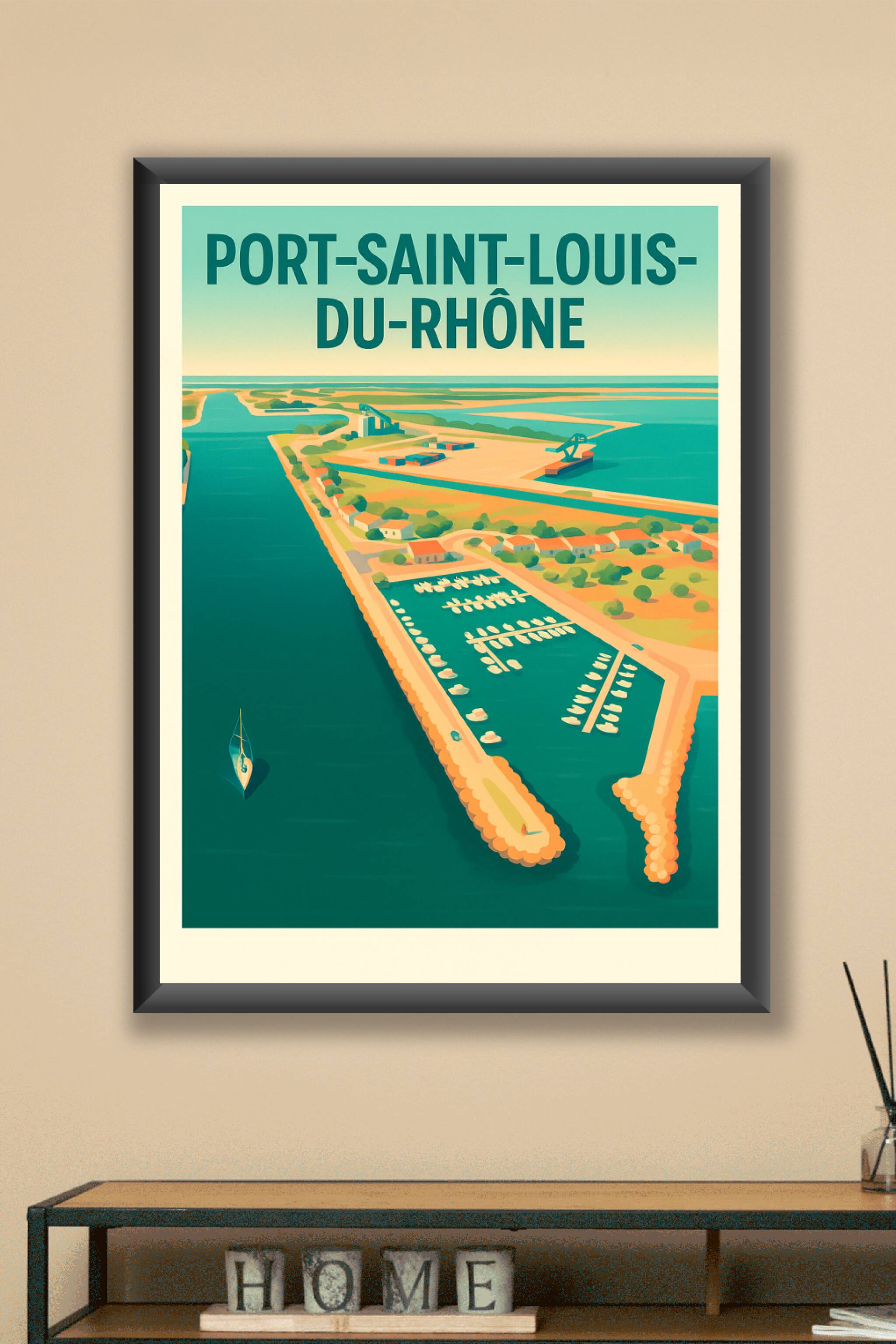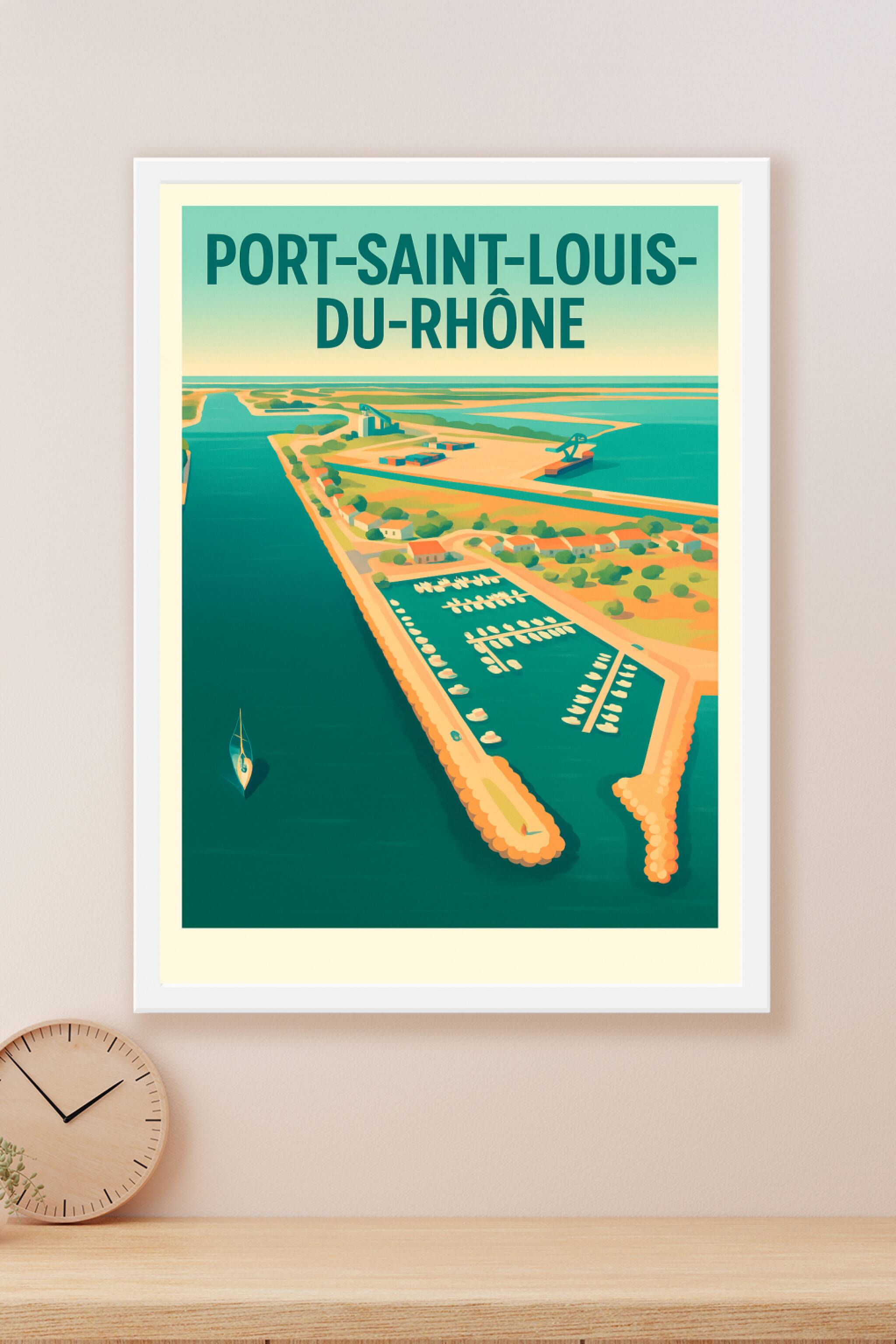 Découvrez l'élégance sereine de Port-Saint-Louis-du-Rhône avec cette affiche illustrée, mettant en lumière son port et ses paysages aquatiques typi...