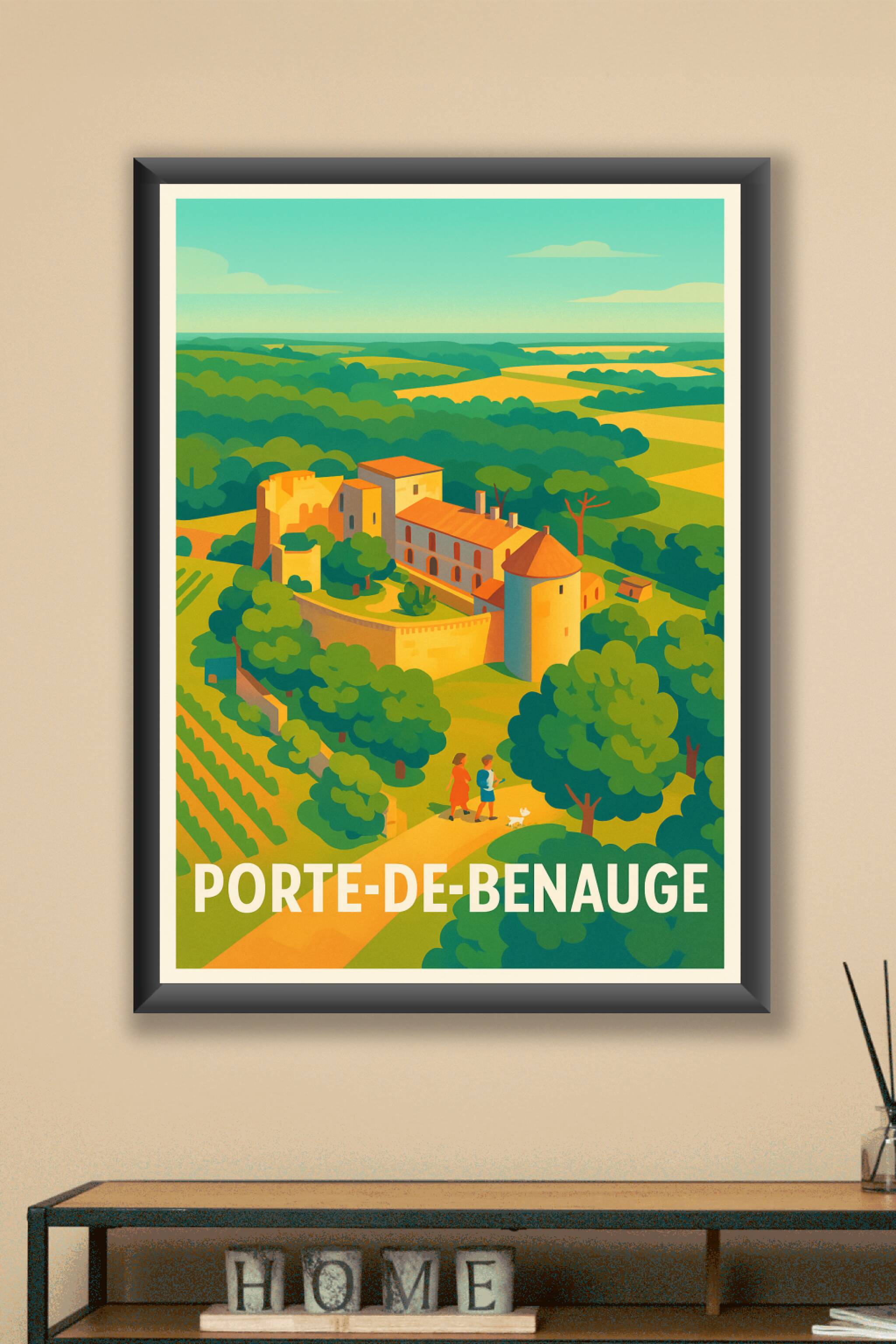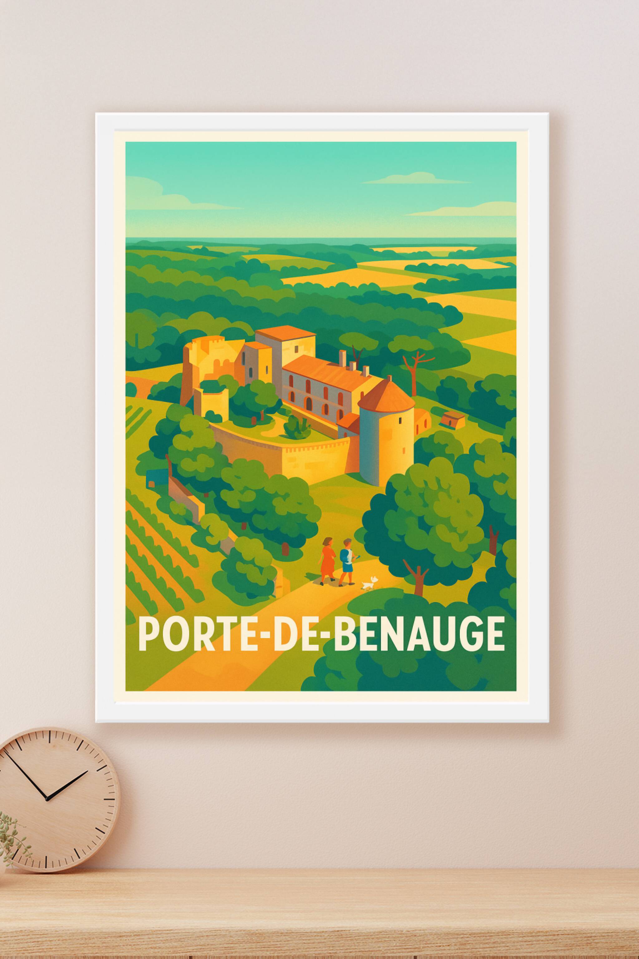 Découvrez l'élégance paisible de Porte-de-Benauge avec cette affiche au rendu vintage, illustrant un site historique entouré de verdure et de champ...