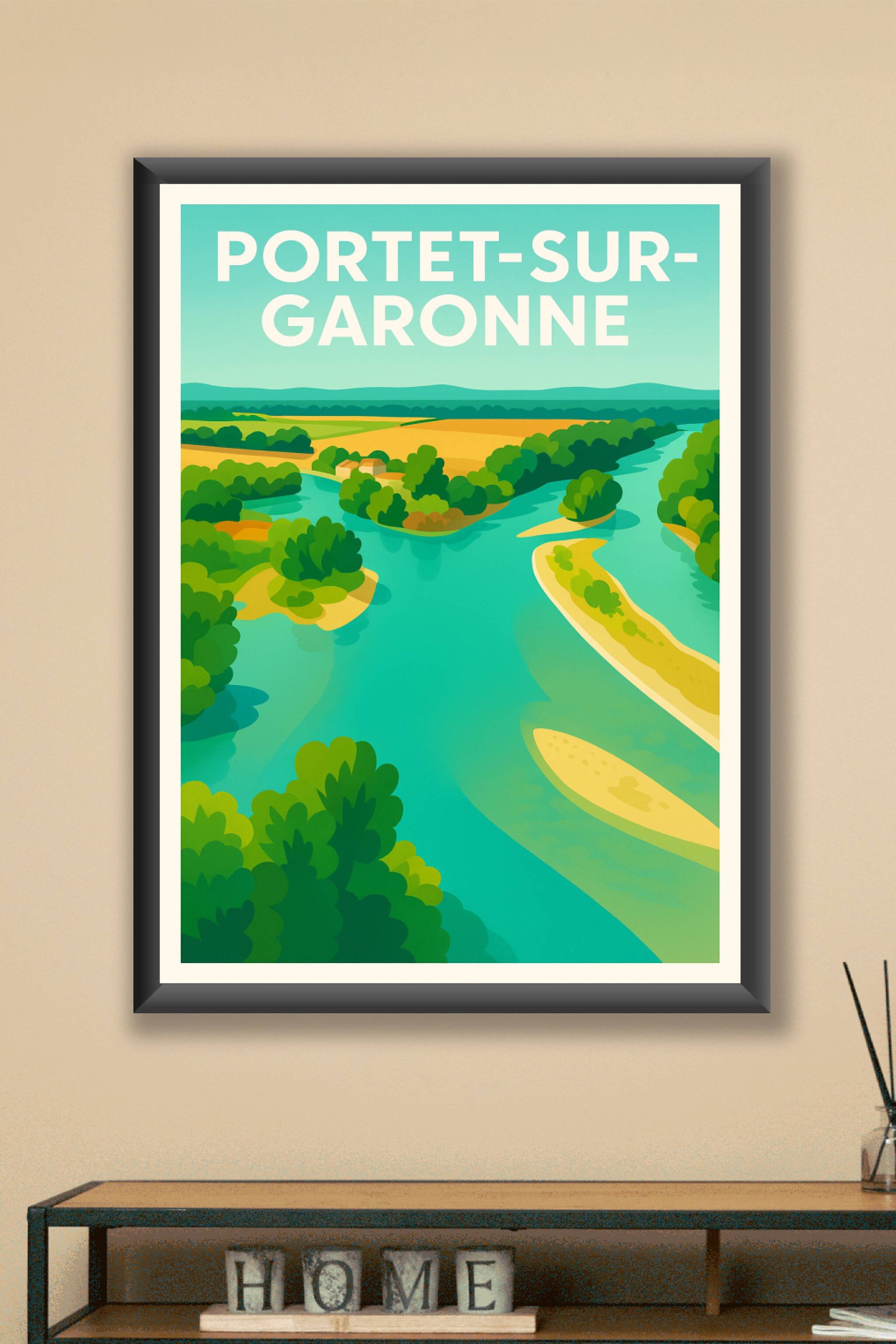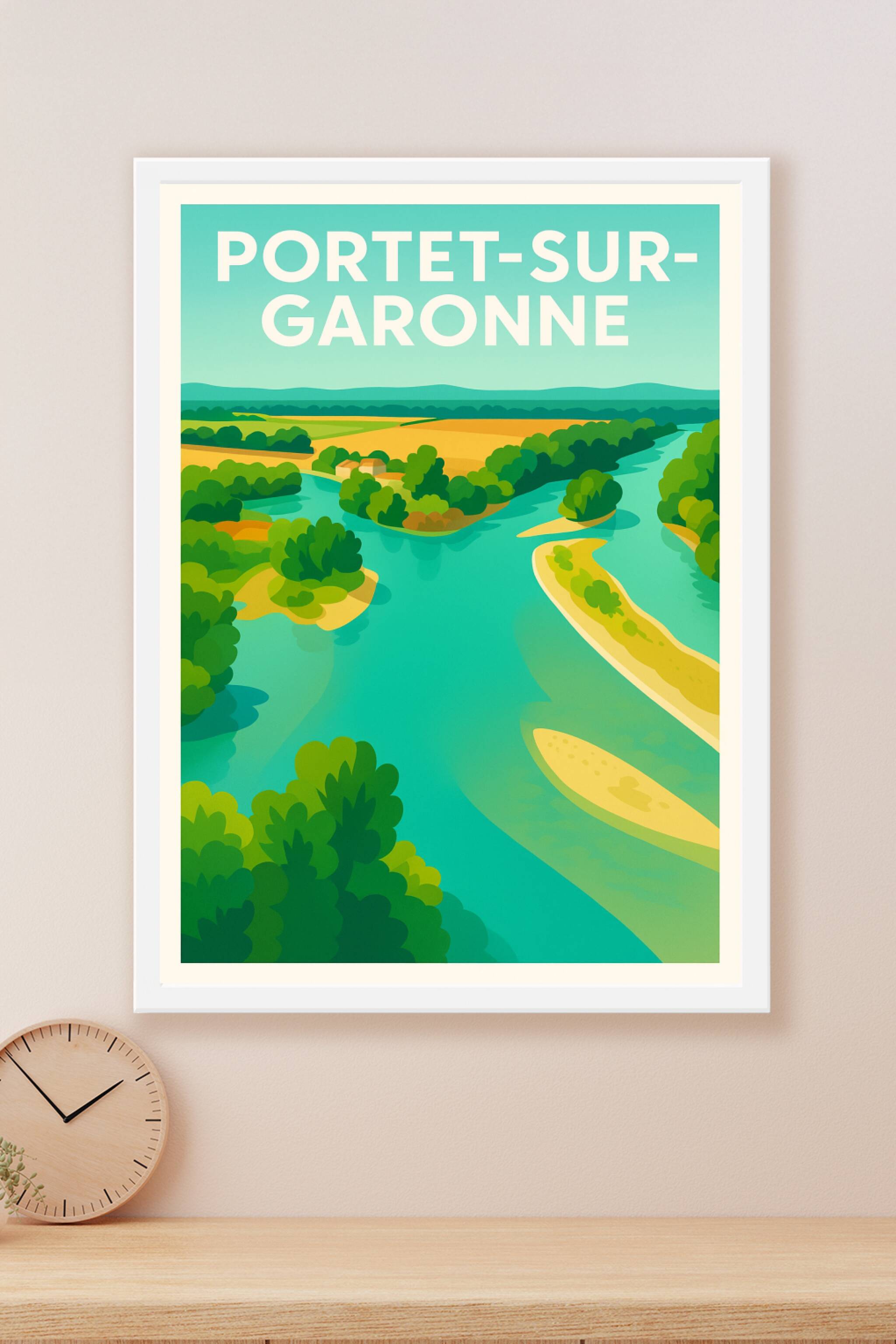 Découvrez la sérénité des paysages verdoyants de Portet-sur-Garonne avec cette affiche illustrée aux couleurs vives et apaisantes. Le poster met en...