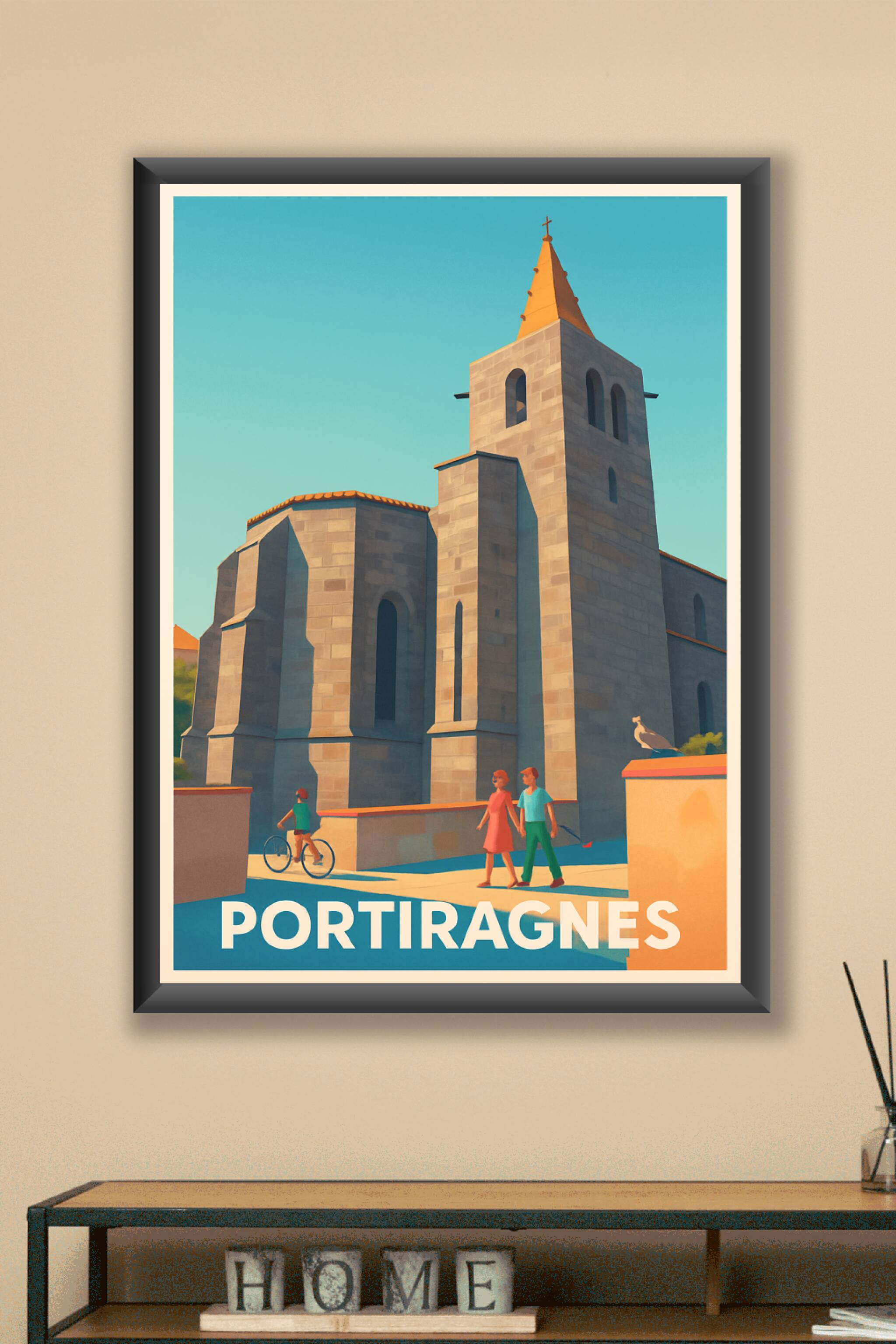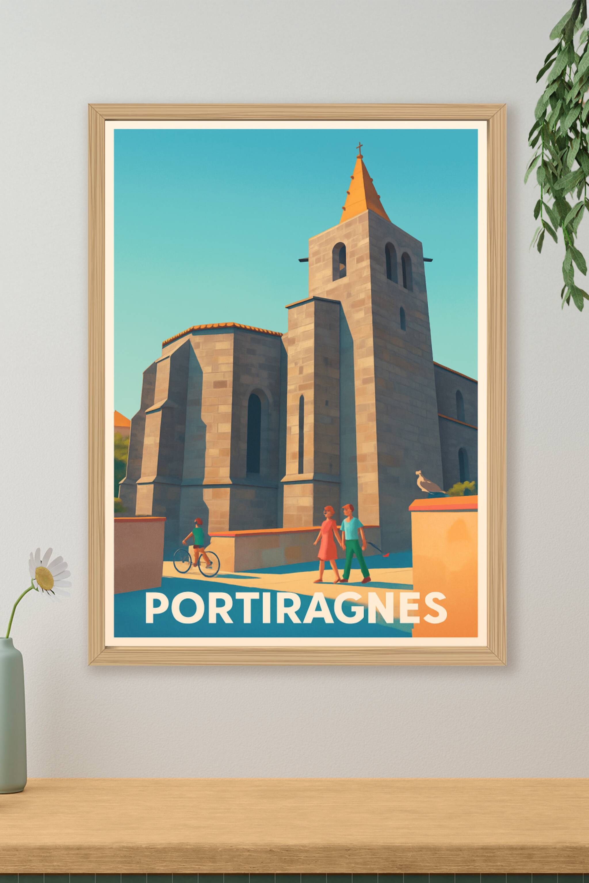 Découvrez l'élégance intemporelle de Portiragnes avec cette affiche représentant son architecture emblématique sous une lumière douce et chaleureus...
