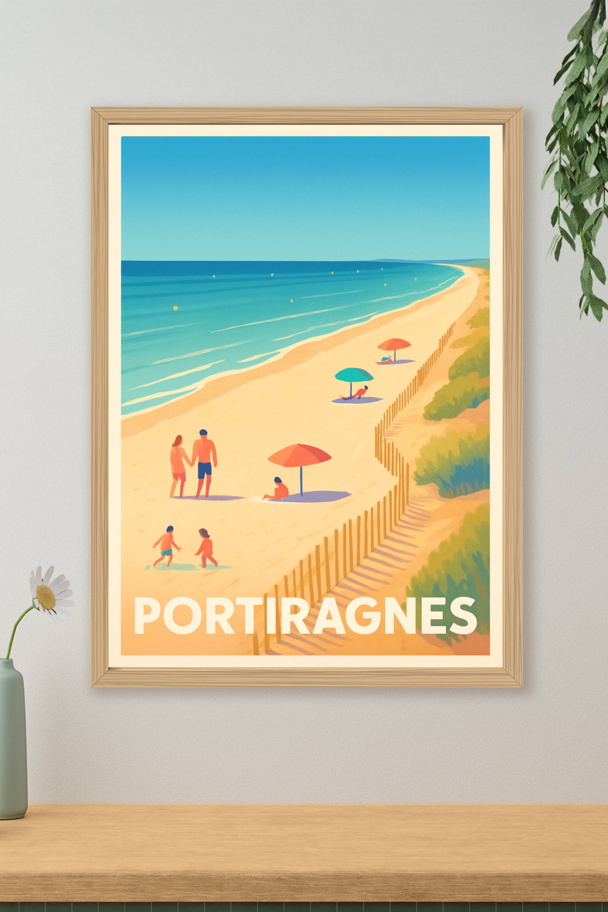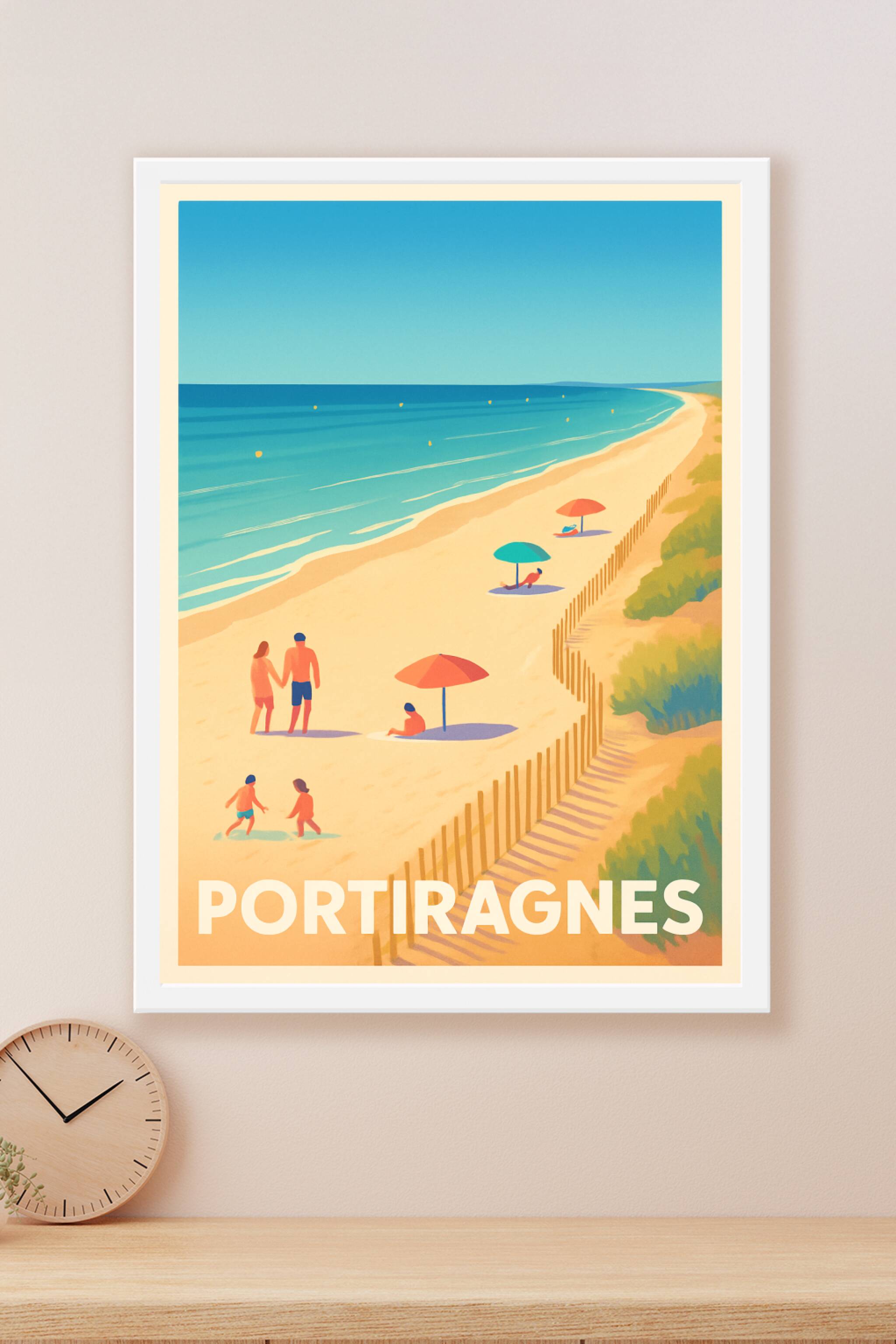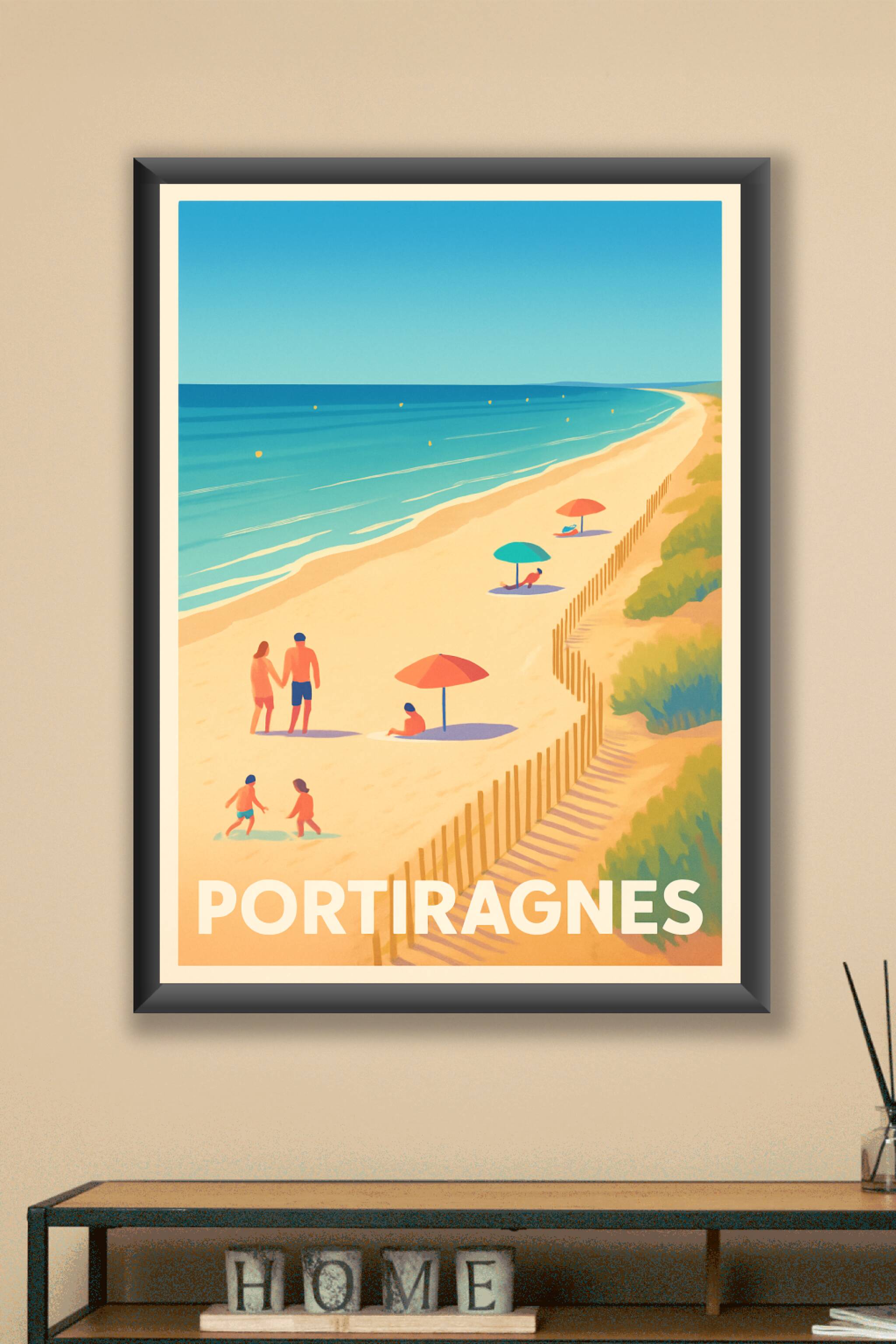 Offrez-vous une escapade visuelle sur les plages dorées de Portiragnes avec cette affiche estivale au style rétro vibrant. Ce poster représente une...