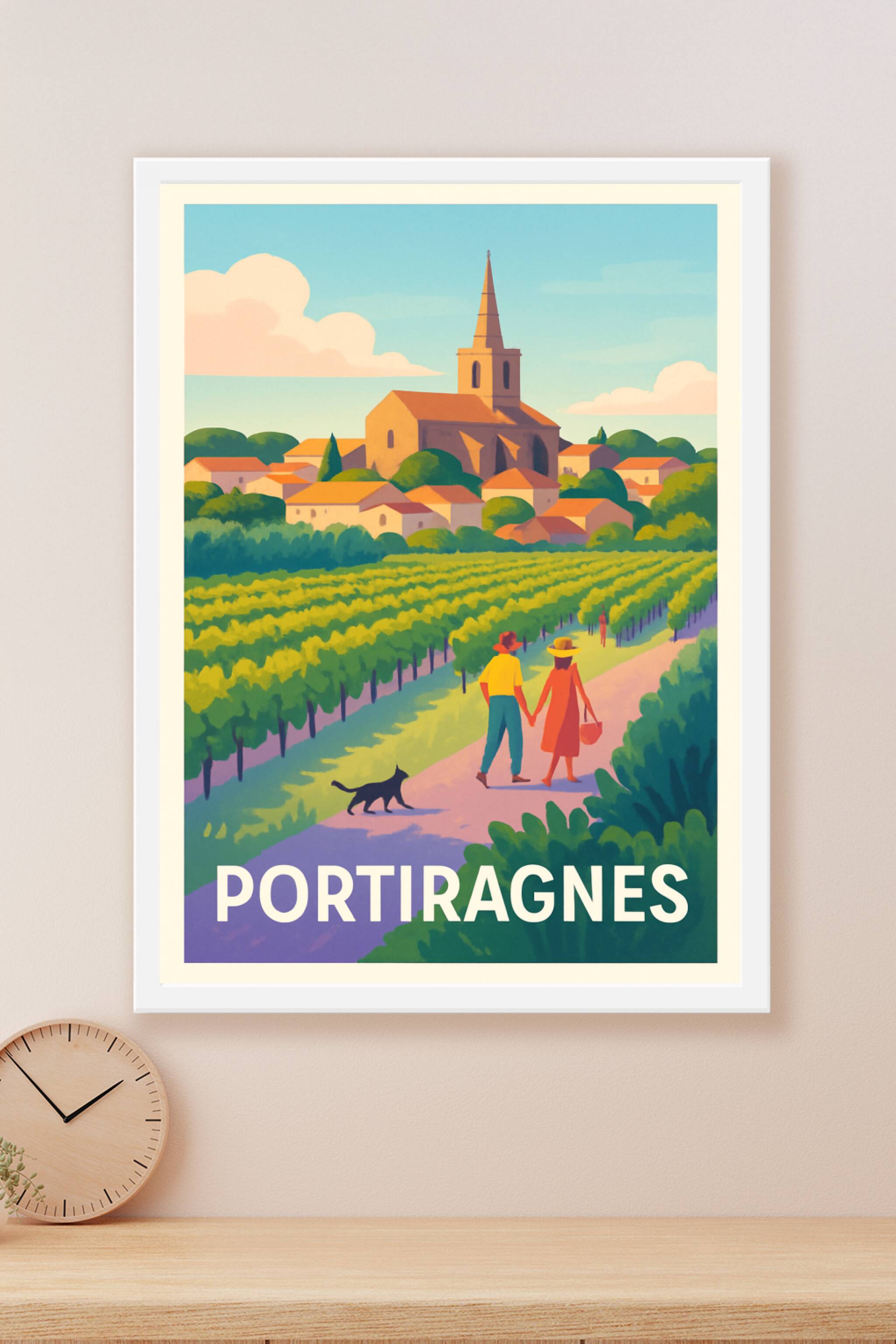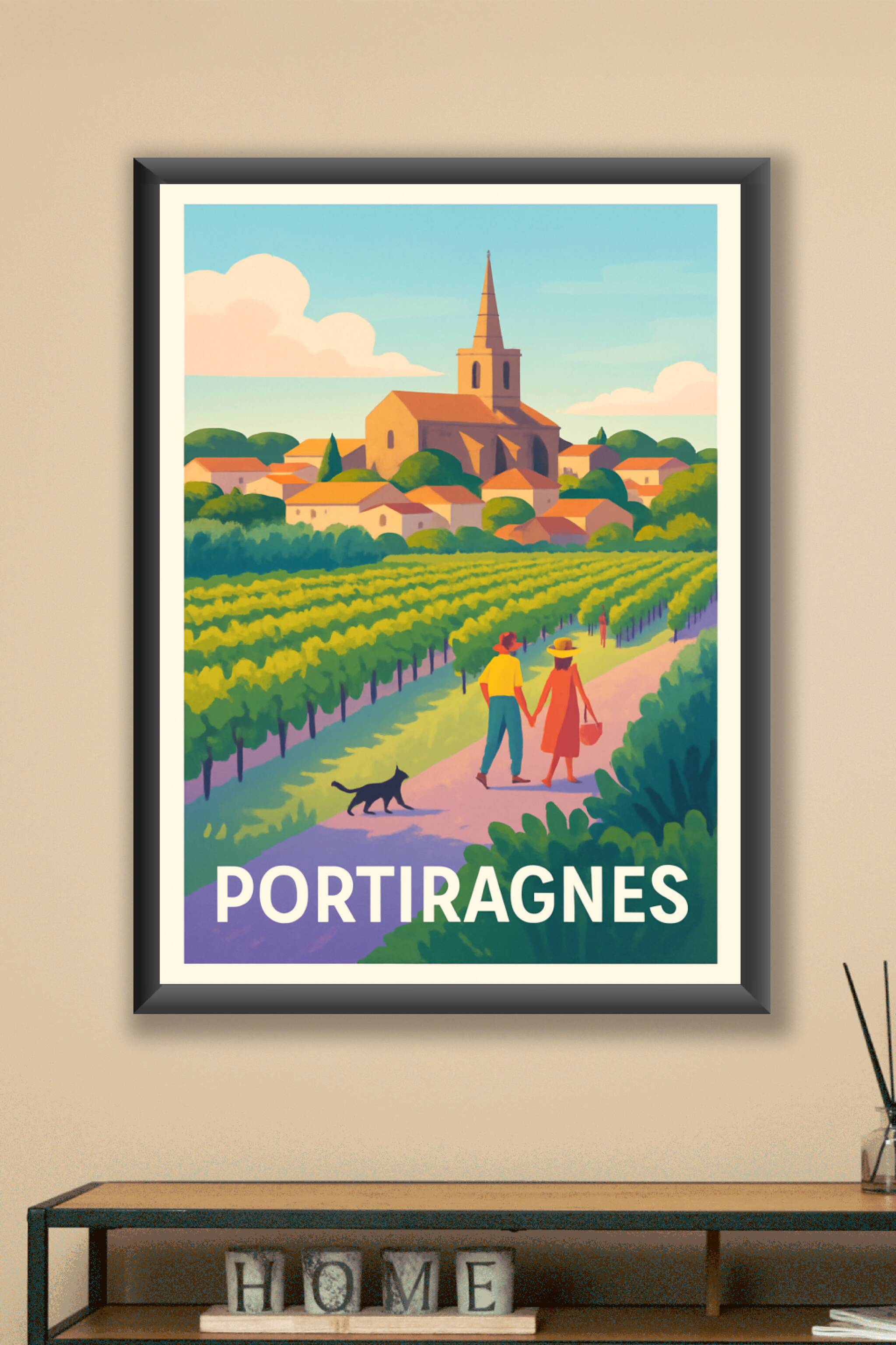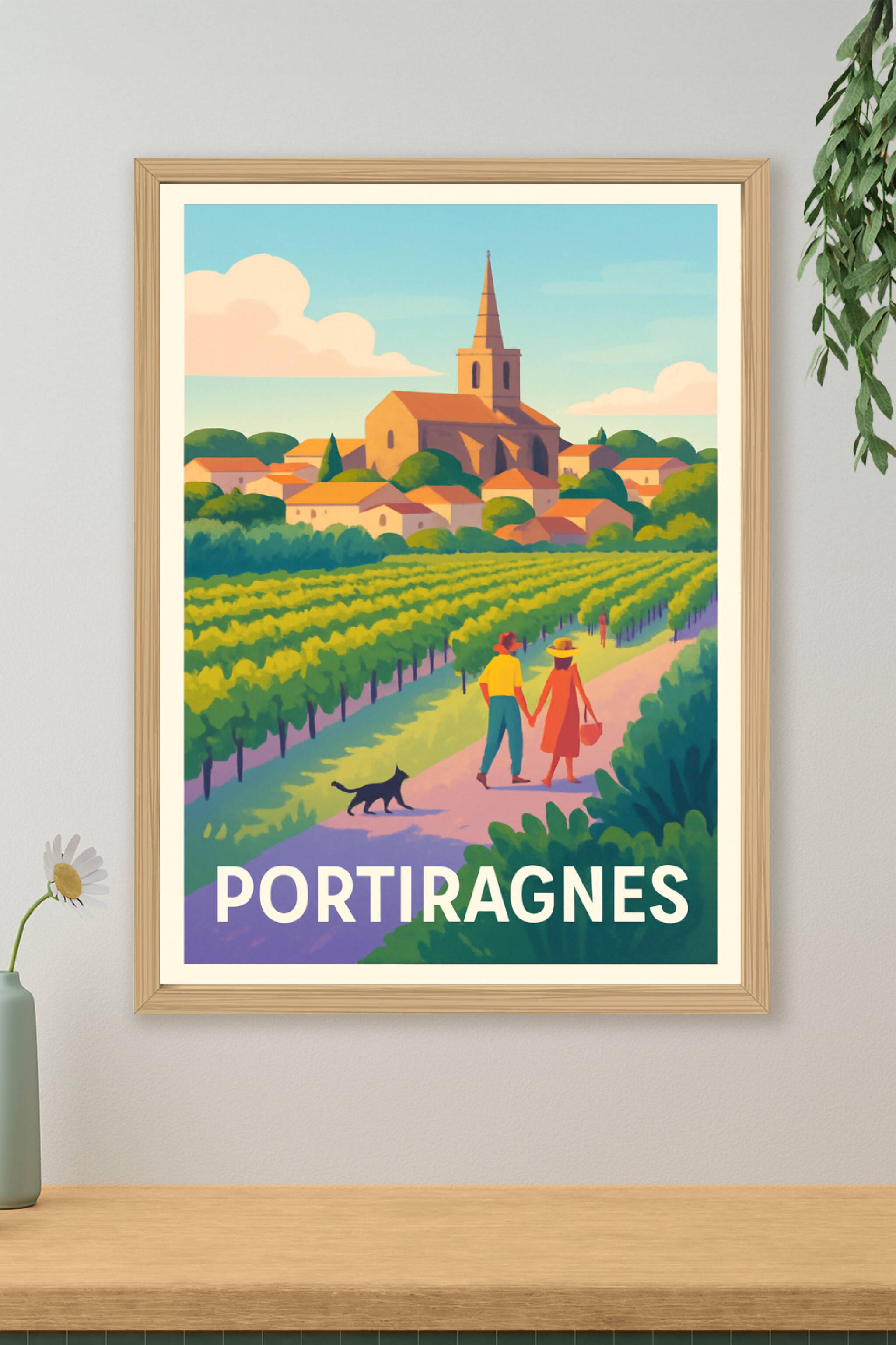 Découvrez l'atmosphère paisible et charmante de Portiragnes avec cette affiche illustrée mettant en scène une promenade romantique entre vignes et ...
