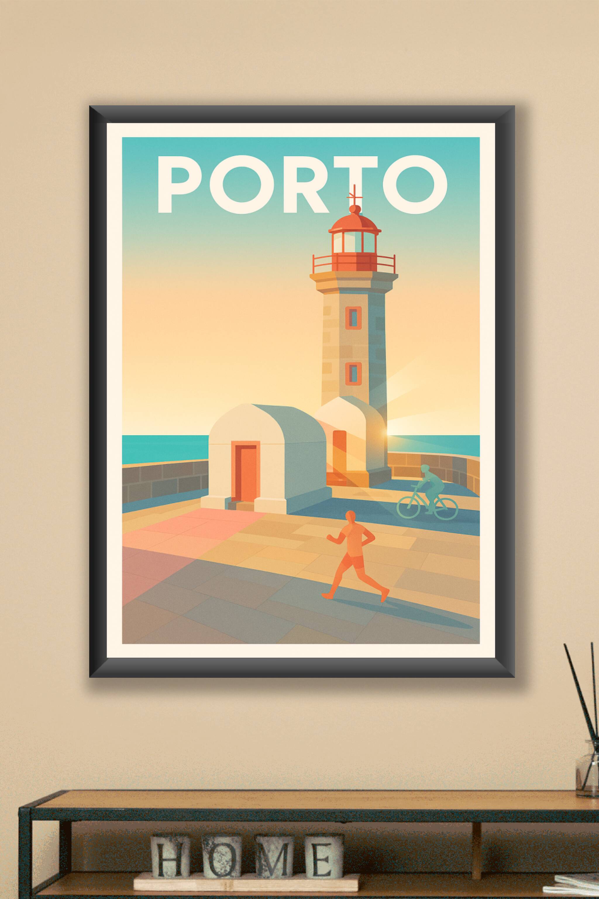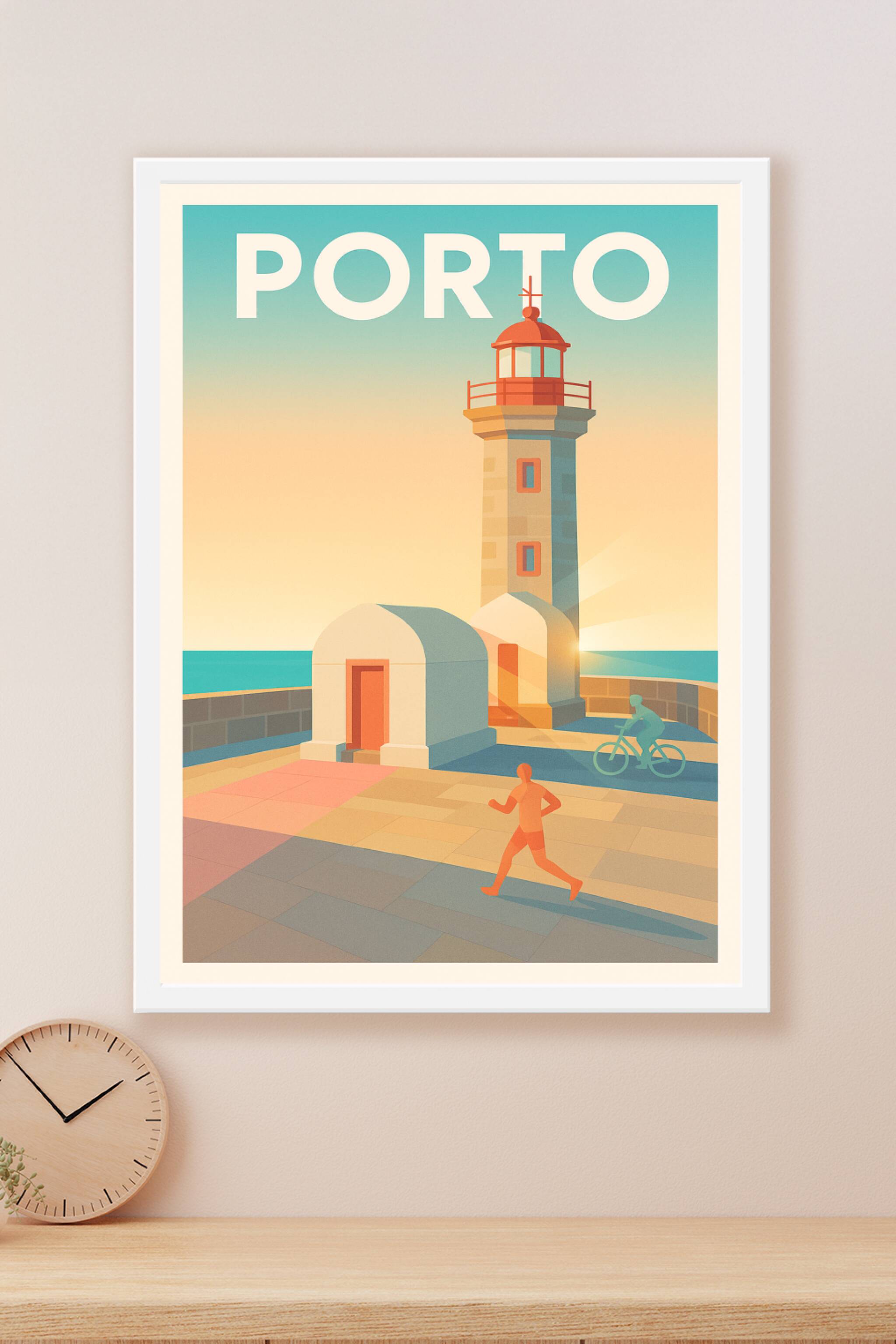 Découvrez l'atmosphère paisible et lumineuse de Porto avec cette affiche stylisée mettant en scène le phare iconique baigné par un coucher de solei...