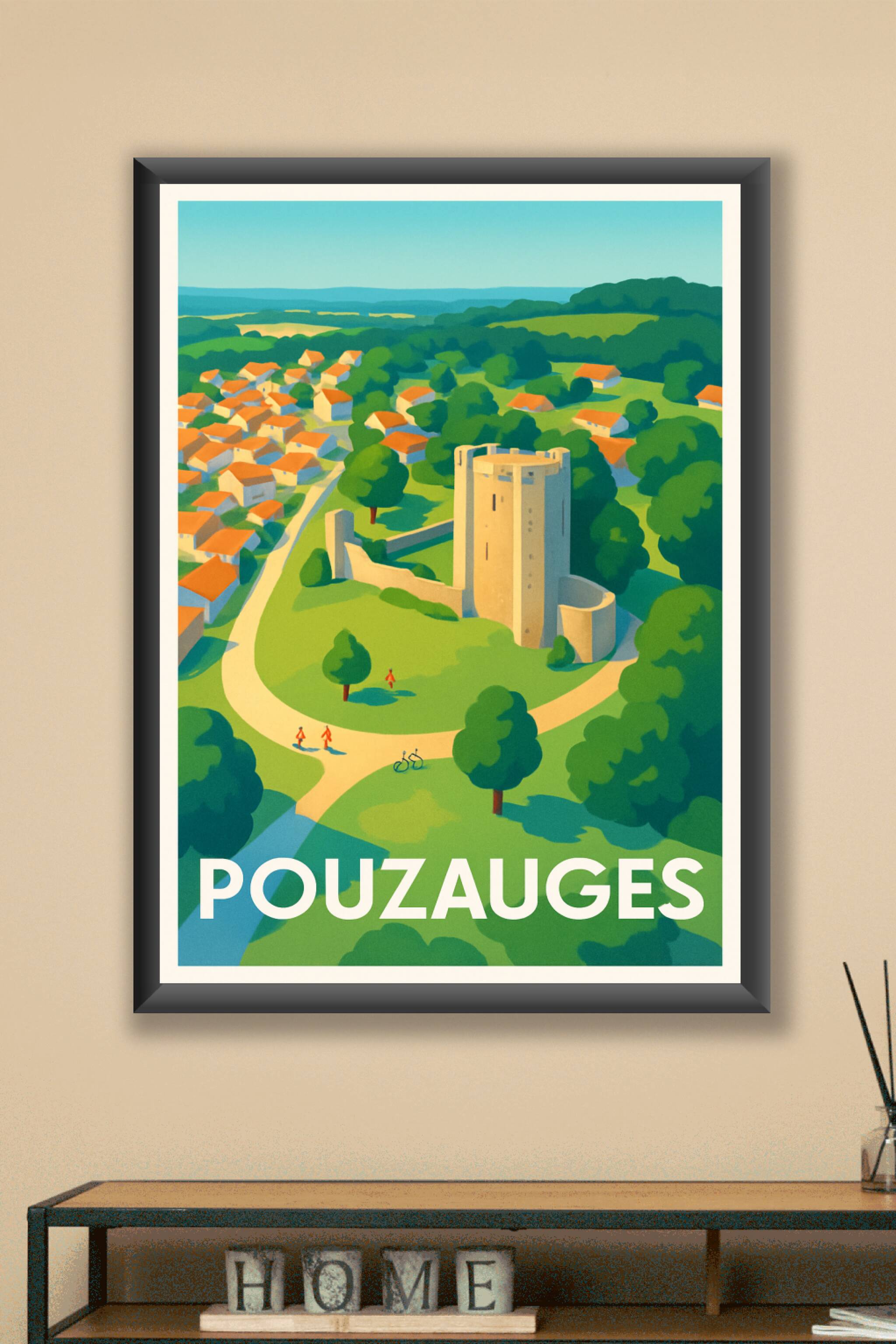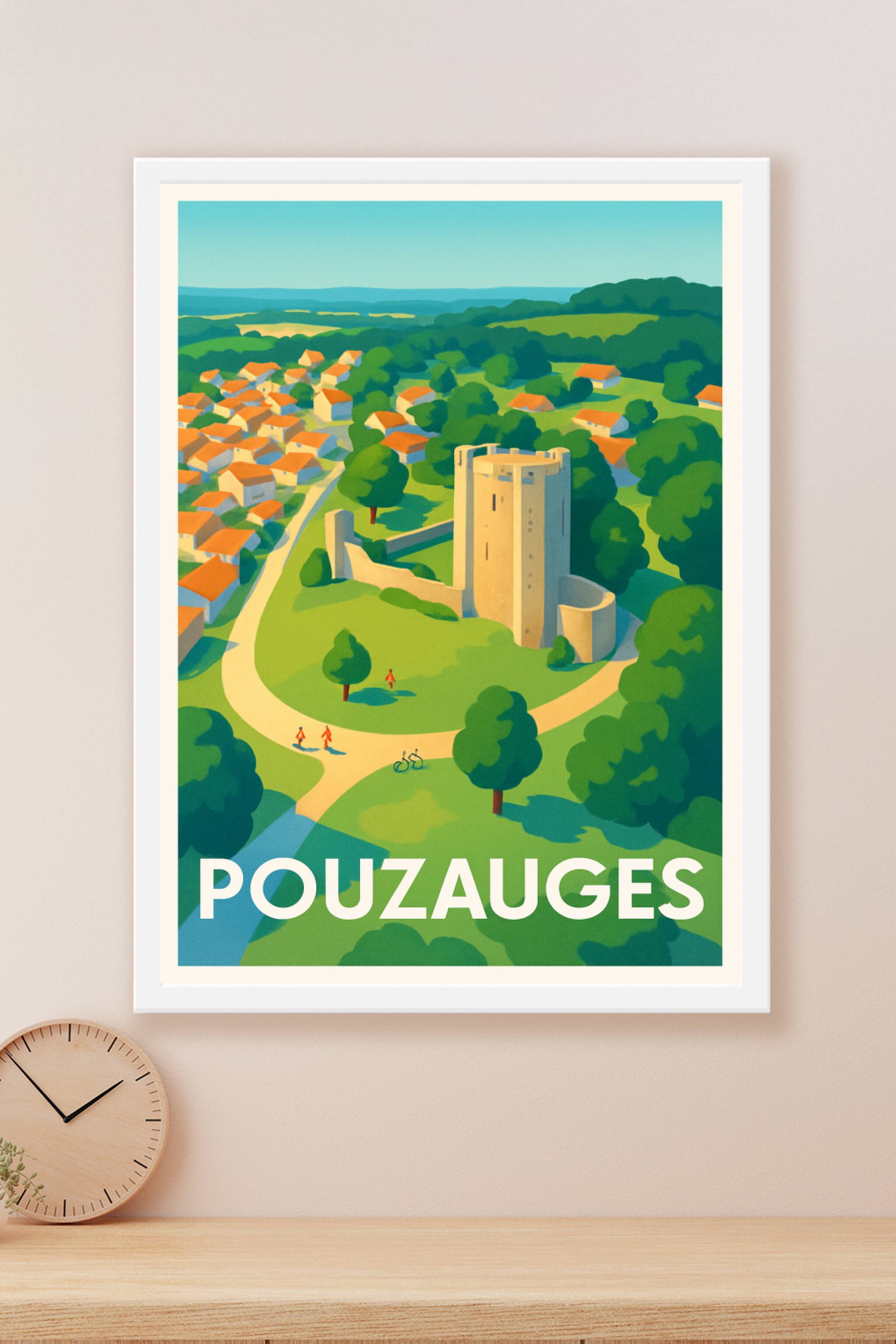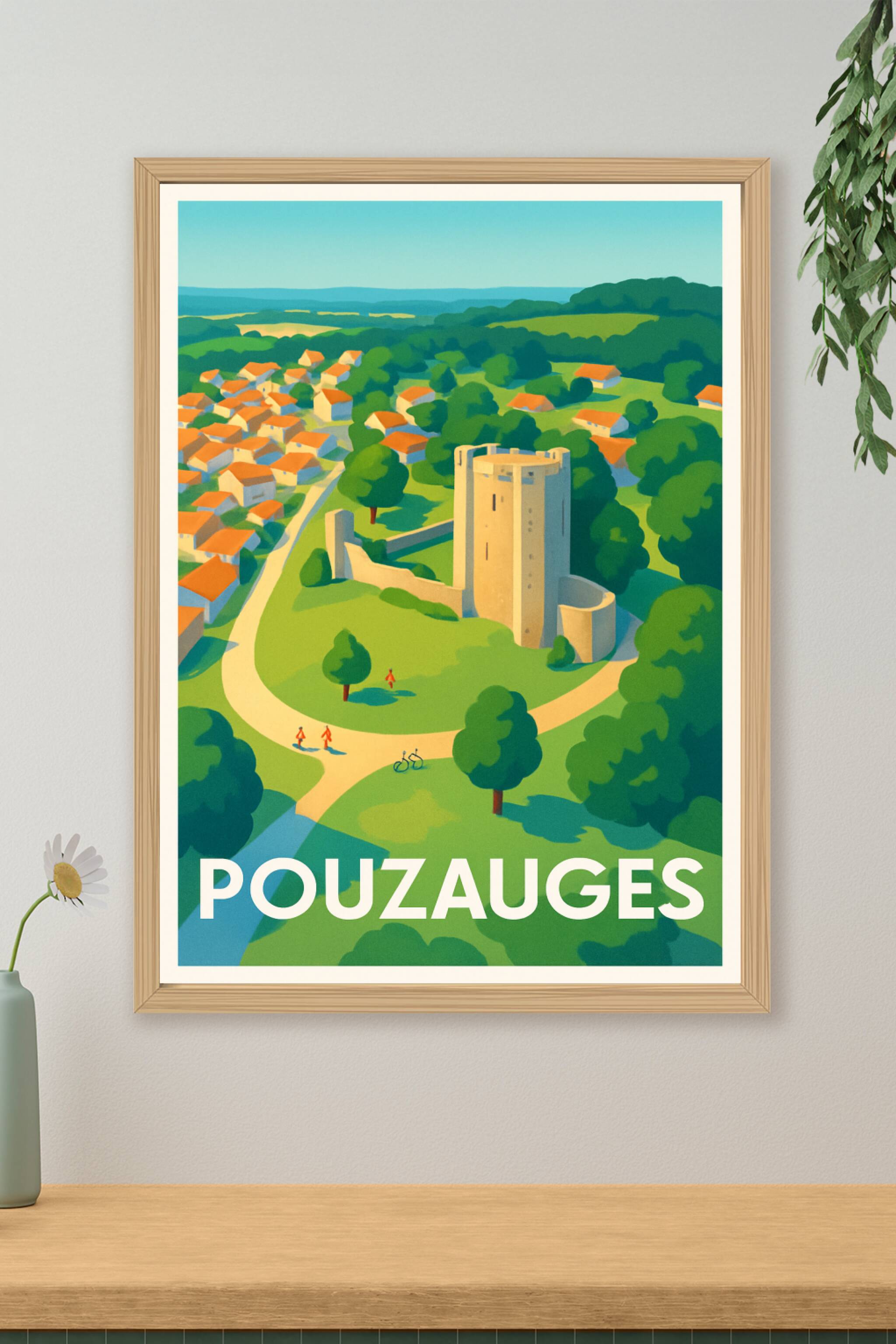 Découvrez la sérénité et le charme médiéval de Pouzauges avec cette superbe affiche représentant la célèbre forteresse entourée de verdure et de ma...
