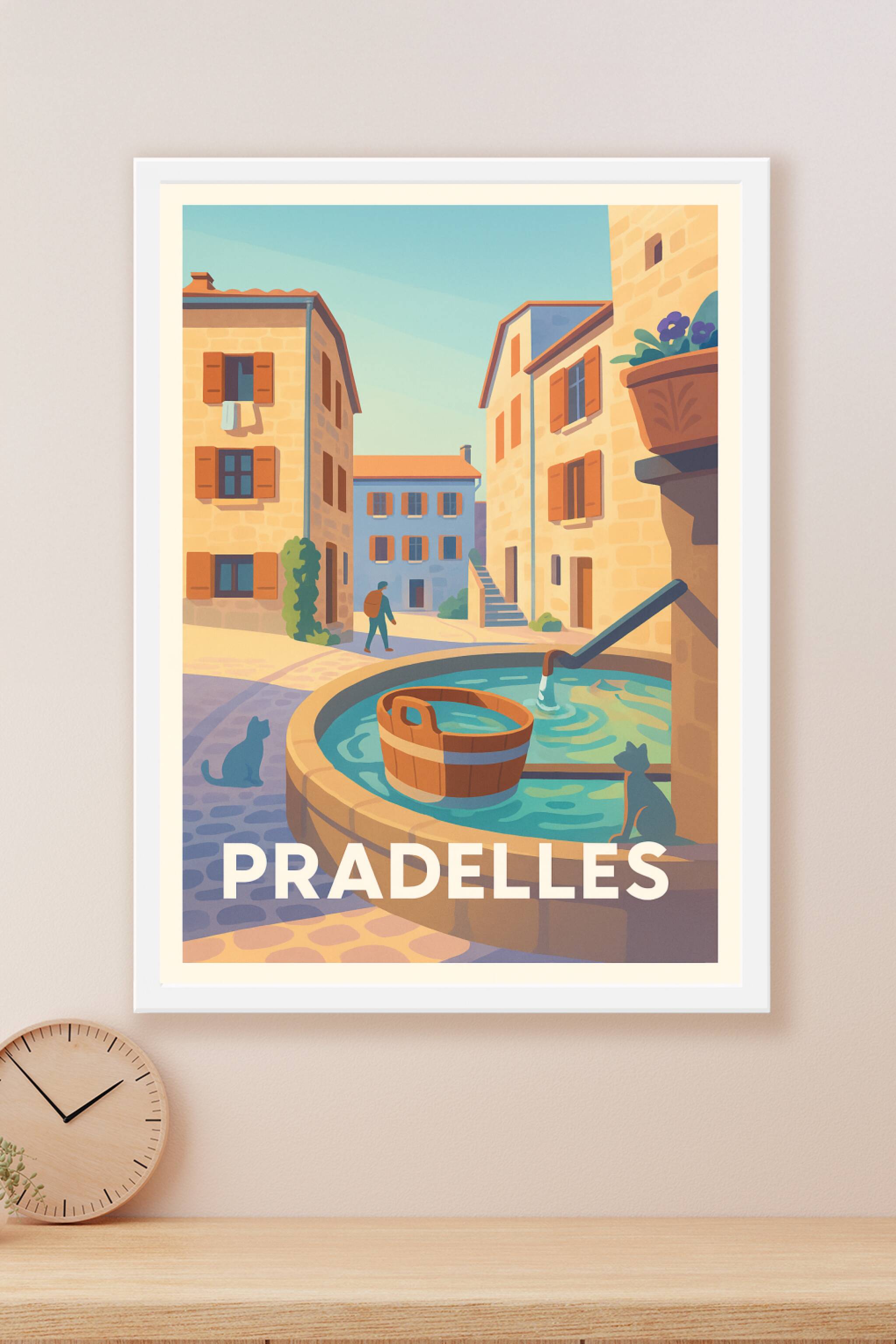 Découvrez la douceur de vivre de Pradelles avec cette affiche au style illustratif tendre et chaleureux. Ce poster met en scène une ruelle typique,...