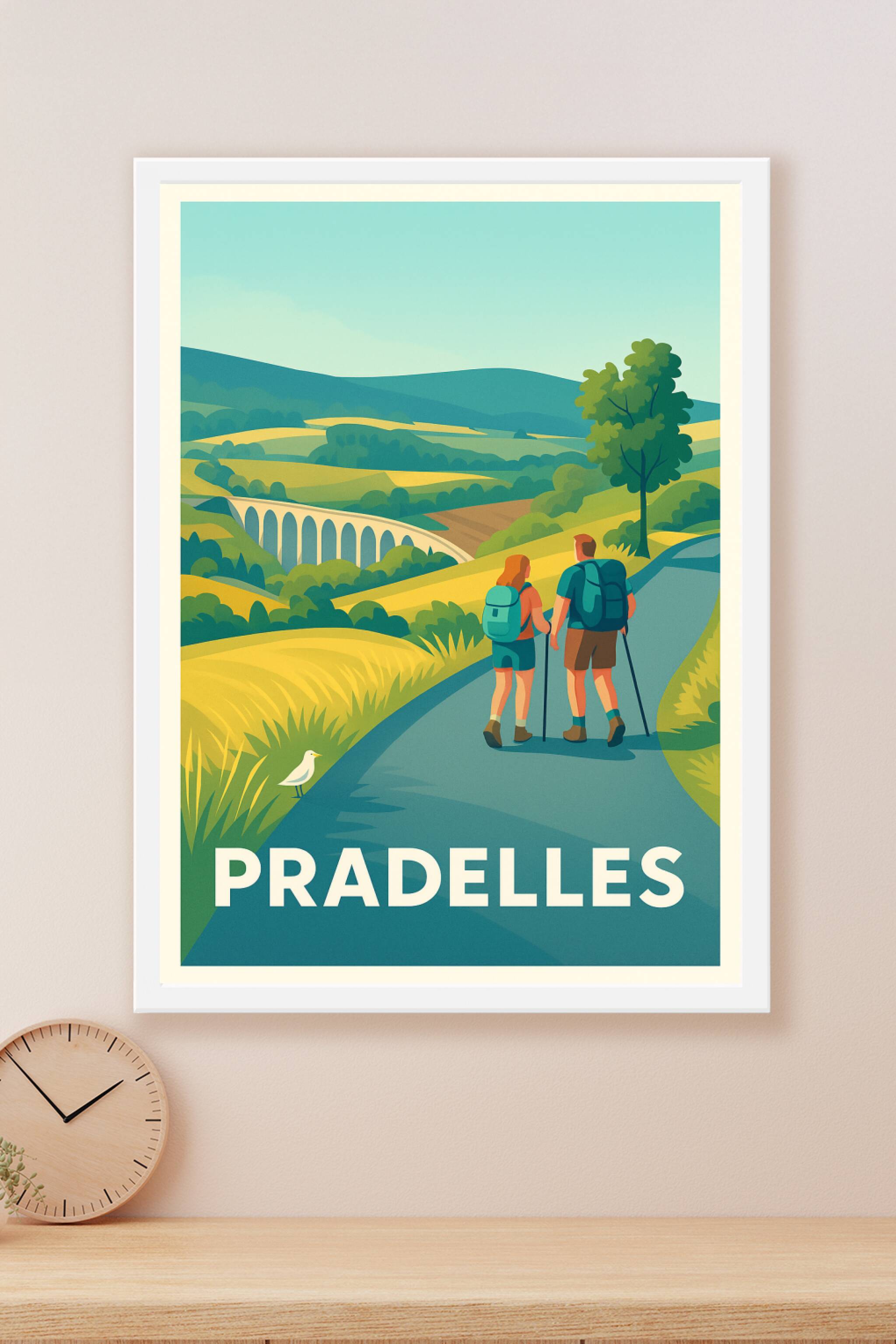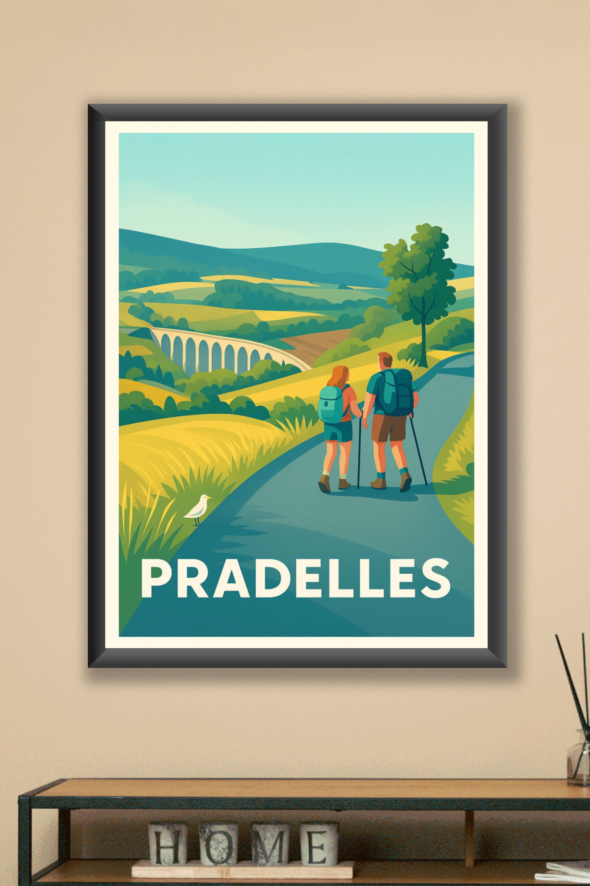 Découvrez l'évasion douce et apaisante de Pradelles avec cette affiche illustrée représentant un couple de randonneurs au cœur d'un paysage vallonn...