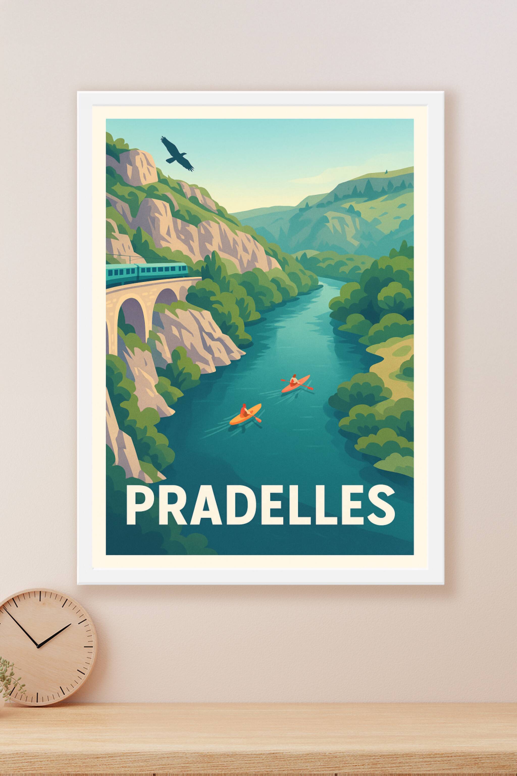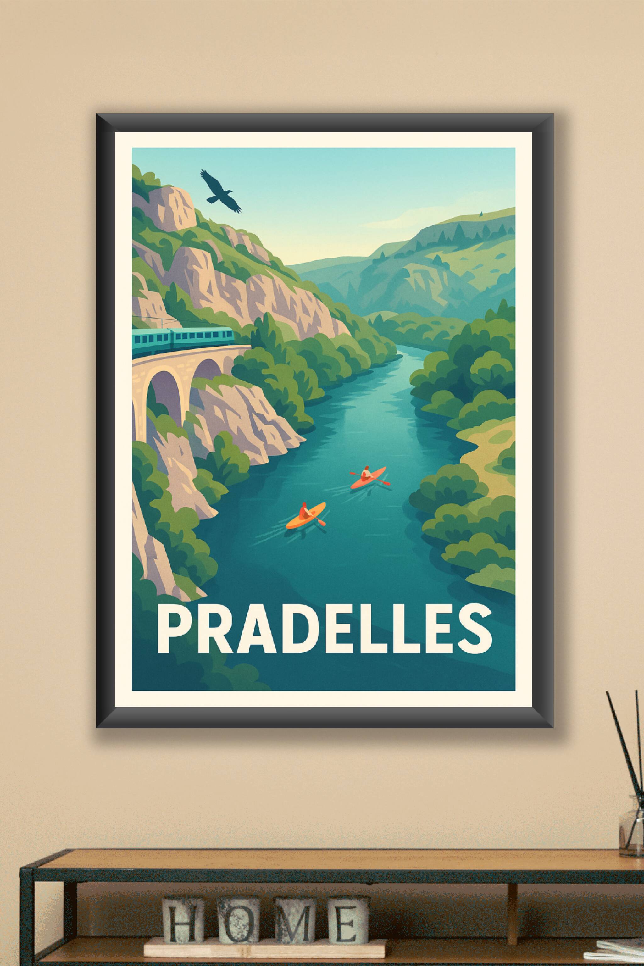 Découvrez la beauté paisible de Pradelles avec cette affiche illustrée mettant en scène une rivière sinueuse entourée de collines verdoyantes, deux kayakistes glissant sur l'eau et un train traversant un viaduc pittoresque. Ce poster apporte une touche d'évasion et de sérénité, parfaite pour décorer votre intérieur ou offrir un souvenir unique.Admirez la qualité exceptionnelle de l'impression Fine Art sur papier 305g coton, qui garantit des couleurs vives et une texture haut de gamme. Disponible en plusieurs formats, de A1 à A4, avec ou sans cadre, cette affiche se prête à toutes les ambiances et espaces. Profitez d'un tirage premium 100% fabriqué en France pour sublimer votre décoration avec ce poster emblématique de Pradelles.