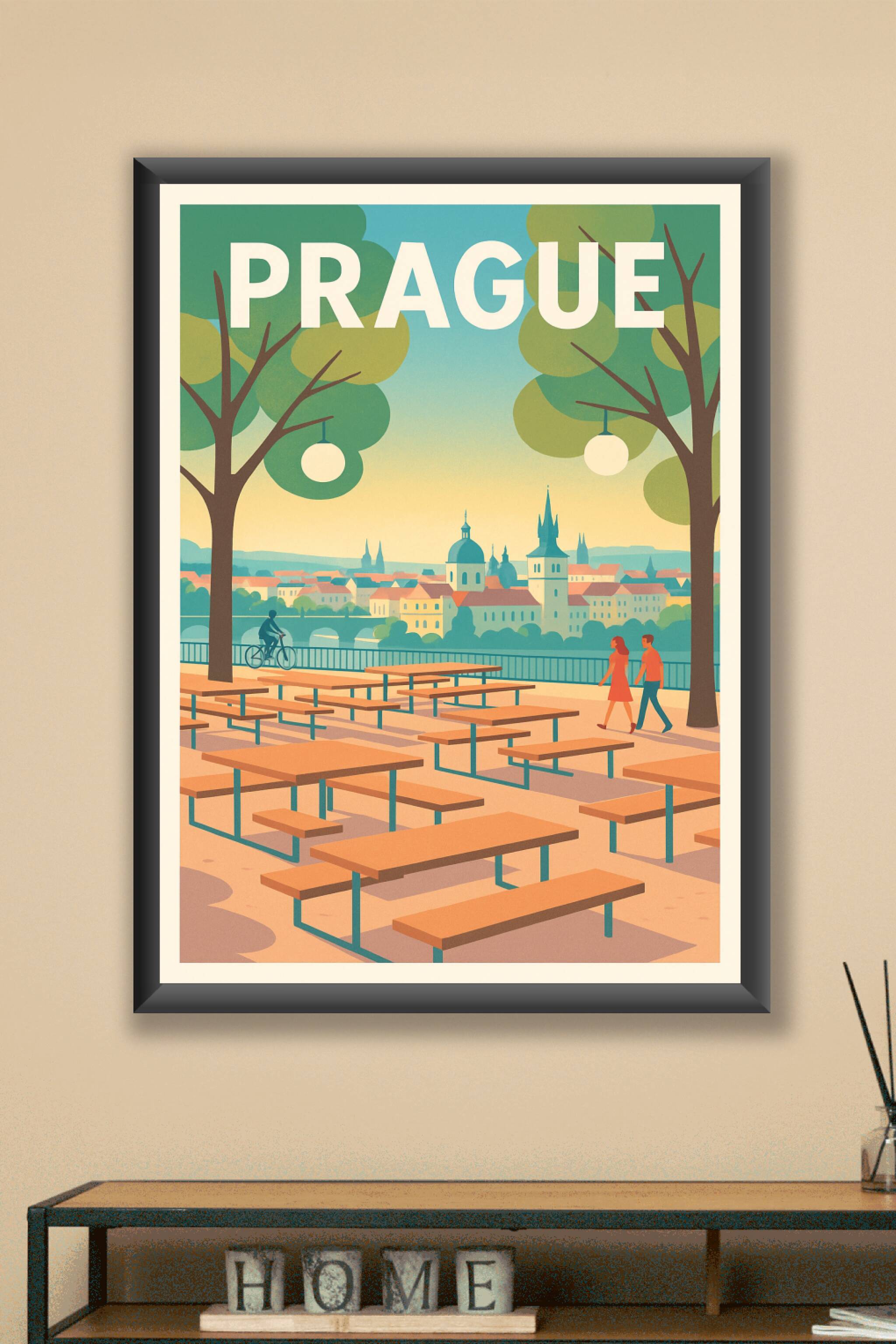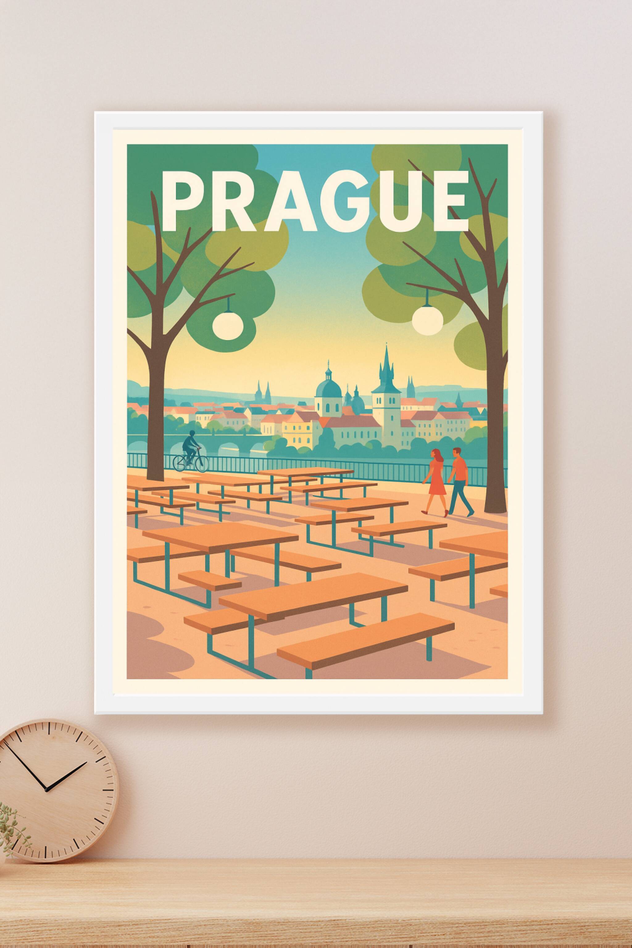 Découvrez l’atmosphère sereine de Prague avec cette affiche au style rétro moderne, dévoilant une vue emblématique sur ses toits et monuments historiques depuis une terrasse tranquille. Le poster invite à une promenade relaxante, entre la nature et l’architecture médiévale typique de la capitale tchèque.Cette affiche est imprimée en tirage "Fine Art" sur un papier de haute qualité 305g coton, assurant une reproduction fidèle des couleurs et une durabilité optimale. Disponible du format A1 à A4, avec ou sans cadre, elle s'adapte parfaitement à tous les espaces, apportant une touche élégante et intemporelle à votre décoration intérieure.Fabriquée en France avec une qualité d’impression premium, cette affiche est idéale pour les amoureux de Prague ou pour offrir un souvenir raffiné et original.
